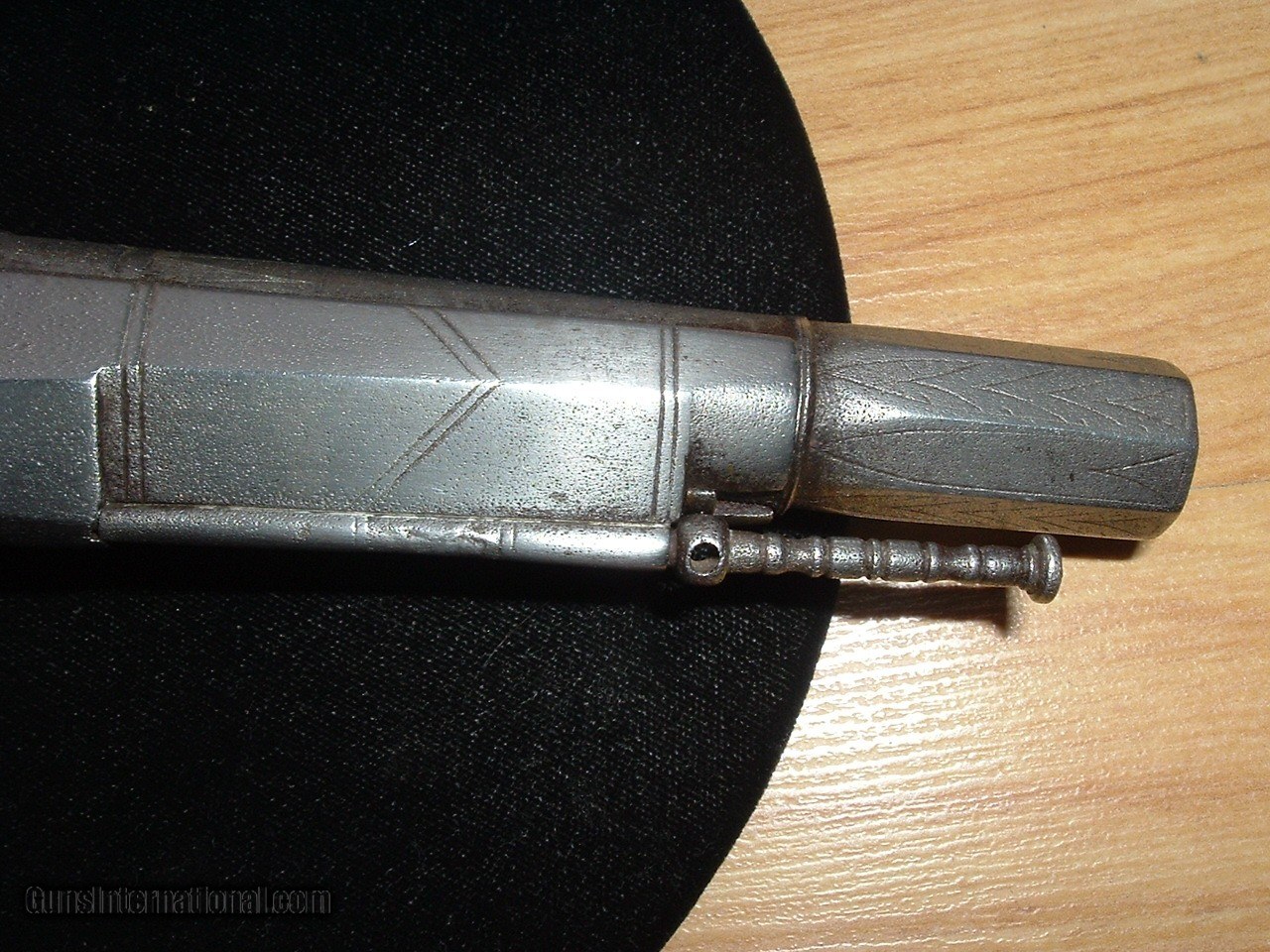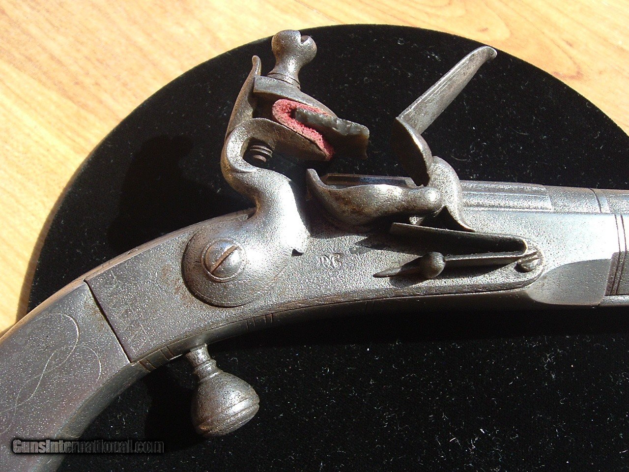 Description: Scarce early circa 1764 fine quality Revolutionary War ram's-horn butt Highlander's Scottish flintlock belt pistol. Finely contoured all steel construction with traditional ram's-horn butt, 10.5" overall length. Original screw-type vent pick with ball finial present in butt. In very fine+ condition overall. 6.5" ribbed to round to octagon barrel, lightly engraved. .55 caliber smoothbore. All original flintlock mechanism with early gooseneck hammer. Lockplate is stamped "R C" (Robert Caddell of Edinburgh, Scotland 1764 (see "British Pistols And Guns 1640 - 1840" by Ian Glendenning). Complete with its original sculpted and chiseled belt-hook on the left side. Original finely turned ramrod is present. .100% original and correct, the metal surface overall is smooth and untouched. The metal has area's of light engraving overall. The mechanics work perfectly. Traditional ball-type trigger. This is a scarce early classic firearm in the area of gun collecting. Seldom encountered on today's market, for the advanced collector. SOLD Antique: Yes |