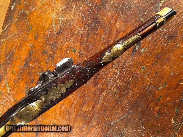 Description: *SALE PENDING* Beautiful French & Indian War Era Sebastian Jobst, Linz, Austria, Flintlock Officer's Pistol, .50 cal smoothbore, mfg. circa 1740. This is a stunning Austrian officer's pistol which has miraculously survived in outstanding condition with all original components. It is an excellent representation of the type carried by officers during the French & Indian War, or The Seven Years Was as it was called in Europe. The pistol measures 14 7/8" long overall and features a 9 3/8" part octagon/part round barrel fitted with a brass blade front sight and sighted breech. An inlaid silver cartouche atop the breech is marked "S.I / I.T / A.V" with "IOBST-A-LINZ" inscribed on the lock. A numeral resembling "2" is inscribed on the barrel tang which may suggest this was once one of a pair. The gun is nicely engraved throughout and the metal has a bright smooth silver/gray appearance. The stock features elaborate relief carving around the lock, barrel tang, triggerguard, and ramrod channel and remains untouched with an attractively worn dark patina. Aside from just a typical 1/4" crack ahead of the rear lock screw the wood remains in great condition with no cracks, chips, or repairs whatsoever. Engraved brass buttcap, wrist escutcheon, sideplate, triggerguard, and ramrod pipes all have a mellow toned mustard color. Original screws, forged rat-tail trigger, horn forend cap, and horn tipped wood ramrod. The lock remains in it's original unaltered form with all original components. The action is incredibly crisp and functions flawlessly as if new, just perfect. Likewise the frizzen securely snaps shut and springs forward. This is a real "show stopper" piece that will make a choice addition to any collection! Jeremiah Johnson Trading sells antique firearms manufactured prior to 1899 and muzzleloading blackpowder reproductions only. For the purpose of these conditions the term "antique firearm" will hence include muzzleloading blackpowder reproductions. Buyers must be 21 years of age or older and have no felony convictions to purchase antique firearms. Antique firearms do not require Federal licensing and may be shipped directly to the buyer with the following exceptions. No antique firearms will be shipped to Washington D. C. or any of the five boroughs of New York City (or residents thereof). Some restrictions may apply to antique firearms shipped to California and will be noted in the item description if applicable. Any handgun (antique or muzzleloading blackpowder reproduction) shipped to New Jersey must ship to a licensed FFL holder. Any muzzleloading blackpowder reproduction rifle, shotgun, or handgun shipped to Illinois must ship to an FFL holder. No international sales of antique firearms which may fire conventional metallic cartridges or any reproductions regardless of ignition. Antique muzzleloaders, or antiques which fire obsolete cartridges, may be shipped internationally however it is the responsibility of the buyer to know and abide by their local laws and provide proof that the antique arm is legal to receive and own. Payment can be made by money order, banker's check, personal check, or credit card (no fees). Please allow 7-10 business days for clearance on personal checks. If paying by credit card please call us directly to process your order. If not satisfied with an item within 3 days of receiving it, simply return the item in the same condition as shipped for a full refund, minus return shipping costs. Cleaning, disassembly, or altering of a firearm in any way will void inspection privileges. Layaway may be allowed upon negotiation, but will void inspection privileges. Buyer pays actual shipping & insurance costs. Occasionally a post-1898 firearm from my personal collection may be sold under this account however it will be noted that any such transaction is a personal sale in no way affiliated with our business. Any such arm will be shipped to a licensed FFL or C&R holder in accordance with Federal law. All firearms are sold as collector's items and are not warranted safe for shooting. Please consult a competent gunsmith prior to shooting any firearm. Message or call with any questions about this firearm, or any of our other items at 860-873-1092 (office) or 860-345-2100 (shop). SOLD Antique: Yes Manufacturer: Sebastian Jobst Barrel Length: 9 3/8 Bore: .50 Cal Manufacture Date: Circa 1740 Engraving: Yes |