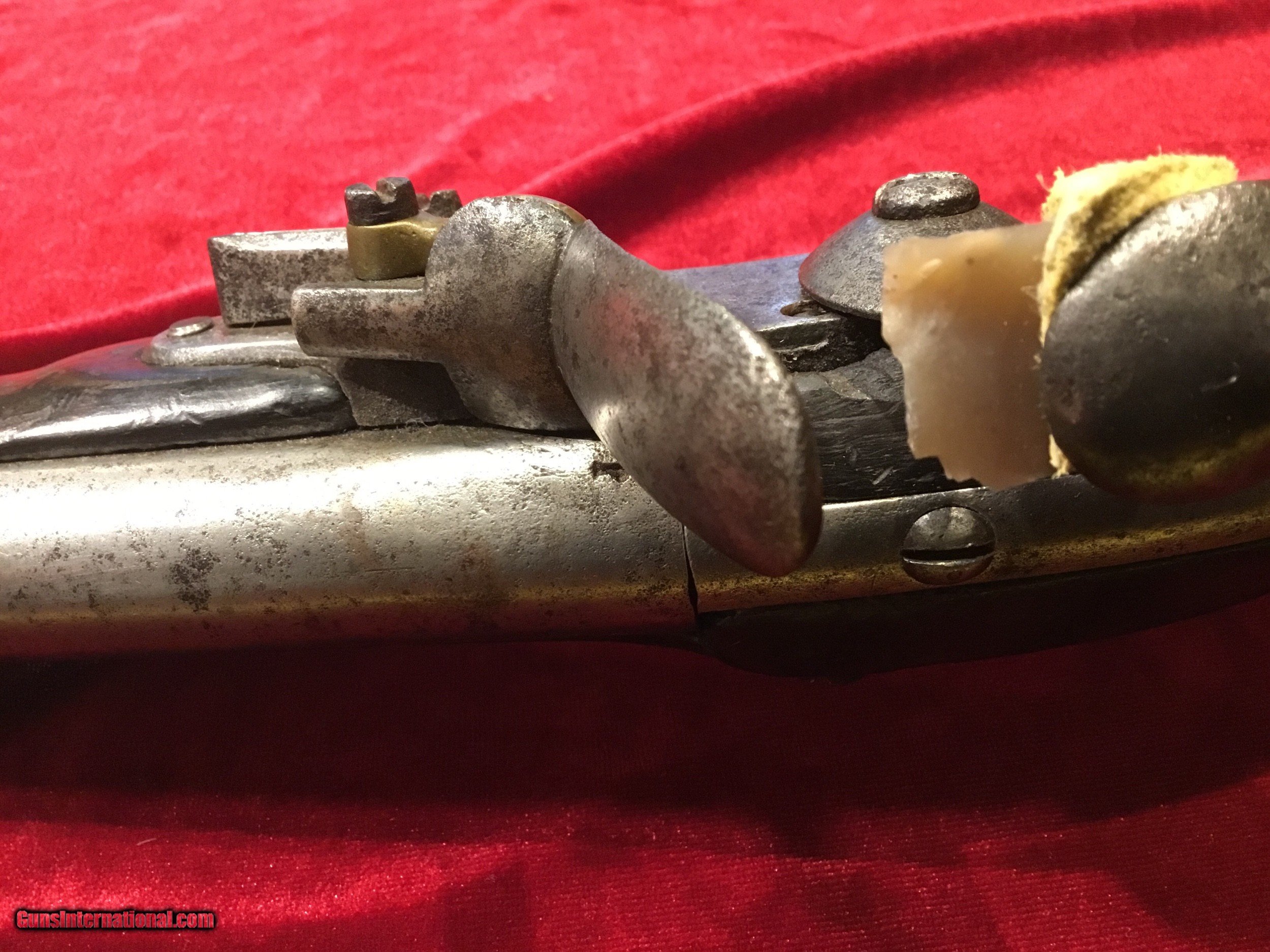 Description: Simeon North was called “the father of American miltary pistols.” This is a US Model 1816 Flintlock pistol, US miltary marked with a “ US.” Also marked with a“ P “ for a proof mark, and a “J “ stamped that the pistol was mustered out of miltary service. In 1813, Connecticut gunmaker Simeon North was contracted by the U.S. government to supply a beefy .69-cal. pistol. He made a hefty double-strapped iron front band (all the gun’s furniture was iron). The black walnut stock incorporated a reinforcing band up the spine of the stock, from the grip cap to the barrel tang. The flashpan was brass and the ramrod was hickory. North had made 1,626 of the guns when, in 1816, the military decided on some changes. The caliber was to be reduced to .54, and a brass front sight blade was added to the top of the barrel band. Unlike the 1813, a portion of the stock extended forward of the band. The lock was casehardened, and the barrel and mountings were browned. All the brown is gone on this example. This one has a front sight with a brass blade, but most of the other marks have been corroded away because of black powder use. But you can see an “ S “and an “ N “and a very faint eagle. This beefy pistol still has a great old growth black walnut stock. These pistols were so well made and tough, that they were used in the early days of the American Civil War, a large number were converted into percussion...So flintlock are rare. call or e-mail us if you have any questions. No international shipping. Also shipping and handling will be determined at the date of sale. If you happen to be near Fort Collins, Colorado, stop in and visit. There’s a lot to see! SOLD Antique: Yes Manufacturer: Simeon North, Connecticut Model: M-1816 flintlock pistol Serial Number: NA Caliber Info: .54 Condition: Good. Metal Condition: Fair Wood Condition: Good |