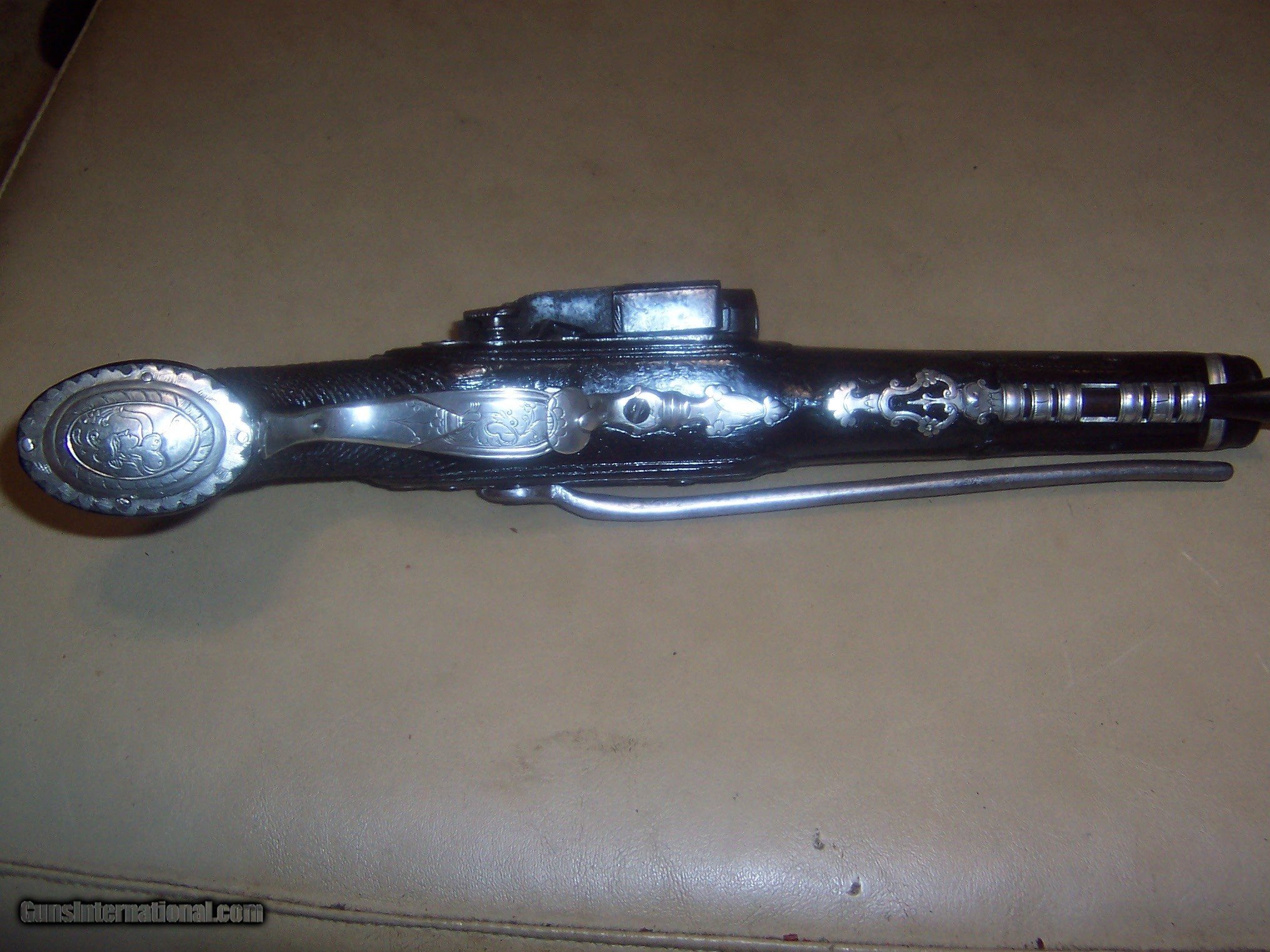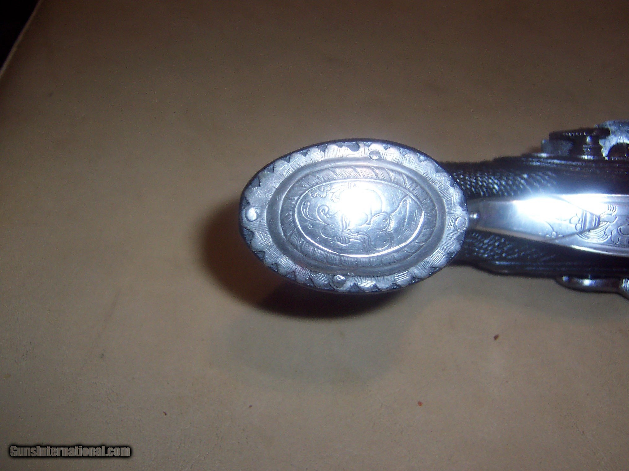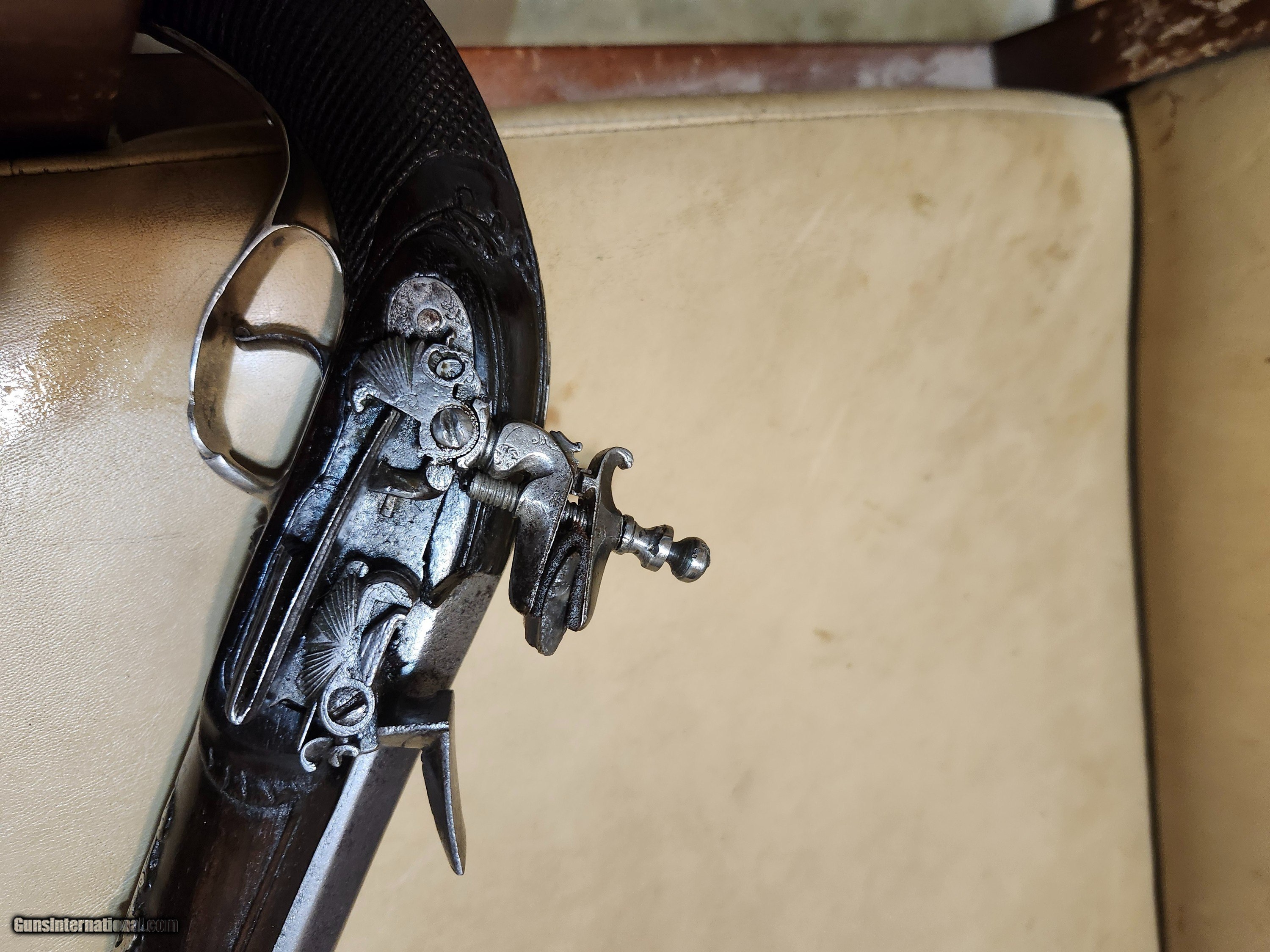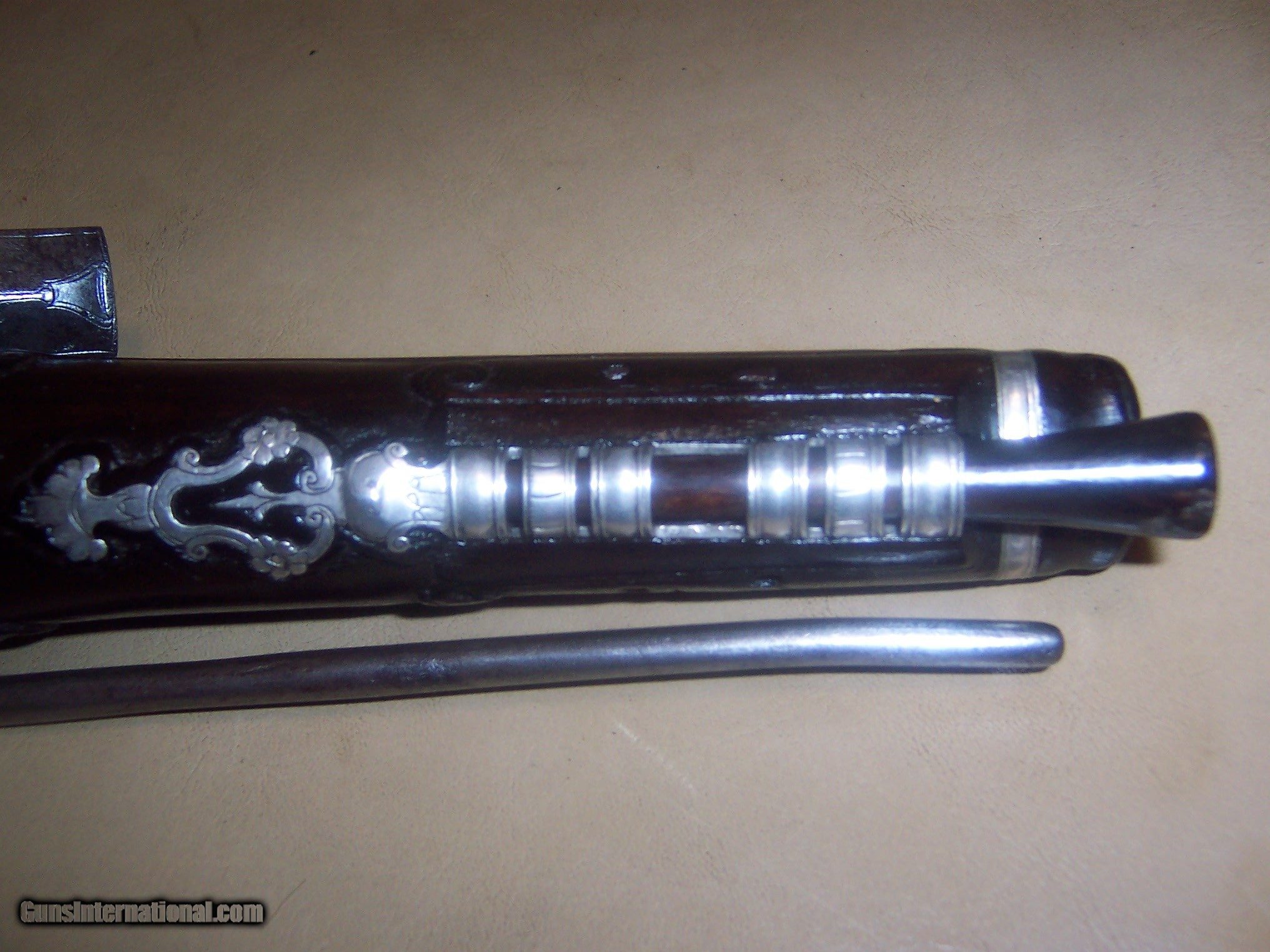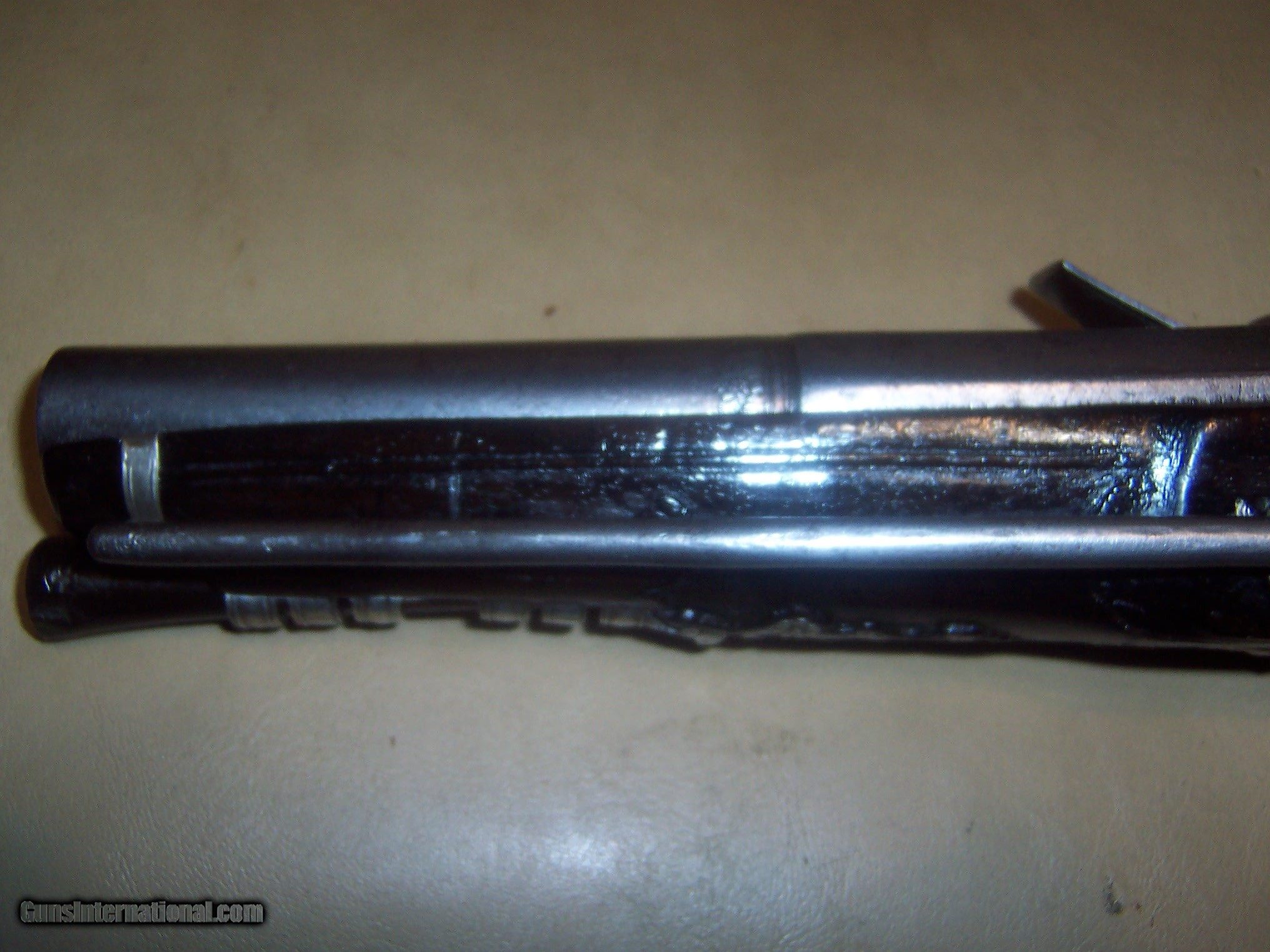 Description: 7 inch barrel//12 inches oa / pistol for upper class gentleman minor royal // works fine in dry fire / this has strong main spring //// age of pistol is unknown to me but has a gold inlayed makers stamp it reads Eiabr in square/ has a little risque moman engraving on butt cap //$60 sh ins $80 to ny , ak, ha looks like original horn tipped ramrod// bore looks vg see picture / i have never seen this before // the hammer top jaw with a removable pin in back of jaw that prevents top jaw from moving to the side Miquelet lock is a modern term used by collectors and curators for a type of firing mechanism used in muskets and pistols. It is a distinctive form of snaplock, originally as a flint-against-steel ignition form, once prevalent in the Spanish, Portuguese, and Ottoman empires, Italy, North Africa, and the Balkans from the late 16th to the mid-19th century. SOLD Antique: Yes Manufacturer: spanish Model: miquelet |