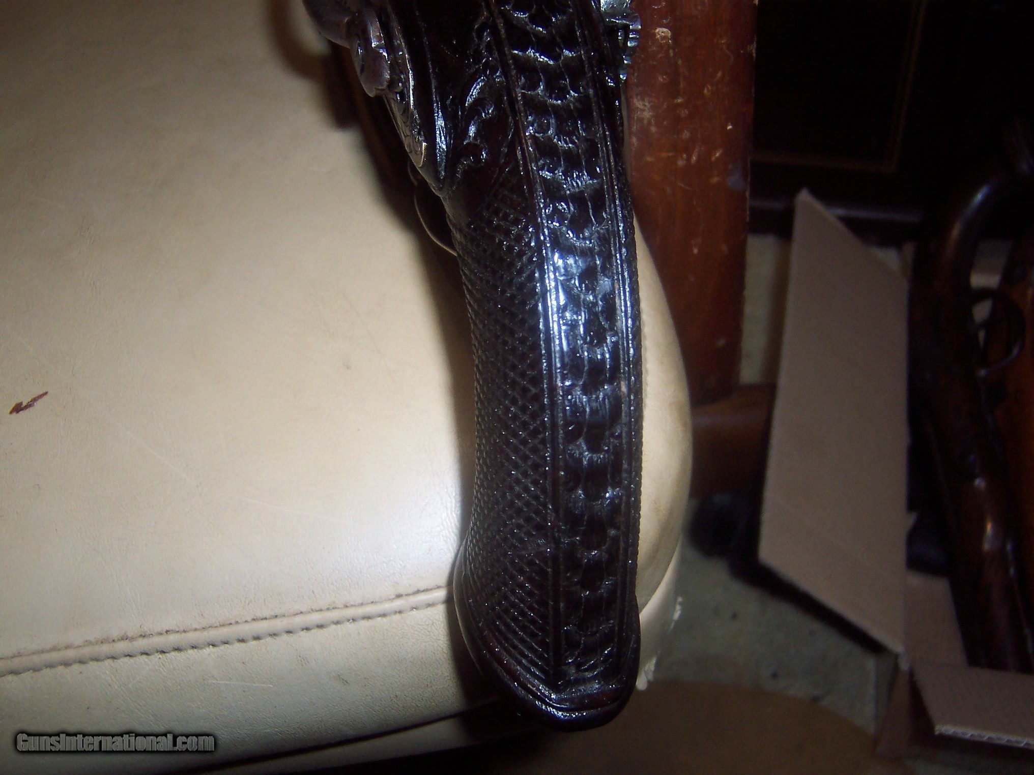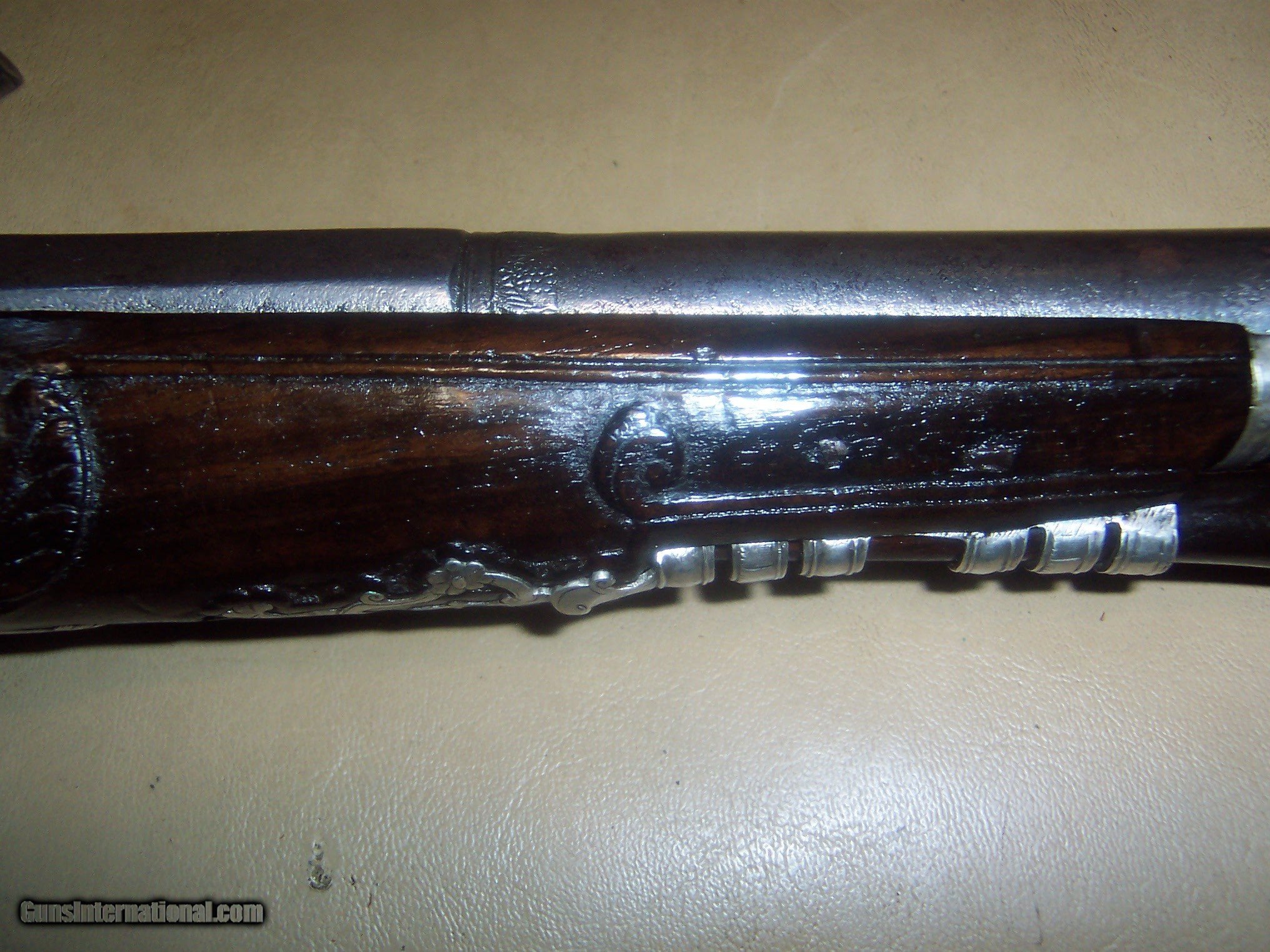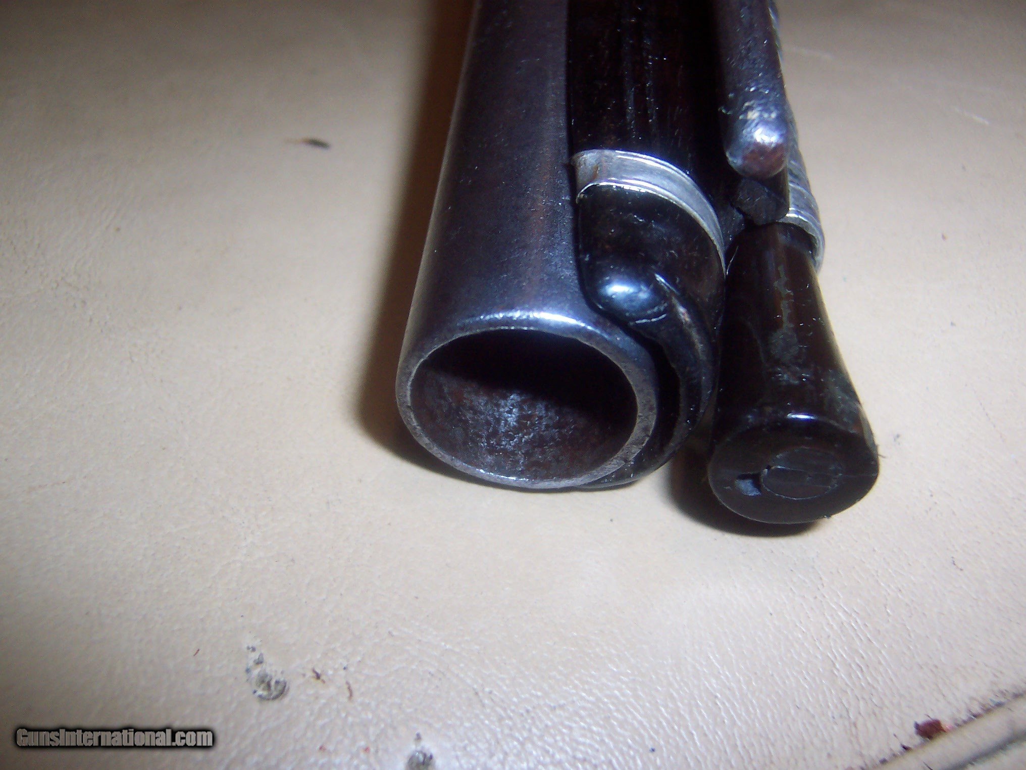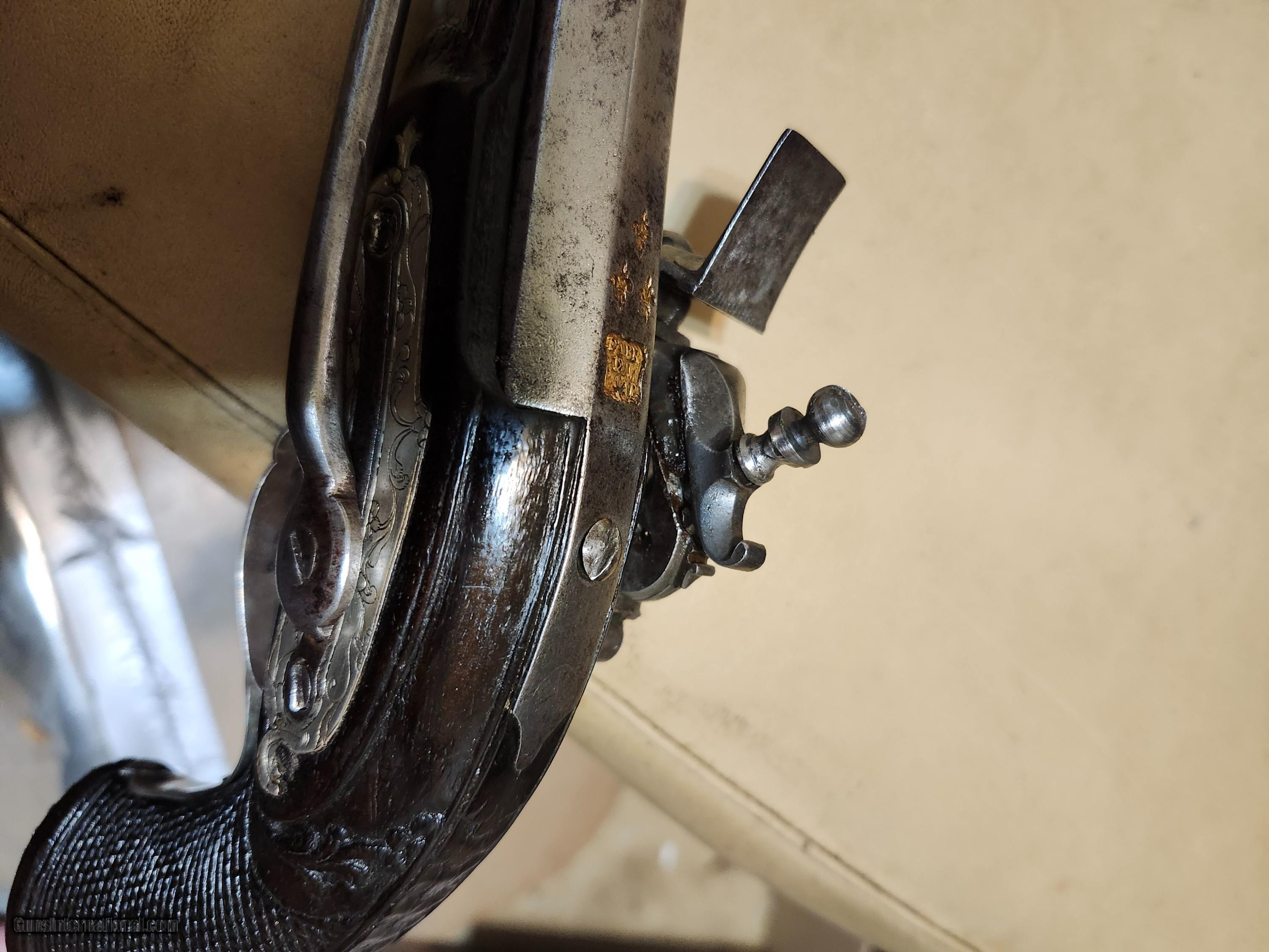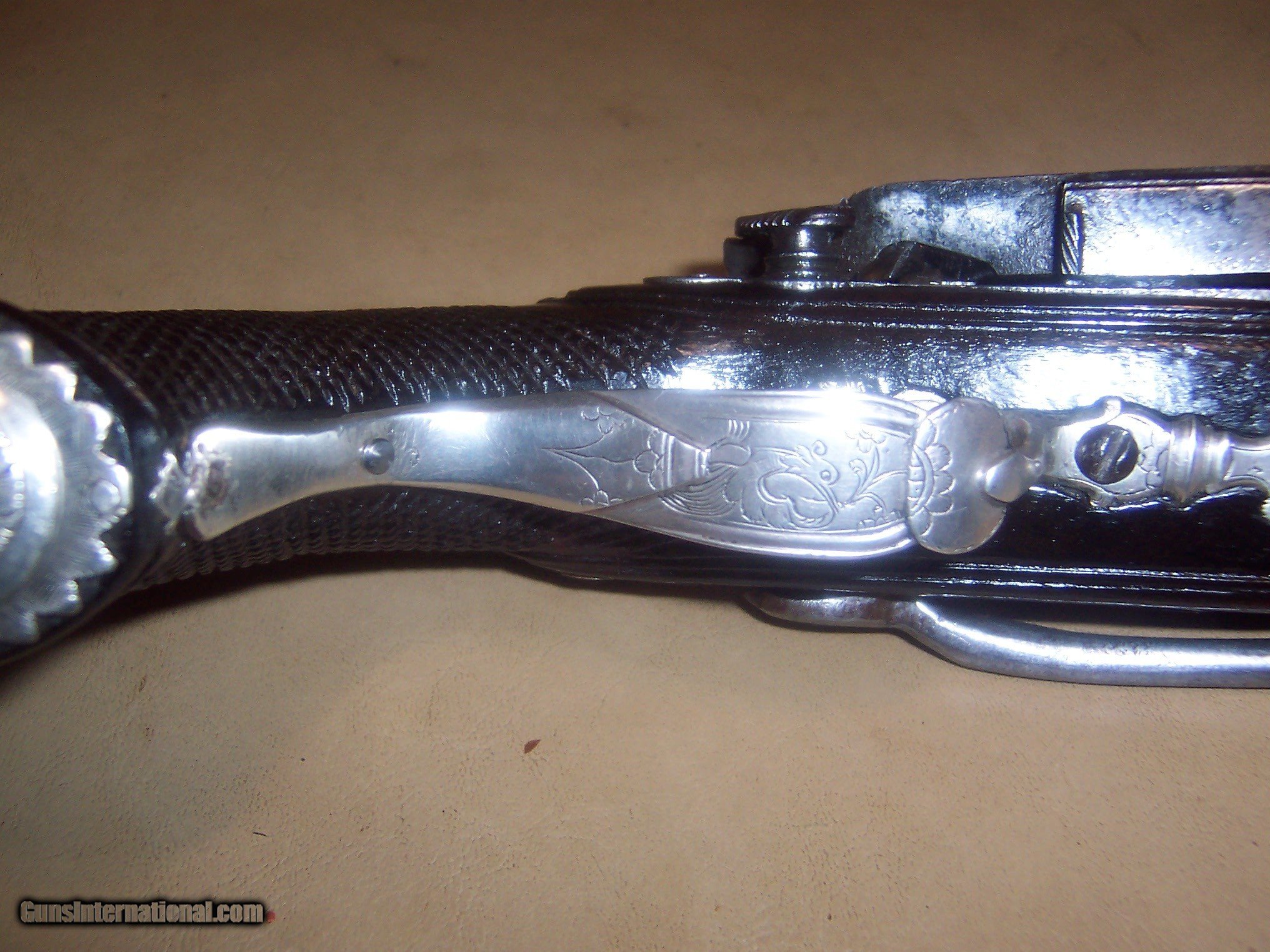 Description: 7 inch barrel//12 inches oa / pistol for upper class gentleman minor royal // works fine in dry fire / this has strong main spring //// age of pistol is unknown to me but has a gold inlayed makers stamp it reads Eiabr in square/ has a little risque moman engraving on butt cap //$60 sh ins $80 to ny , ak, ha looks like original horn tipped ramrod// bore looks vg see picture / i have never seen this before // the hammer top jaw with a removable pin in back of jaw that prevents top jaw from moving to the side Miquelet lock is a modern term used by collectors and curators for a type of firing mechanism used in muskets and pistols. It is a distinctive form of snaplock, originally as a flint-against-steel ignition form, once prevalent in the Spanish, Portuguese, and Ottoman empires, Italy, North Africa, and the Balkans from the late 16th to the mid-19th century. SOLD Antique: Yes Manufacturer: spanish Model: miquelet |