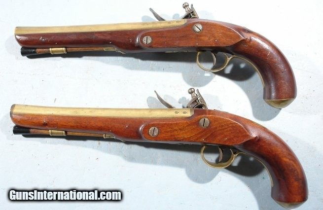 SUPERIOR PAIR GEORGE III FLINTLOCK BRASS BARREL MILITIA OFFICER’S PISTOLS BY GEO. E. JONES OF LONDON CA. 1800-10.