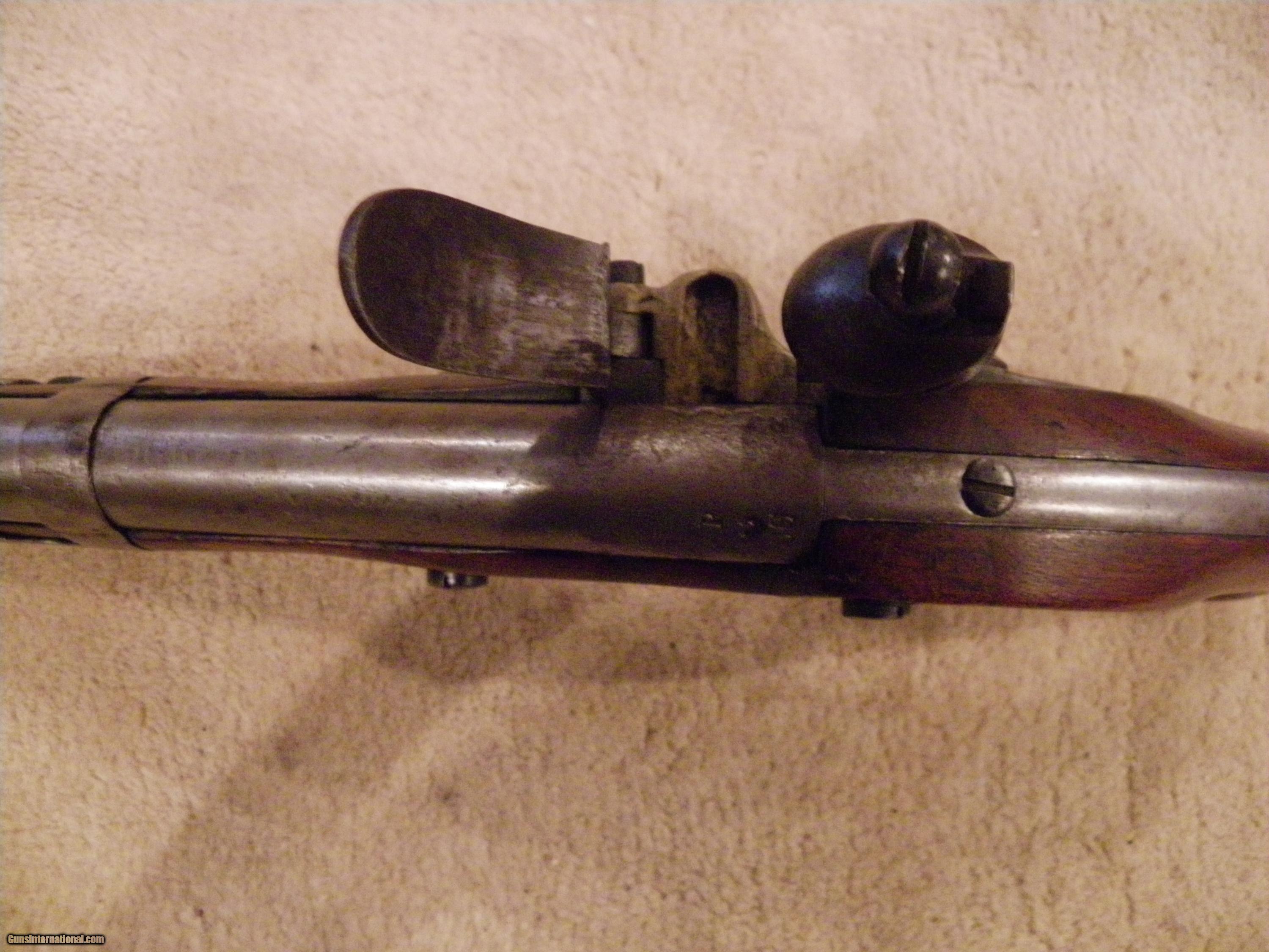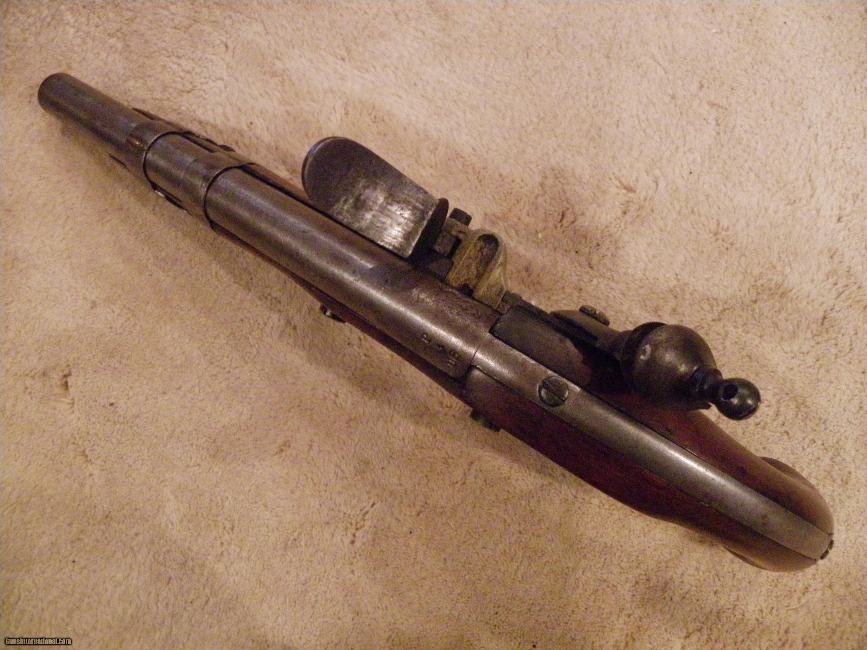 Description: Mfg. by Simeon North, .54 cal.Very Good plus condition. Mechanically perfect. All original parts except for old ramrod replacement. Barrel has light pitting near muzzle and flashpan. Barrel has proof marks: P and US on left side, RJ on right side at breach. Metal overall is light gray patina, muzzle edges are sharp, bore is smooth and dark. Wood has a nice plain oil finish with some fractures, mainly on the left side. Cartouch on left side of stock just aft of side plate, it is light and possibly says "LS". Lock is a dark patina with light pitting under flashpan, marked correctly with S. North, US bracketing eagle, and MIDLn Con. These letters fade slightly as they move towards muzzle. A very nice and correct martial flintlock pistol. $1900 plus S&H. SOLD Antique: Yes Manufacturer: S. North Model: 1816 Serial Number: none Caliber Info: .54 Bore: dark, smooth Condition: VG+ Metal Condition: patina Wood Condition: smooth with some fractures Bore Condition: VG |
