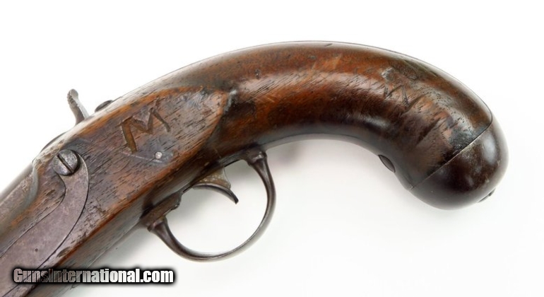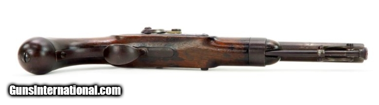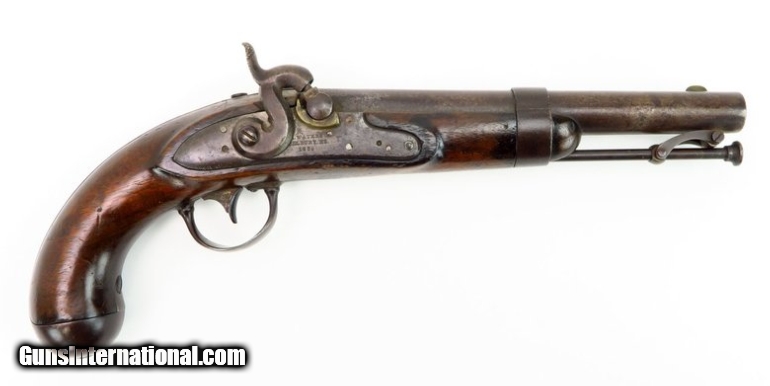 Description: U.S. Model 1836 Pistol by Waters. Dated 1839. Converted to percussion from flintlock in drum style. All markings are nice and sharp. Cartouches in stock are still visible. The letter M is carved in the left hand side near the cartouches. Action works fine. SOLD |