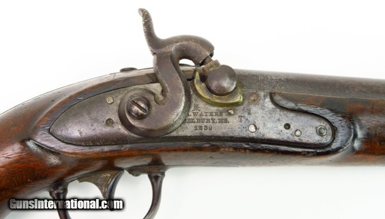 U.S. Model 1836 Pistol by Waters. Dated 1839. Converted to percussion from flintlock in drum style. All markings are nice and sharp. Cartouches in stock are still visible. The letter M is carved in the left hand side near the cartouches. Action works fine.