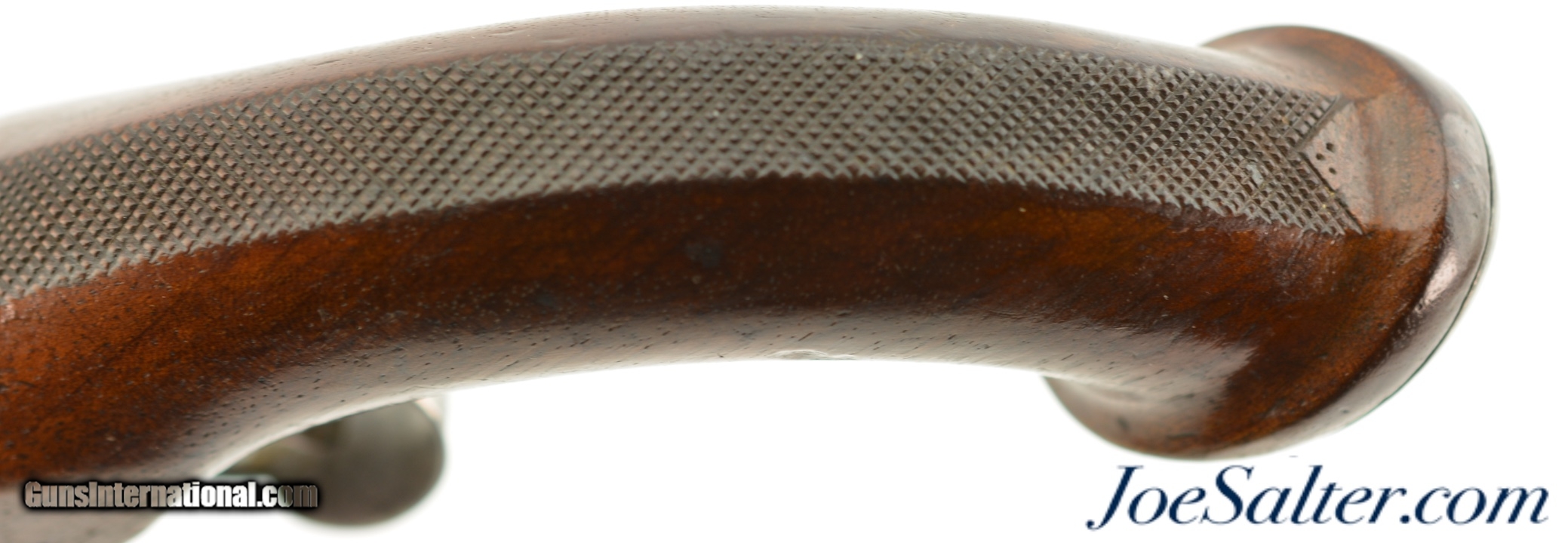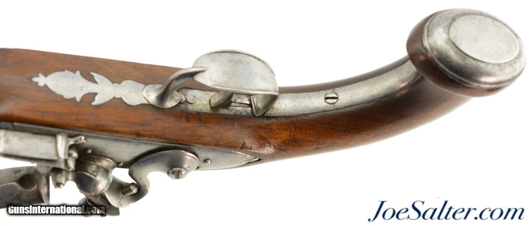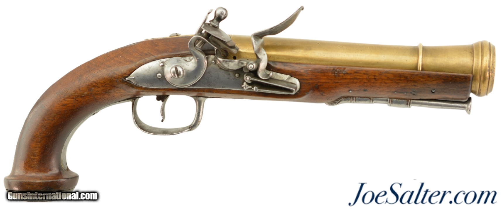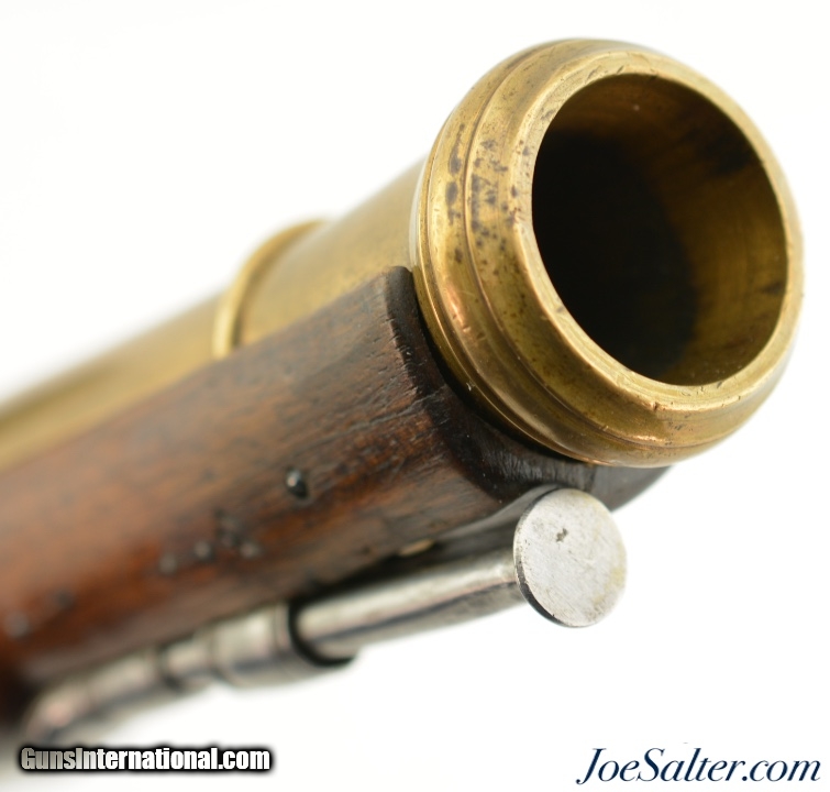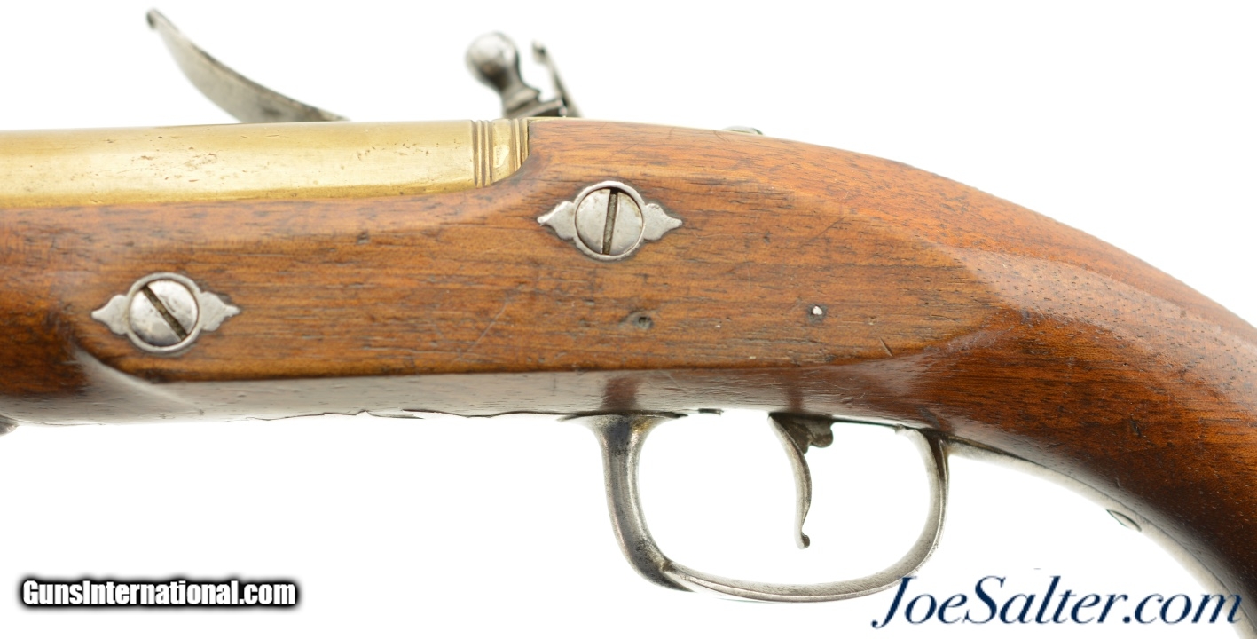 Description: NSN, approximately .80 Caliber, 6 7/8" flared barrel with a very good, lightly freckled bore. This is a very well-made pistol, devoid of proof or maker’s marks, that has an attractive brass cannon-type barrel with an overall mellow ochre patina. The iron lock, trigger guard, and stock furniture have a mild pewter gray patina with some spots of dark pitting on and around the pan and frizzen. The pin-fastened walnut stock has some scattered handling marks and minor surface blemishes throughout the otherwise fine oil finish, and features a checkered band running the length of the backstrap. The iron cap on the end of the flared butt is slightly loose, and has some very minor pinprick pitting. The original iron ramrod is still present, and the lock is fully functional. This is a very handsome pistol, in very good-fine condition, and would make a great addition to a collection. SOLD Antique: Yes |
