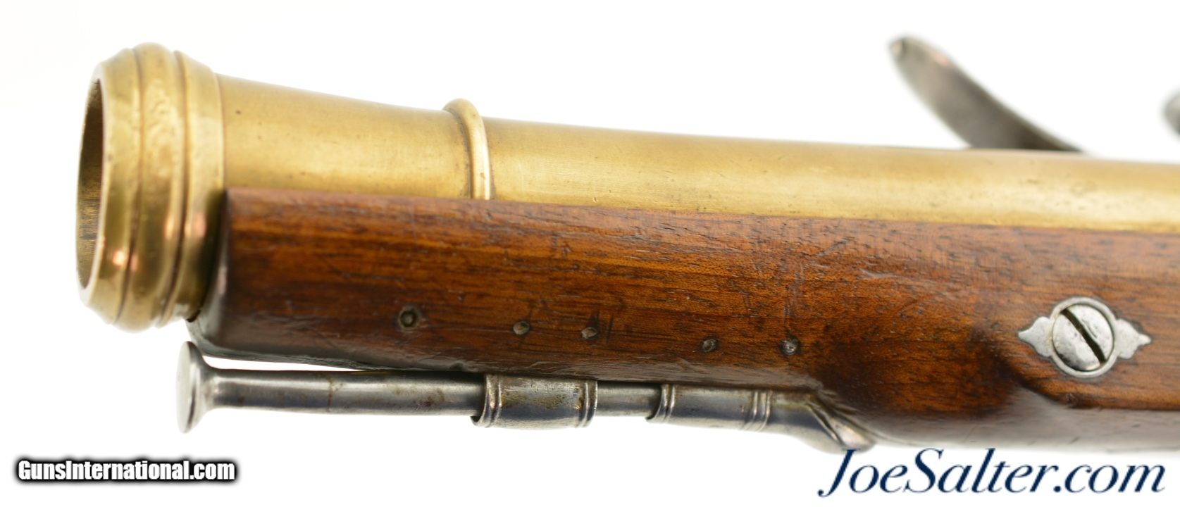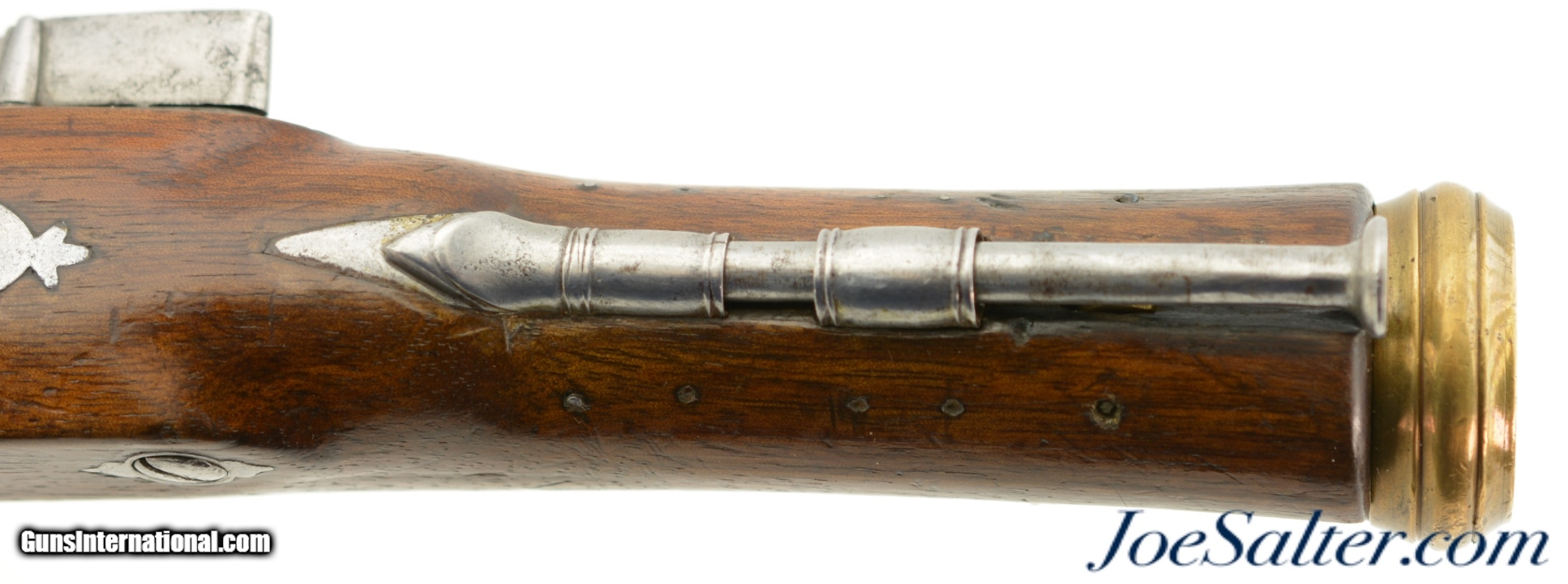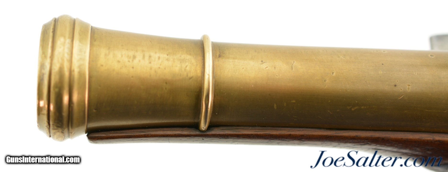Description: NSN, approximately .80 Caliber, 6 7/8" flared barrel with a very good, lightly freckled bore. This is a very well-made pistol, devoid of proof or maker’s marks, that has an attractive brass cannon-type barrel with an overall mellow ochre patina. The iron lock, trigger guard, and stock furniture have a mild pewter gray patina with some spots of dark pitting on and around the pan and frizzen. The pin-fastened walnut stock has some scattered handling marks and minor surface blemishes throughout the otherwise fine oil finish, and features a checkered band running the length of the backstrap. The iron cap on the end of the flared butt is slightly loose, and has some very minor pinprick pitting. The original iron ramrod is still present, and the lock is fully functional. This is a very handsome pistol, in very good-fine condition, and would make a great addition to a collection. SOLD Antique: Yes |