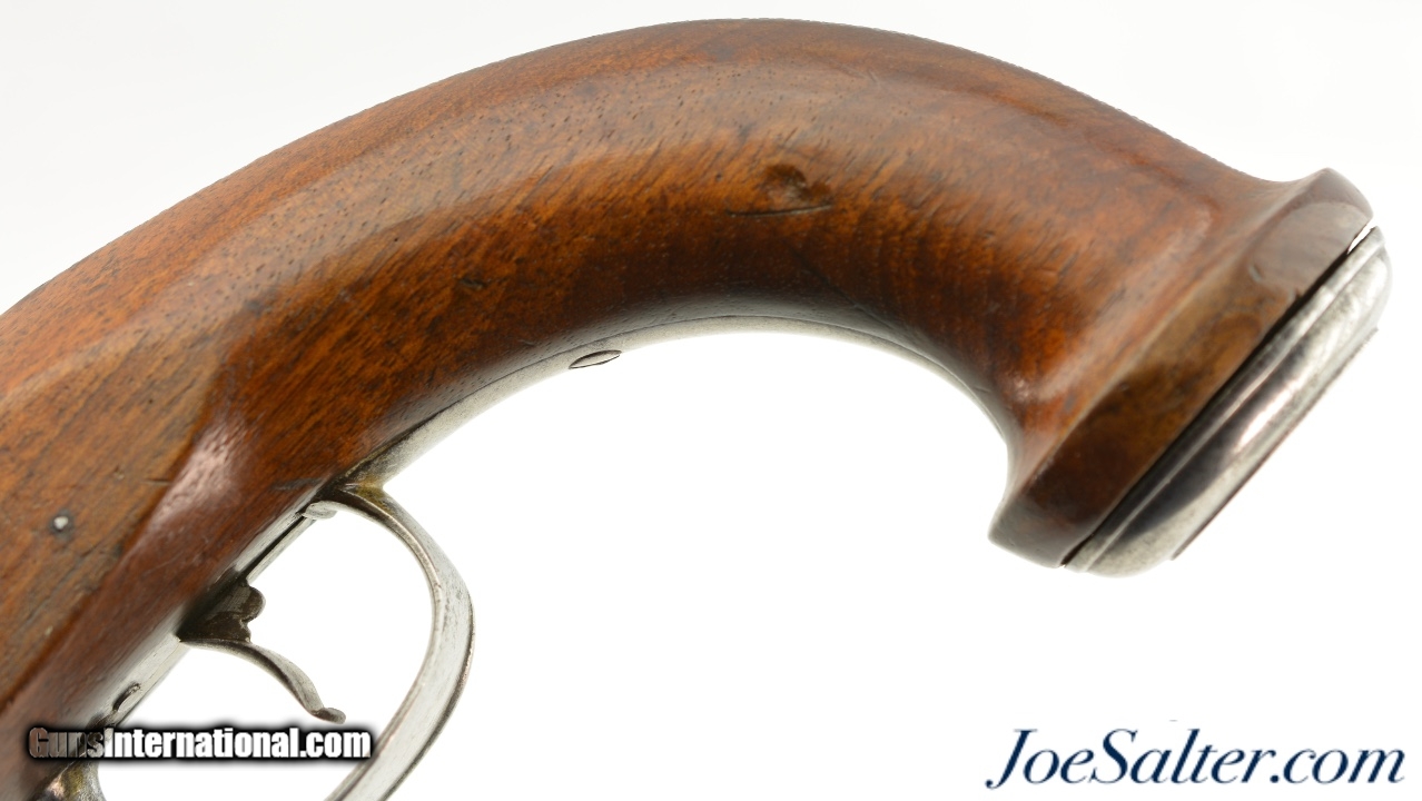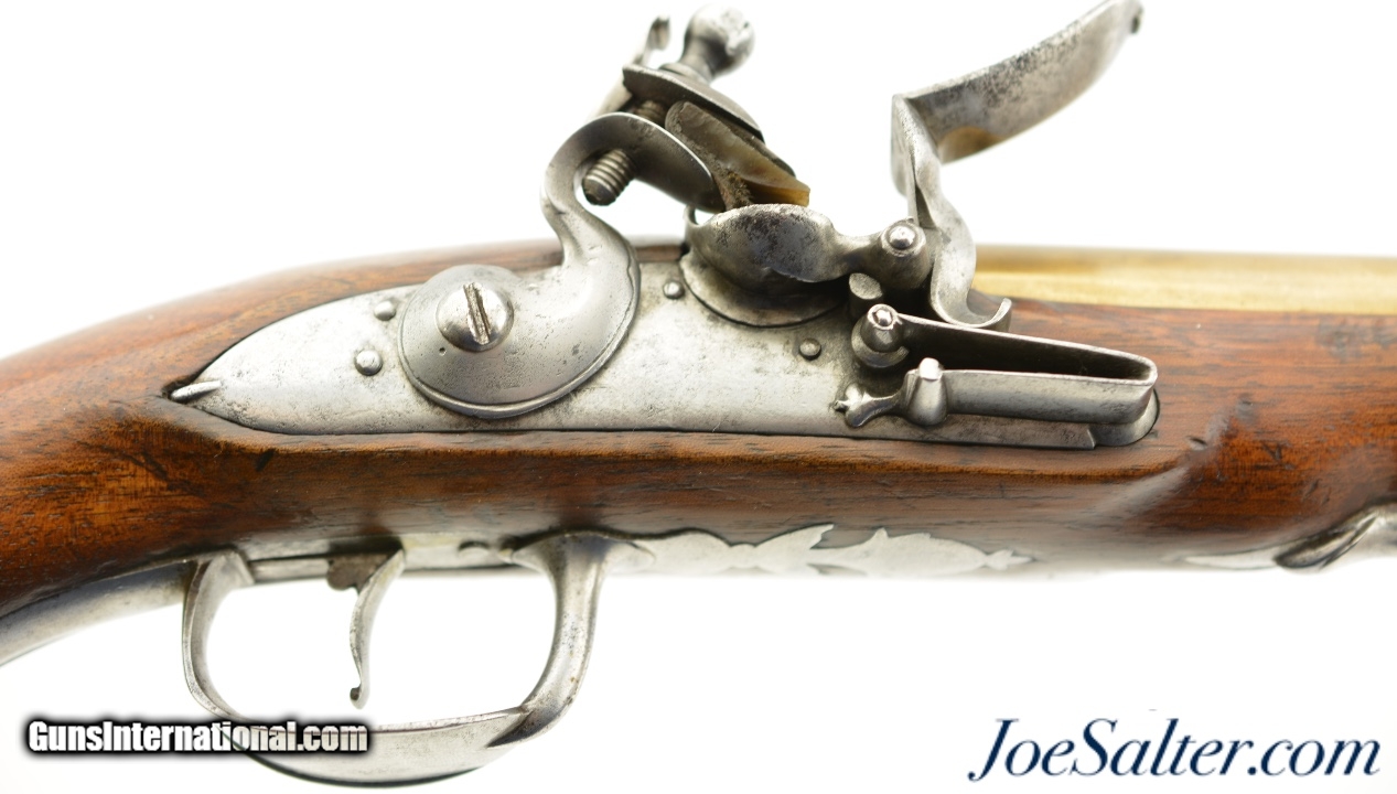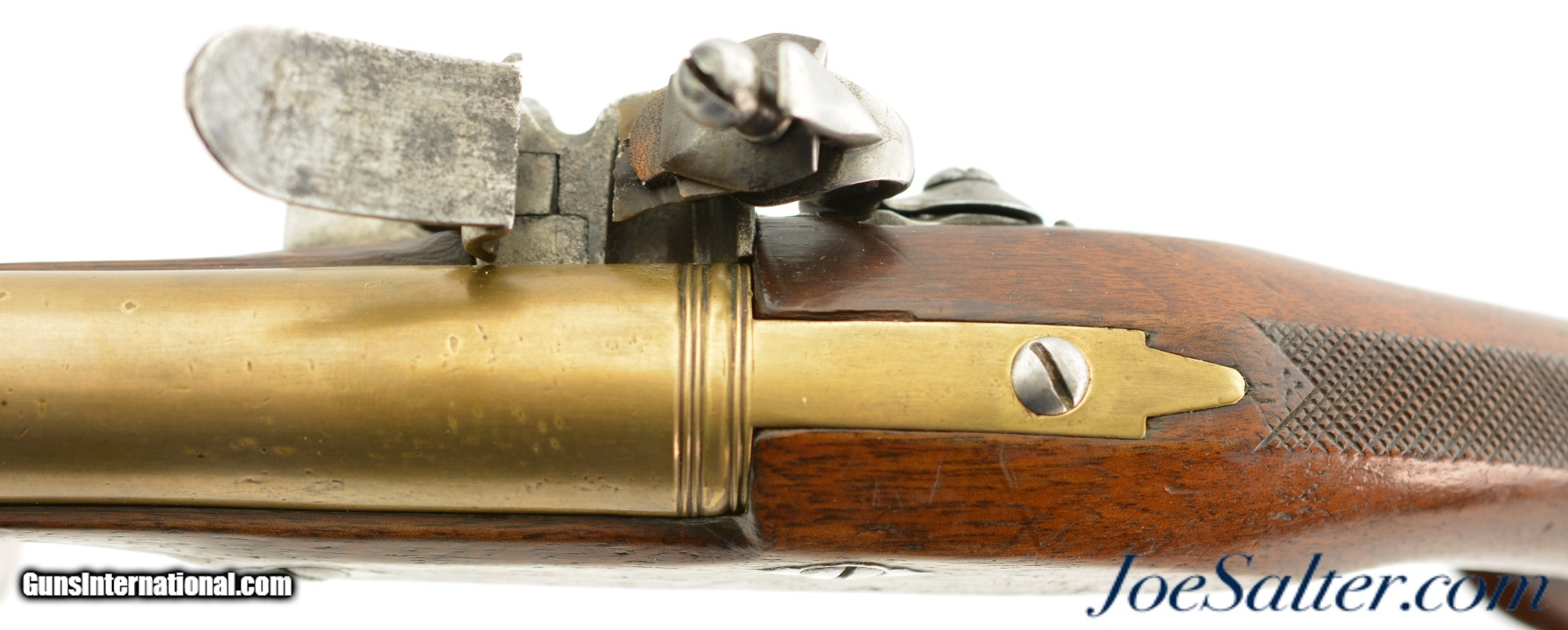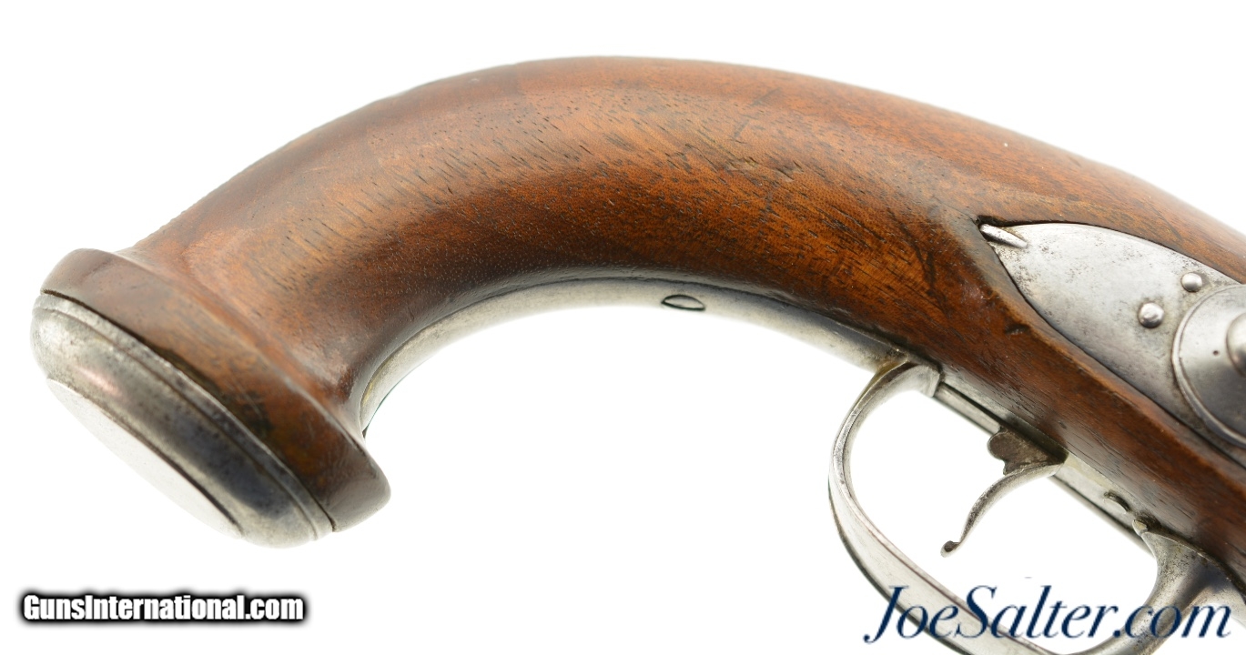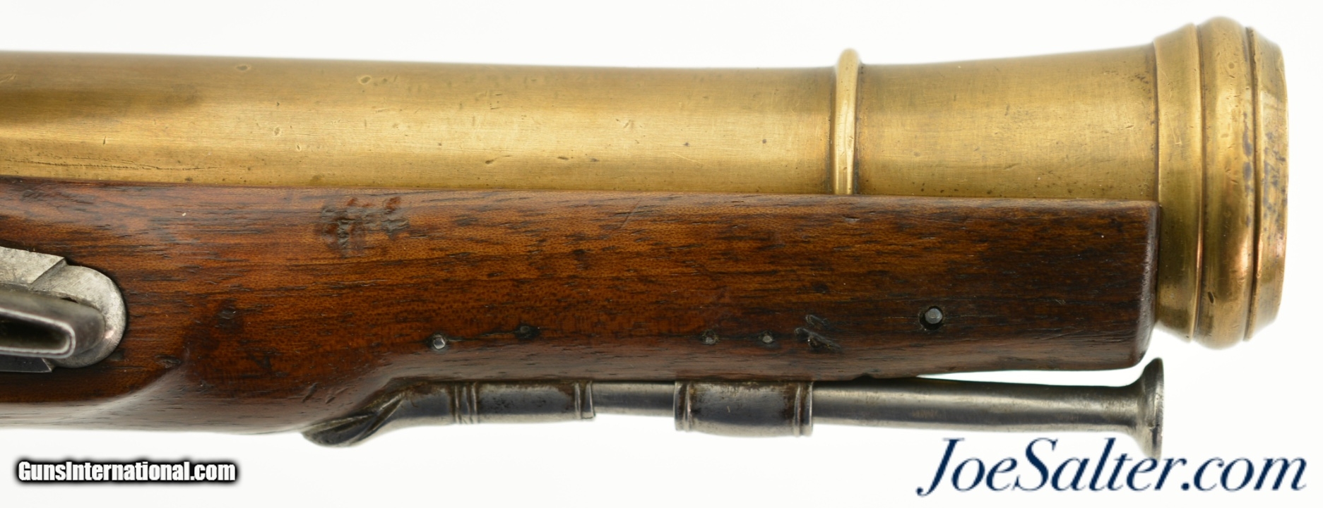 Description: NSN, approximately .80 Caliber, 6 7/8" flared barrel with a very good, lightly freckled bore. This is a very well-made pistol, devoid of proof or maker’s marks, that has an attractive brass cannon-type barrel with an overall mellow ochre patina. The iron lock, trigger guard, and stock furniture have a mild pewter gray patina with some spots of dark pitting on and around the pan and frizzen. The pin-fastened walnut stock has some scattered handling marks and minor surface blemishes throughout the otherwise fine oil finish, and features a checkered band running the length of the backstrap. The iron cap on the end of the flared butt is slightly loose, and has some very minor pinprick pitting. The original iron ramrod is still present, and the lock is fully functional. This is a very handsome pistol, in very good-fine condition, and would make a great addition to a collection. SOLD Antique: Yes |
