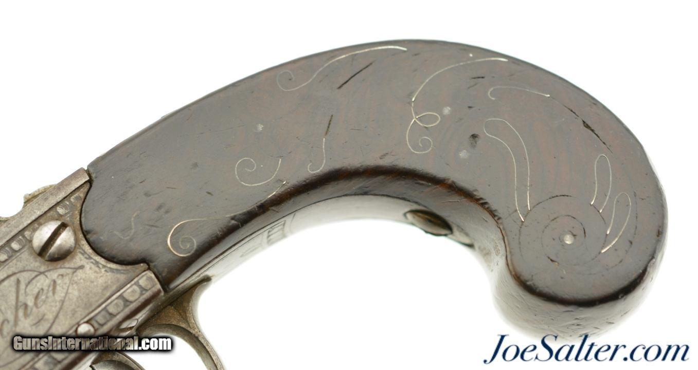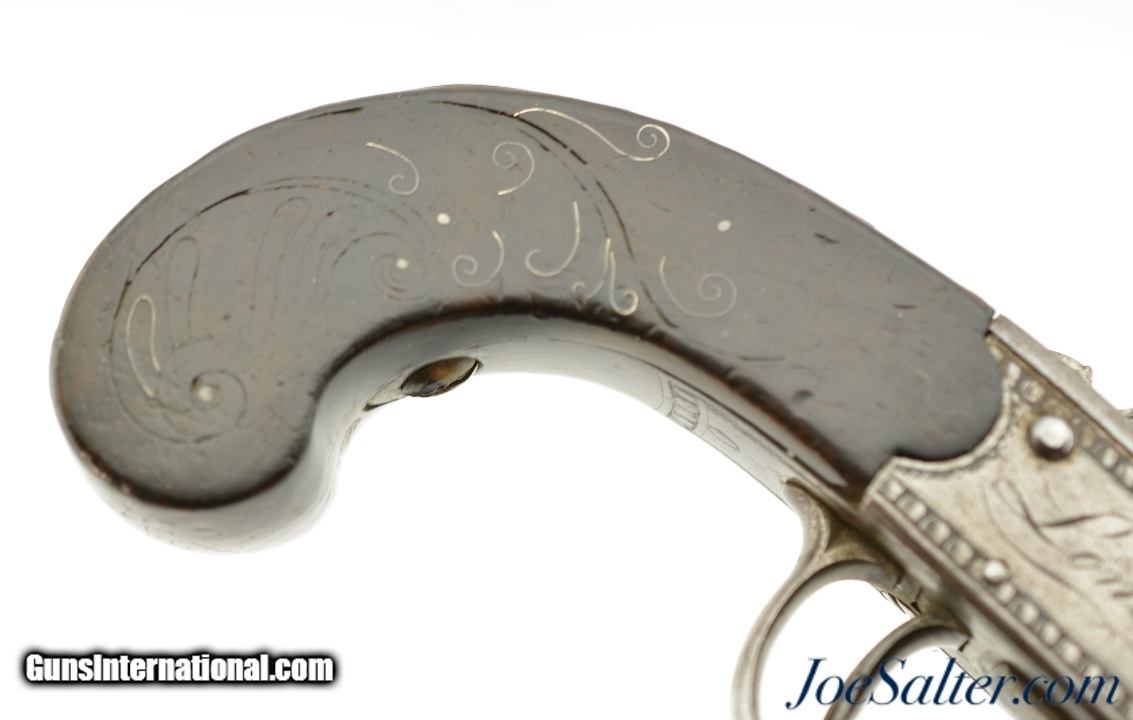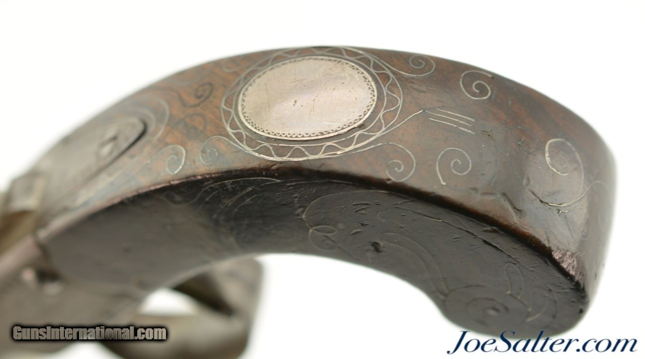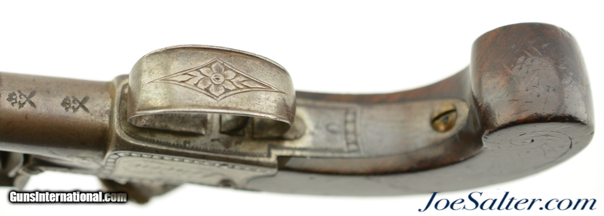 Description: NSN, .45 Caliber, 2 1/2" barrel with a good, lightly pitted bore. This is a handsome pistol that has a slightly mottled, dark pewter gray patina throughout, with some small areas of plum-brown freckling as well. The retailer’s name is engraved on the left side of the box frame in flowing script, "Archer," with "London" on the right. The rounded walnut grip has silver wire inlays, and small handling marks and blemishes scattered about the original oil finish. The action is tight and functions flawlessly. This is a very well made and handsome pistol, and is in fine condition overall. Antique; Antique: Yes Price: $895.00 Contact Seller |