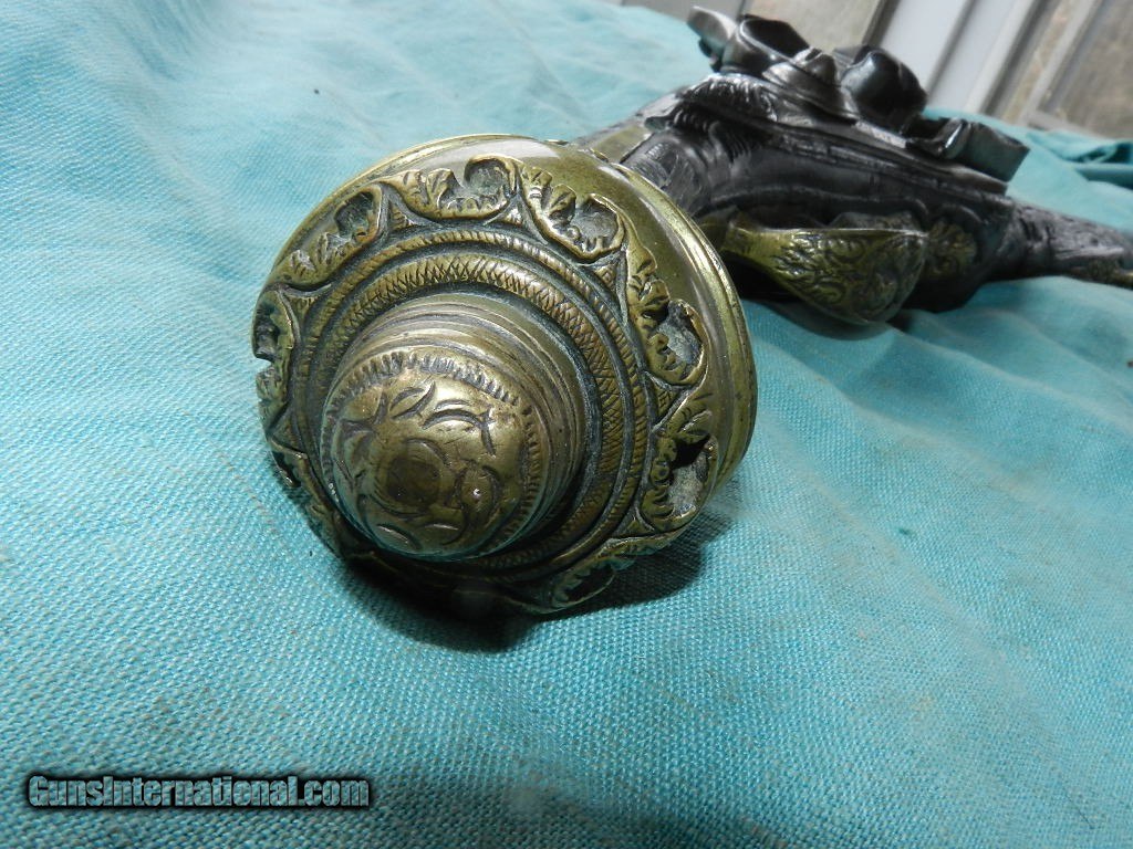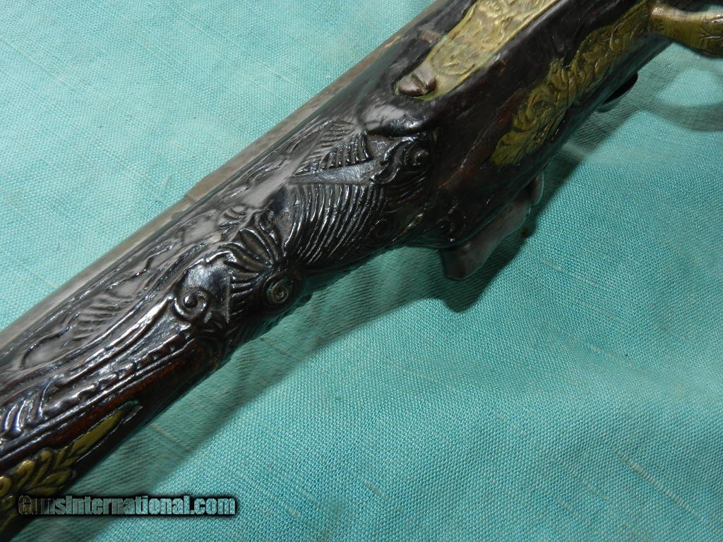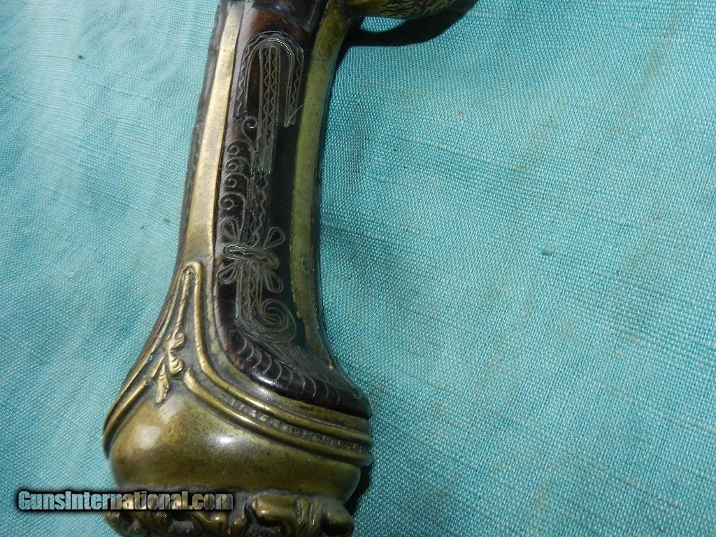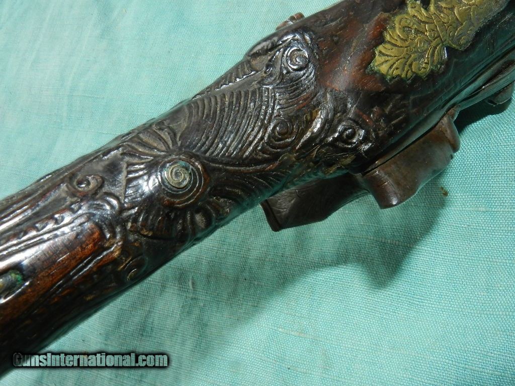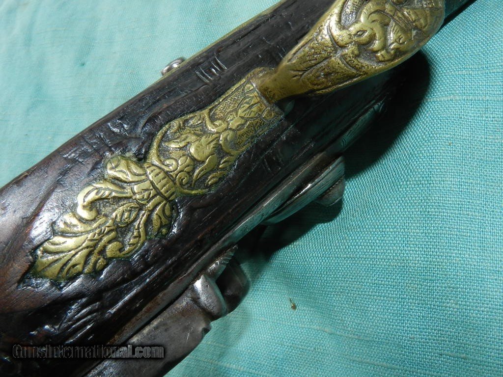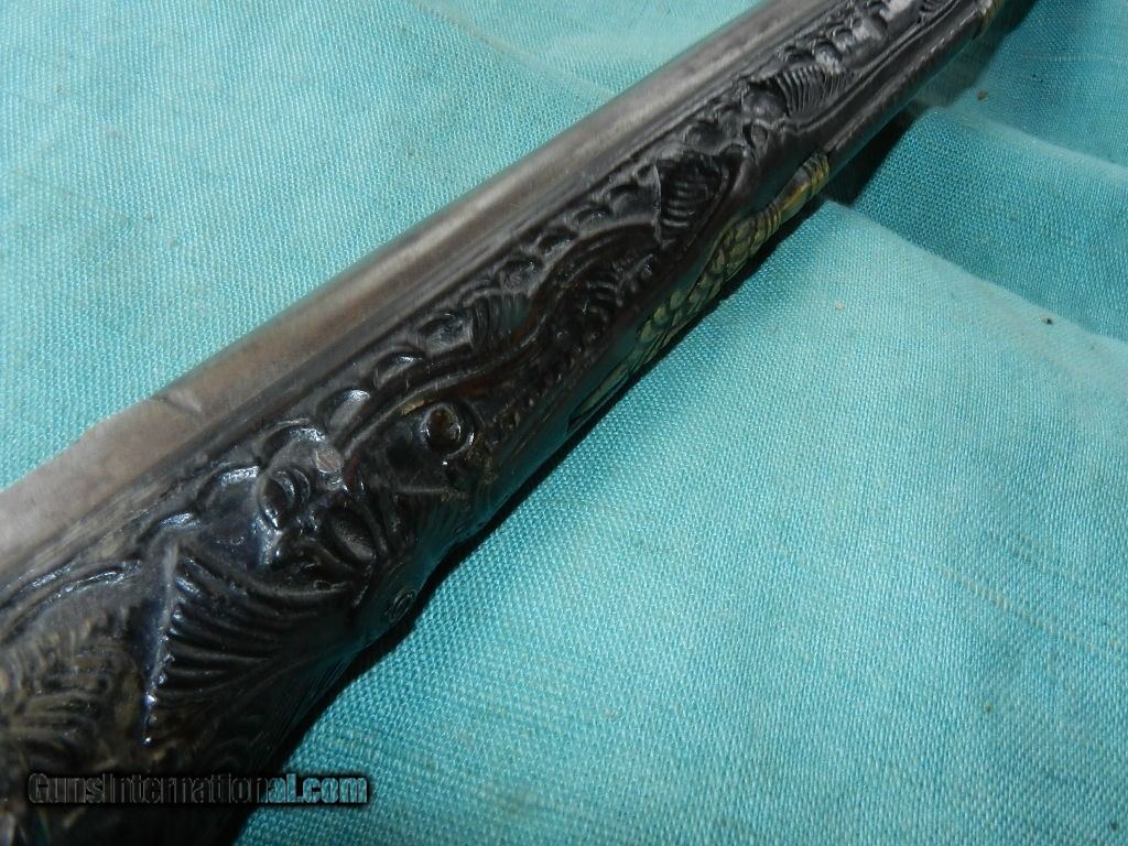 Description: A Very , very fine detailed Pirate ship Captain long 17th ~18th flintlock belt/sash pistol with numberous deep chisel carved European walnut stock with very fine early wire inlays all in very good condition. The top of the 12 1/2" long octagonal/round barrel is engraved and inlaid. The early bananna shaped lock is also ornately chisel engraved. The action works well and has a very strong main-spring. The furniture is all brass with a mustard/vintage look. The muzzle measures inside about .55 or .52 caliber. As with many early exported flintlocks from European countries this gun has no maker name or proofs. Overall measures about 20" long and is very fine quality with fine craftsmanship exhbited through-out the entire gun! When buying a gun always have it examined by a competent gunsmith before shooting. To buy a gun from me you must get a direct email for me, with details, and shipping cost. We don’t have a web site .I prefer money orders or a check. Item ships when funds come in. I try to keep guns affordable, which means I make less money than most dealers. You won’t get altitude sickness, or nose bleed, with my prices! I consistently have the best selection of older guns If you attempt to buy, you must still contact us for details . Best to email to buy. Sometimes a local person can stop buy and purchase before the gun is removed. Sometimes not home to get calls. Some guns are required shipment to a gun dealer near you for a transfer to you when it arrives. Otherwise many older or black powder guns ship to your door. With the widest selection of older guns at great prices, We don’t have a store, and sell on the internet only. I’m easy to get along with. Thank You SOLD |