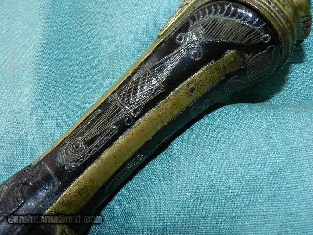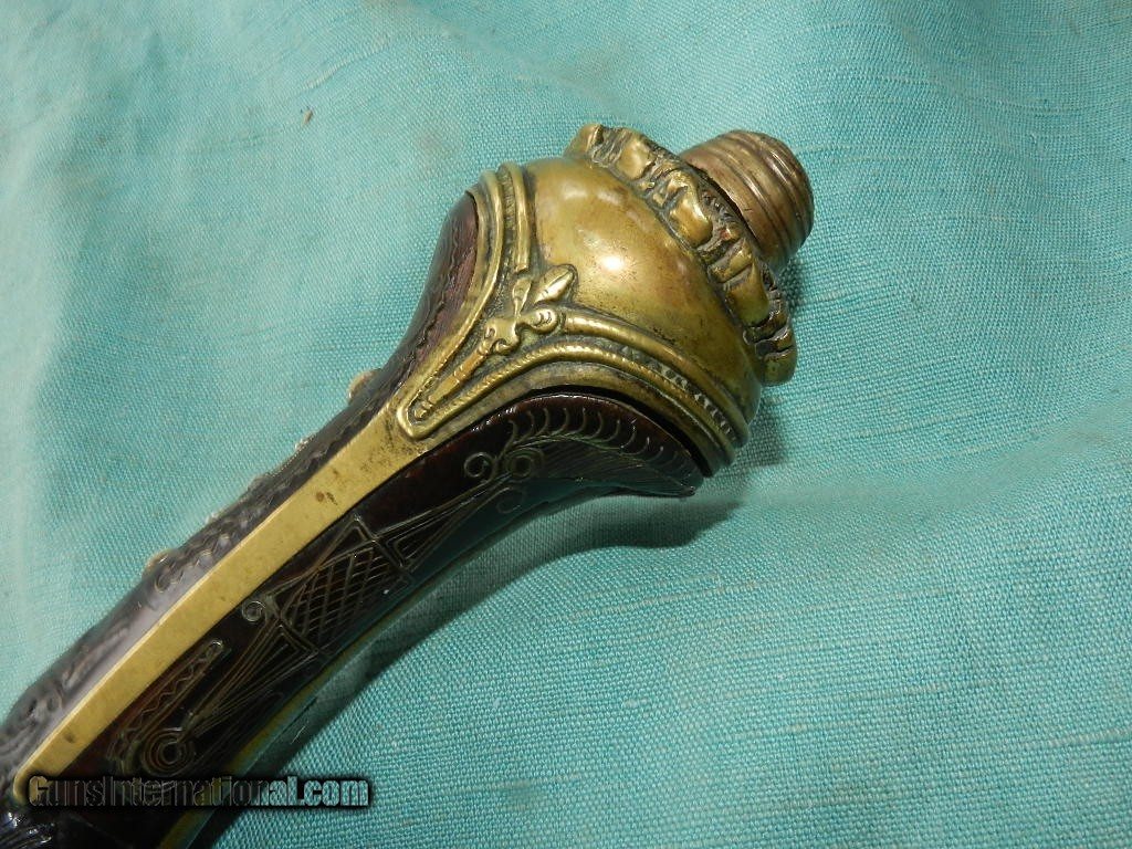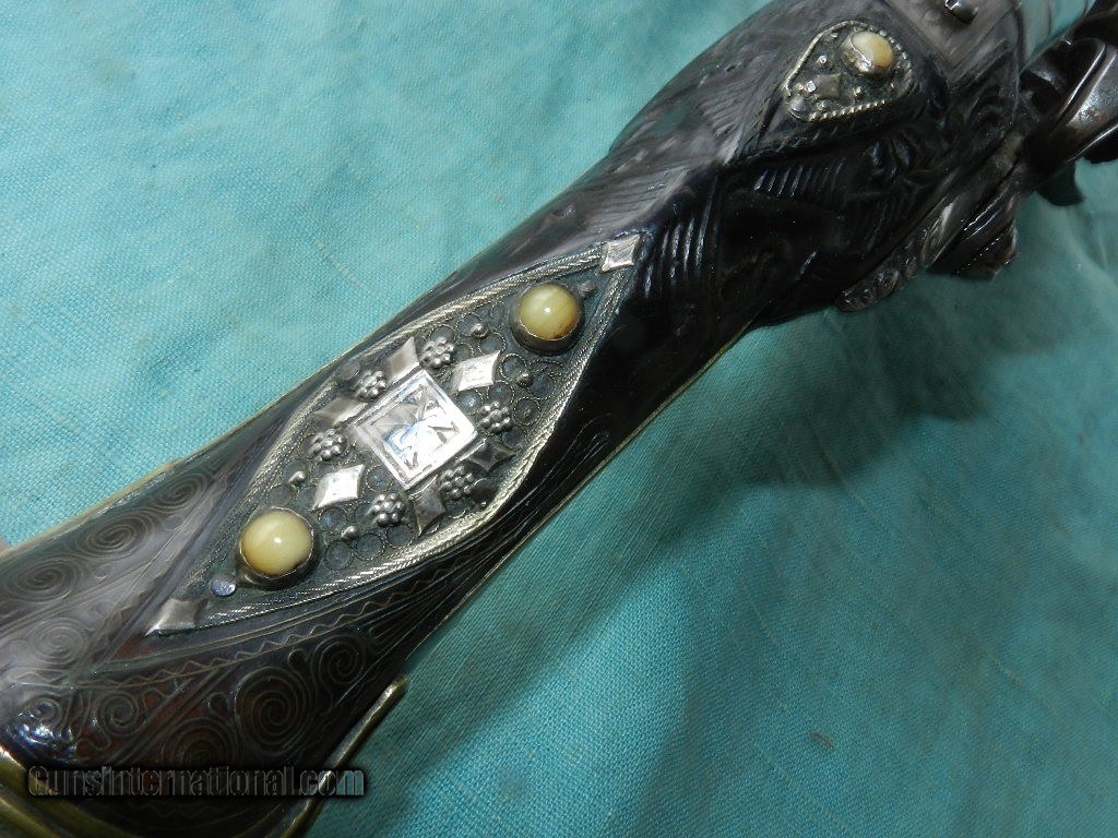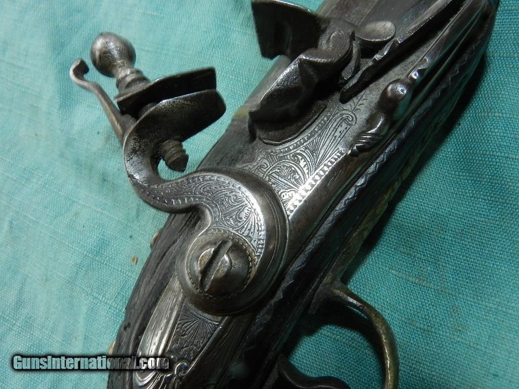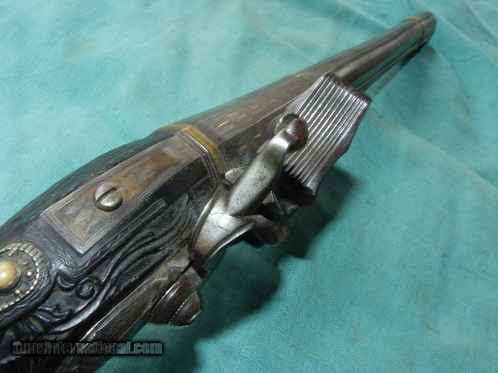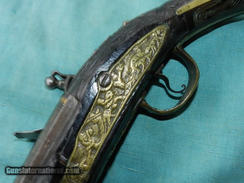 Description: A Very , very fine detailed Pirate ship Captain long 17th ~18th flintlock belt/sash pistol with numberous deep chisel carved European walnut stock with very fine early wire inlays all in very good condition. The top of the 12 1/2" long octagonal/round barrel is engraved and inlaid. The early bananna shaped lock is also ornately chisel engraved. The action works well and has a very strong main-spring. The furniture is all brass with a mustard/vintage look. The muzzle measures inside about .55 or .52 caliber. As with many early exported flintlocks from European countries this gun has no maker name or proofs. Overall measures about 20" long and is very fine quality with fine craftsmanship exhbited through-out the entire gun! When buying a gun always have it examined by a competent gunsmith before shooting. To buy a gun from me you must get a direct email for me, with details, and shipping cost. We don’t have a web site .I prefer money orders or a check. Item ships when funds come in. I try to keep guns affordable, which means I make less money than most dealers. You won’t get altitude sickness, or nose bleed, with my prices! I consistently have the best selection of older guns If you attempt to buy, you must still contact us for details . Best to email to buy. Sometimes a local person can stop buy and purchase before the gun is removed. Sometimes not home to get calls. Some guns are required shipment to a gun dealer near you for a transfer to you when it arrives. Otherwise many older or black powder guns ship to your door. With the widest selection of older guns at great prices, We don’t have a store, and sell on the internet only. I’m easy to get along with. Thank You SOLD |