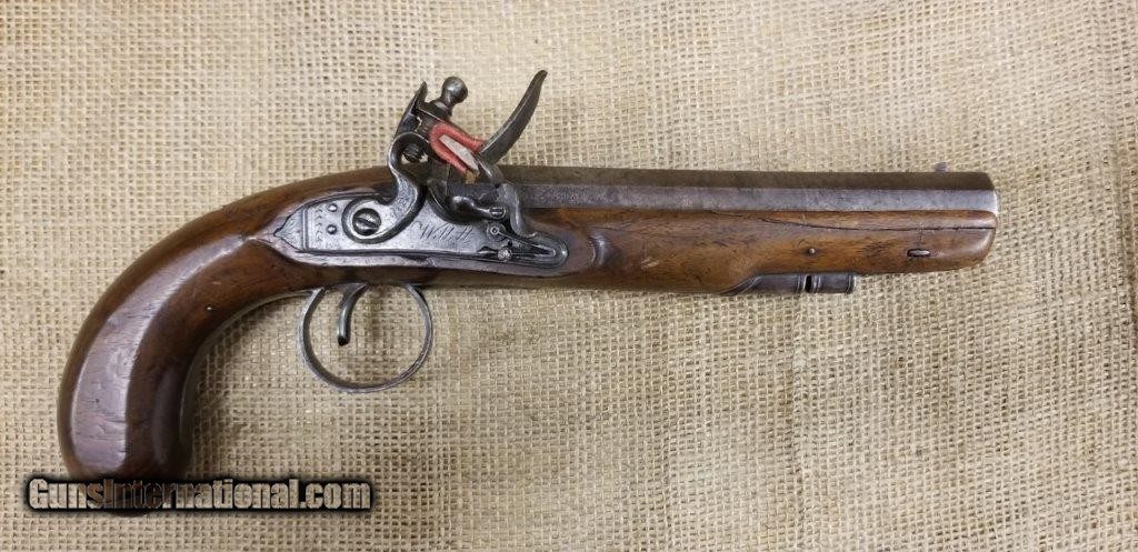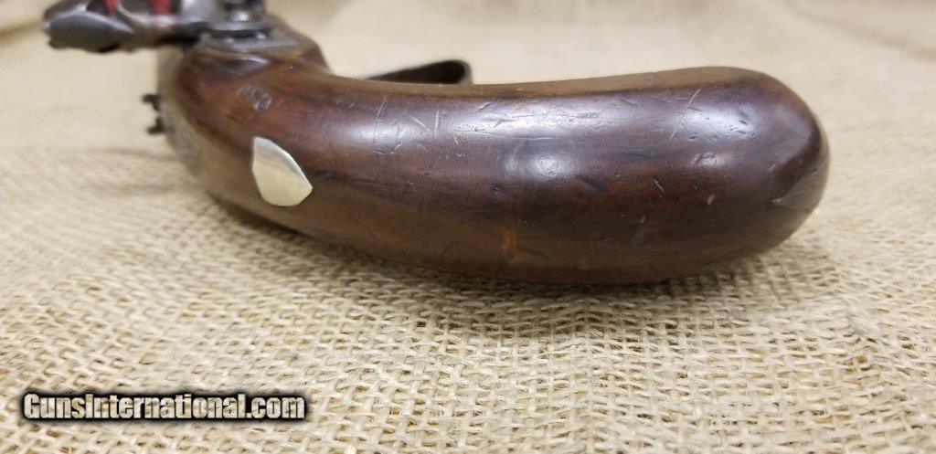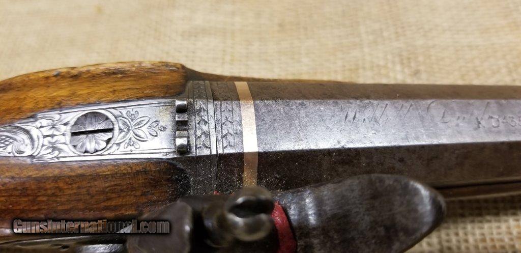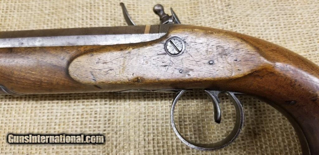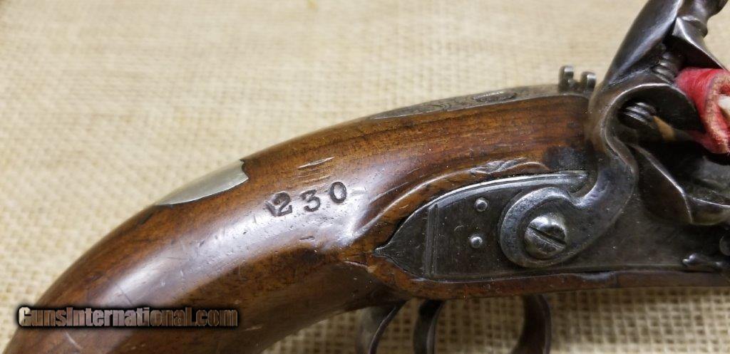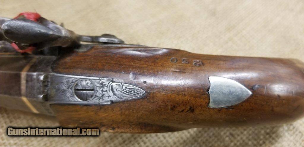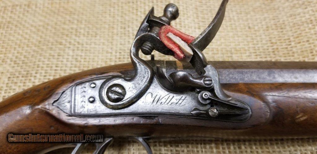 Description: Willett Dublin Ireland Flintolock Pistol A late 18th / early 19th century Irish flintlock pistol by Willett of Dublin, cane handle walnut stock, split along the right front, the lockplate is engraved 'Willett' and top of barrel engraved 'Willett Dublin'. Fine engraved round trigger guard, engraving on back strap, missing ramrod, heavy octagon 7 inch barrel with front and rear sights, rear of barrel is engraved in rings, brass or silver ring inlay, engraved swan neck cock. The stock is stamped 230 and KD-3513 is stamped on the top of the barrel as required by the British when all firearms were required to be registered. Two stage action works properly. Overall length is 12 inches. The Willett family of gunmakers are recorded as operating from 22, and later 23, Eustace Street, Dublin from 1781 to 1810. Robert Willett is recorded at Bath Street, Irishtown in 1834-35. SOLD Antique: Yes |