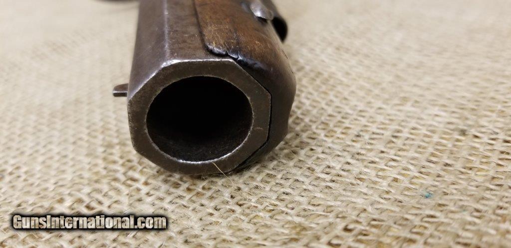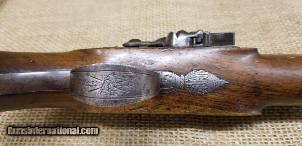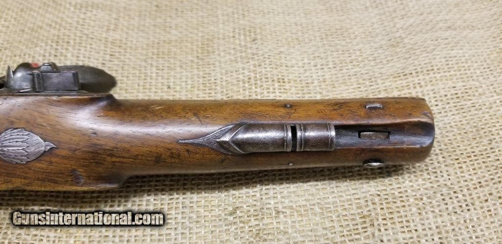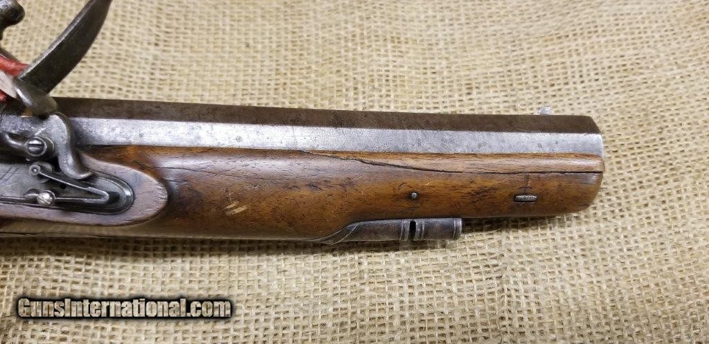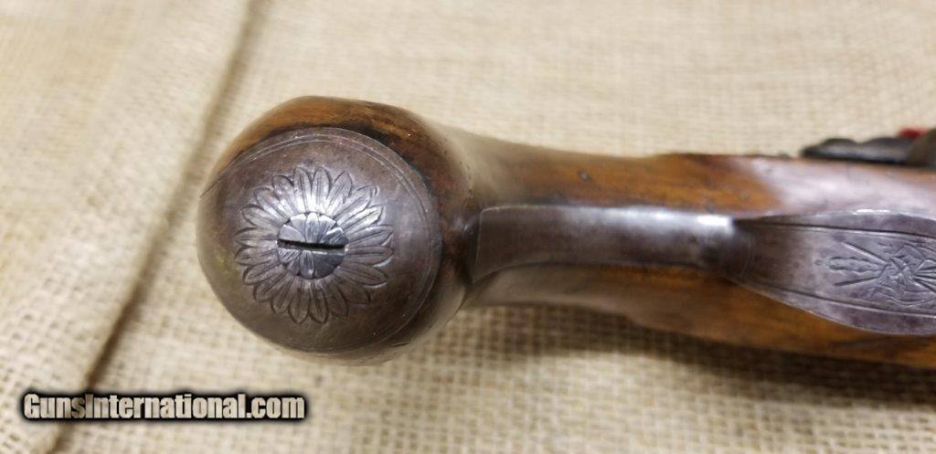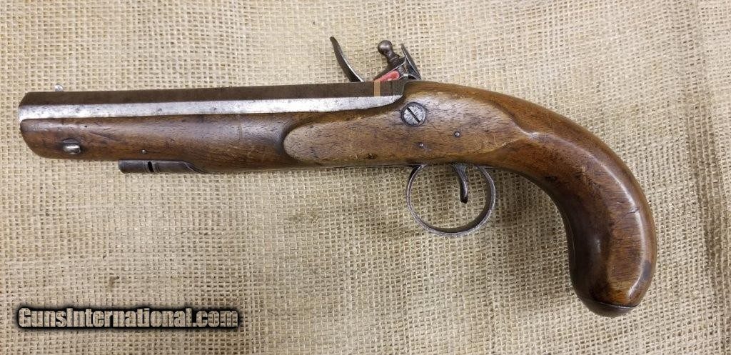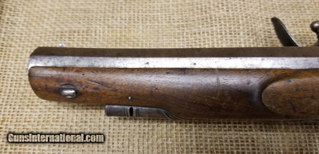 Description: Willett Dublin Ireland Flintolock Pistol A late 18th / early 19th century Irish flintlock pistol by Willett of Dublin, cane handle walnut stock, split along the right front, the lockplate is engraved 'Willett' and top of barrel engraved 'Willett Dublin'. Fine engraved round trigger guard, engraving on back strap, missing ramrod, heavy octagon 7 inch barrel with front and rear sights, rear of barrel is engraved in rings, brass or silver ring inlay, engraved swan neck cock. The stock is stamped 230 and KD-3513 is stamped on the top of the barrel as required by the British when all firearms were required to be registered. Two stage action works properly. Overall length is 12 inches. The Willett family of gunmakers are recorded as operating from 22, and later 23, Eustace Street, Dublin from 1781 to 1810. Robert Willett is recorded at Bath Street, Irishtown in 1834-35. SOLD Antique: Yes |