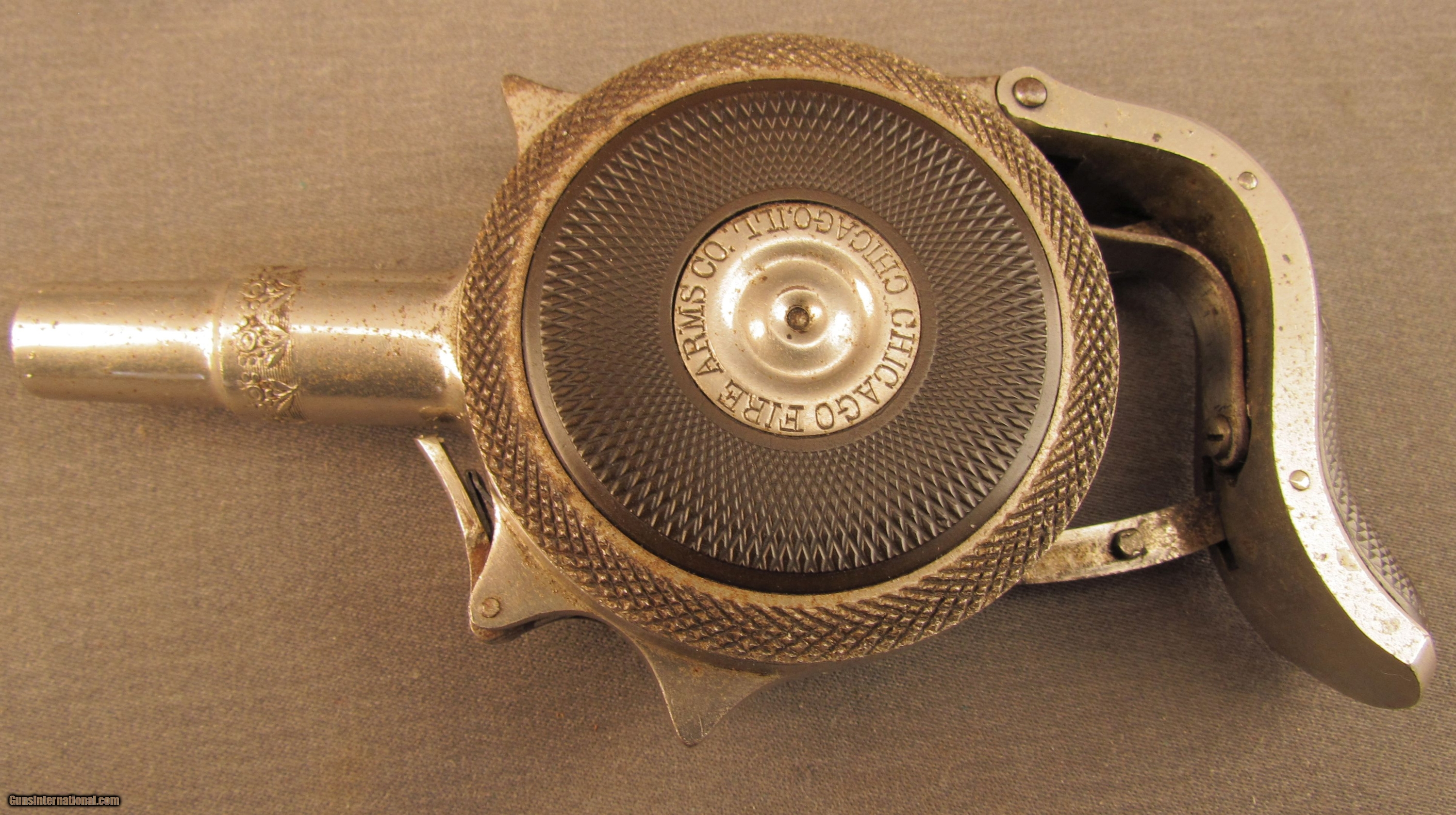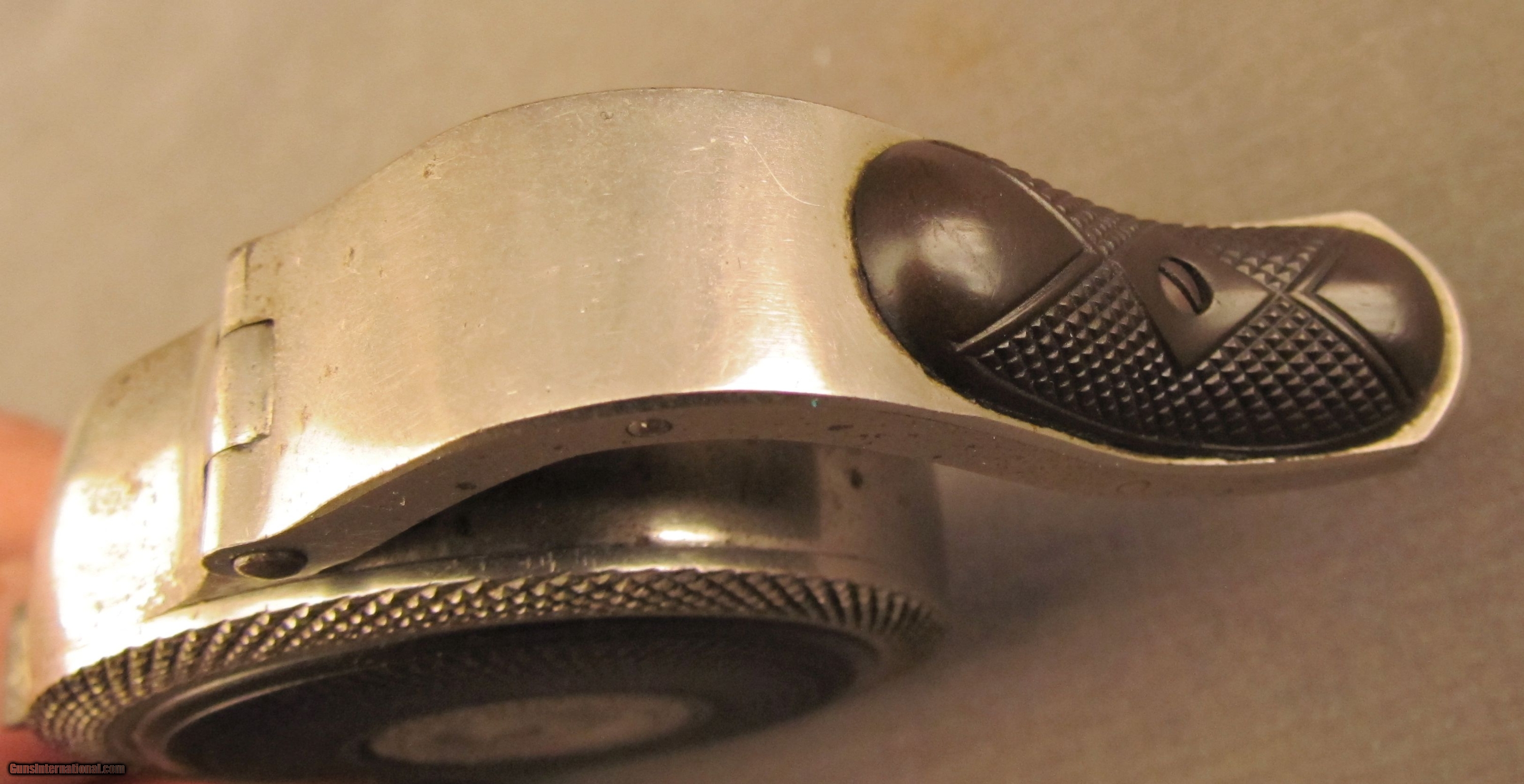 Description: Serial #9697, .32 Extra Short (RF), 1 3/4” barrel with an excellent, bright bore. This is a handsome pistol that has has matching numbers on the frame, side plate, and removable chamber turret. The metal retains 95-97% of the original nickel finish with a few small specks of flaking and freckling here and there, most noticeably within the checkered rim on the side plate hub. The checkered hard rubber side panels and grip pad are in excellent shape with very little surface wear or flattening. The mechanism is tight and fully functional and the pistol rates excellent condition; a great collectible and iconic palm pistol. Antique SOLD Antique: Yes Manufacturer: Chicago Model: Protector Serial Number: 9697 Caliber Info: .32RF Gauge Info: .32RF |
