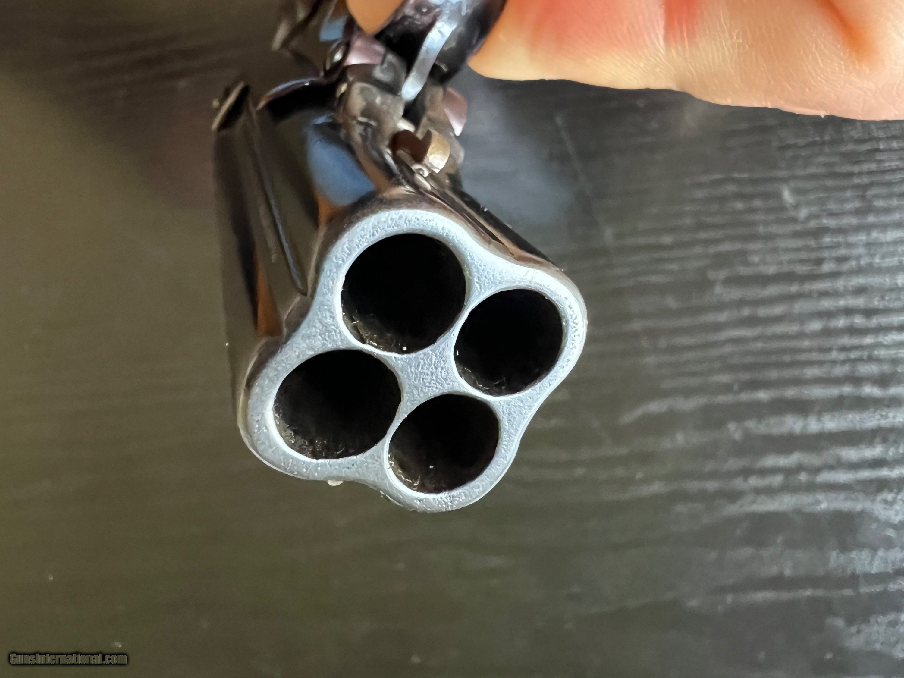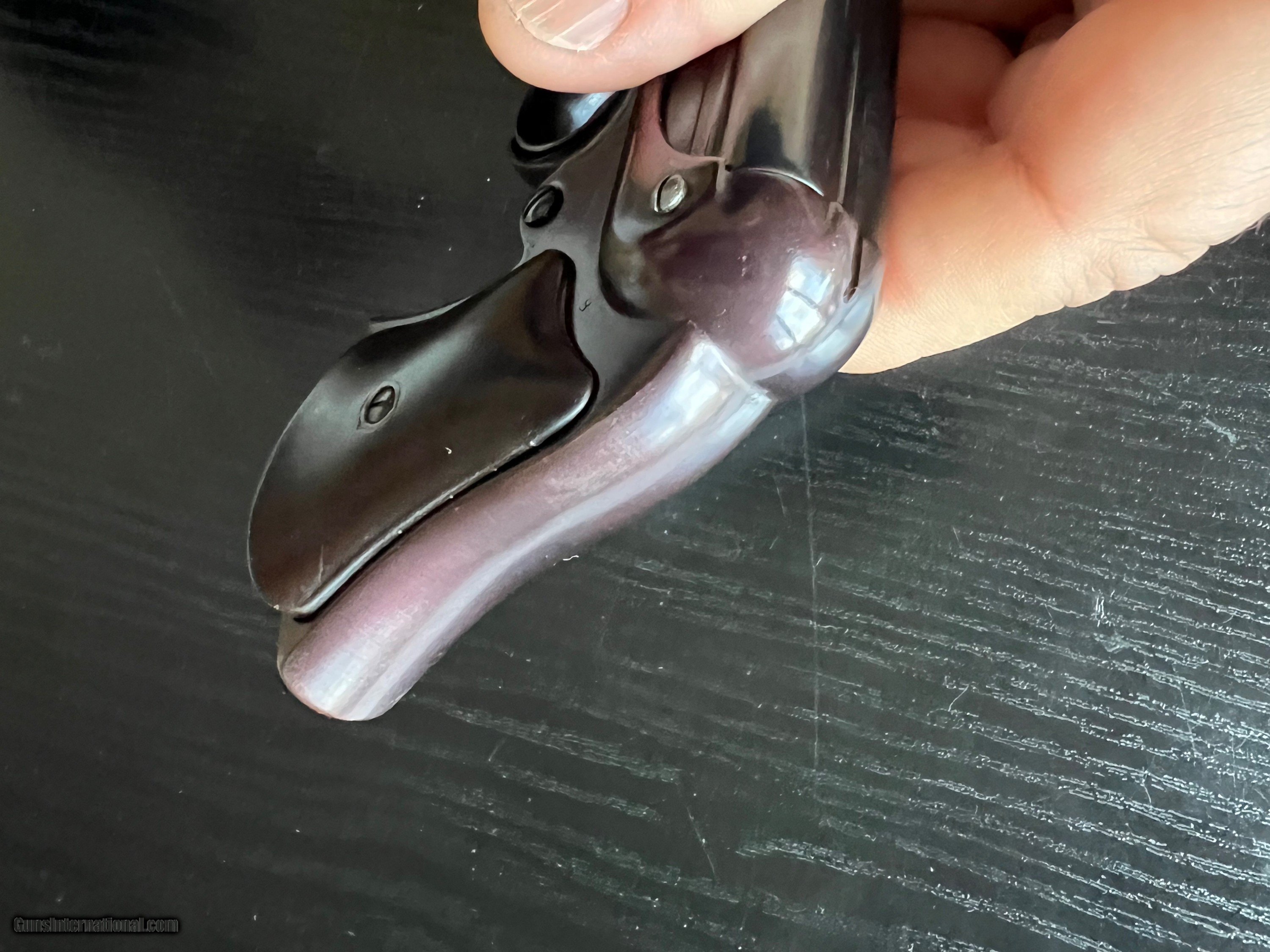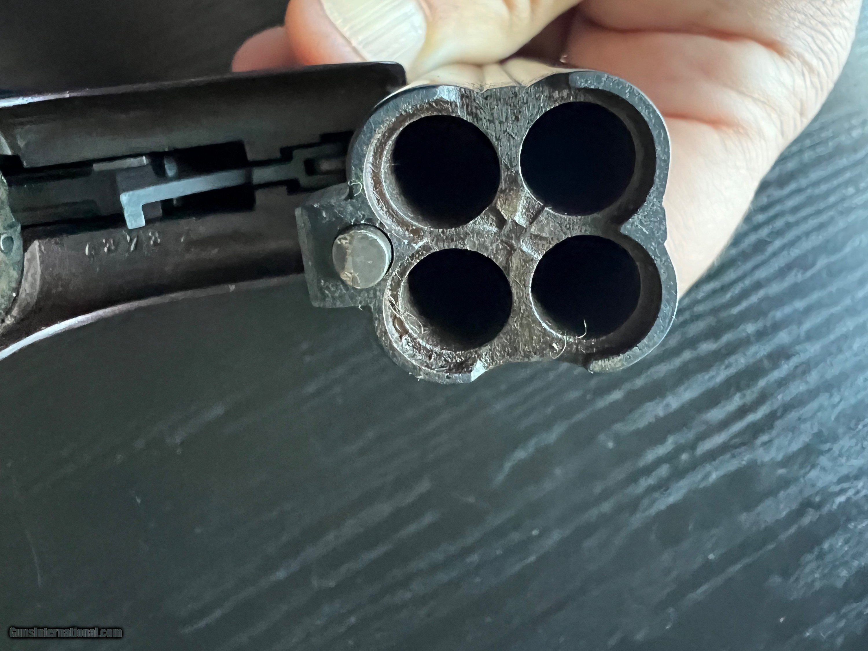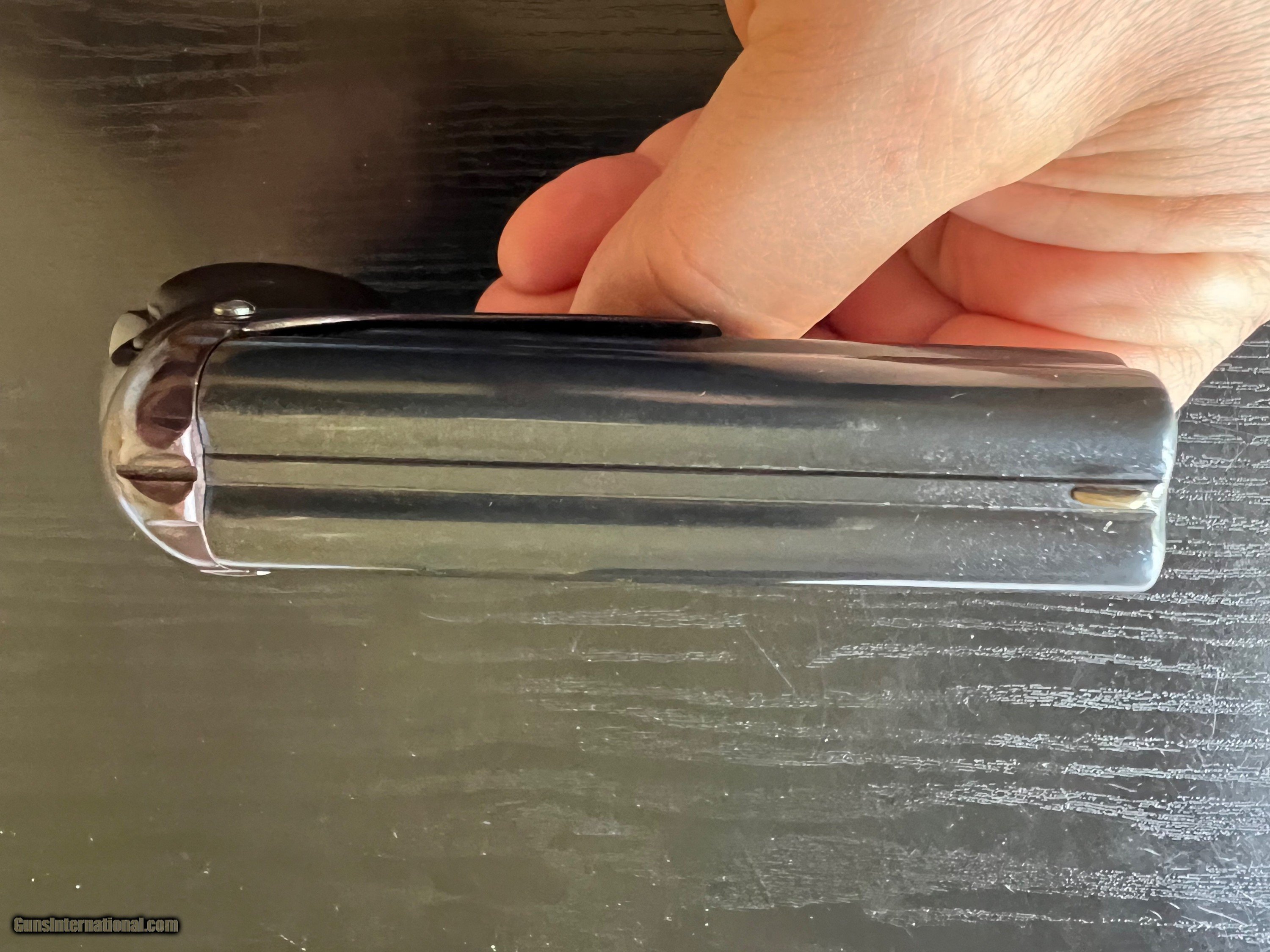 Description: SOLD! This is a very nicely restored antique Remington -Elliot derringer/pepper box pistol - with 4 barrels and a rotating firing pin. Matching numbers. Chambered in .32RF Derringer. All the markings are present. Excellent condition original grips. Dry fires. Good rifling with mild peppering inside the bores. The barrels are finished in rust blue and the frame has a very pleasant plum color blue on it, making for a beautiful contrasting color appearance. These were made in 1860s and were easily concealable and thus very popular among card players in American West. 3-day islnspection. No FFL necessary unless required by your state or locality. Free shipping in Conus. SOLD Antique: Yes |
