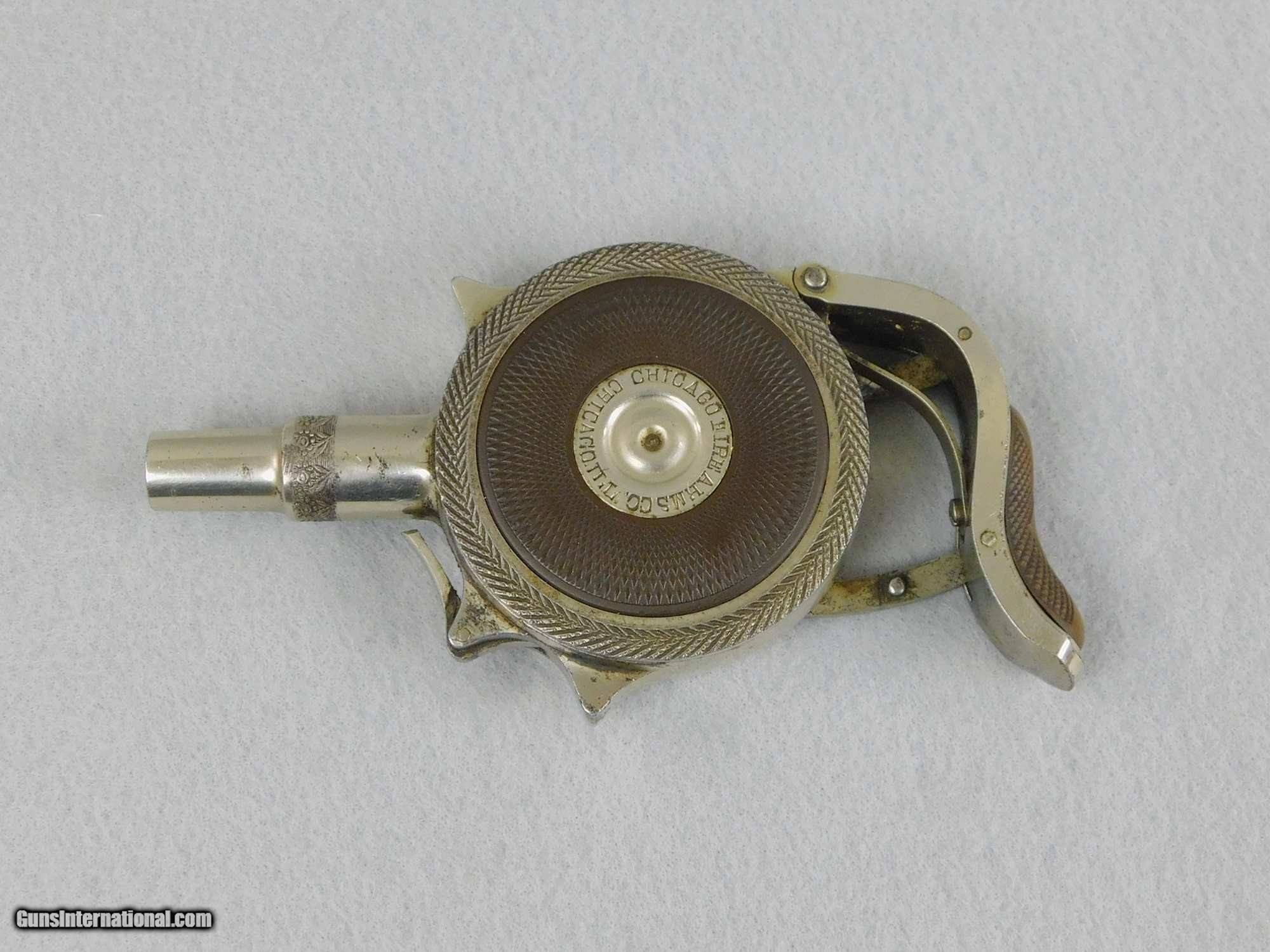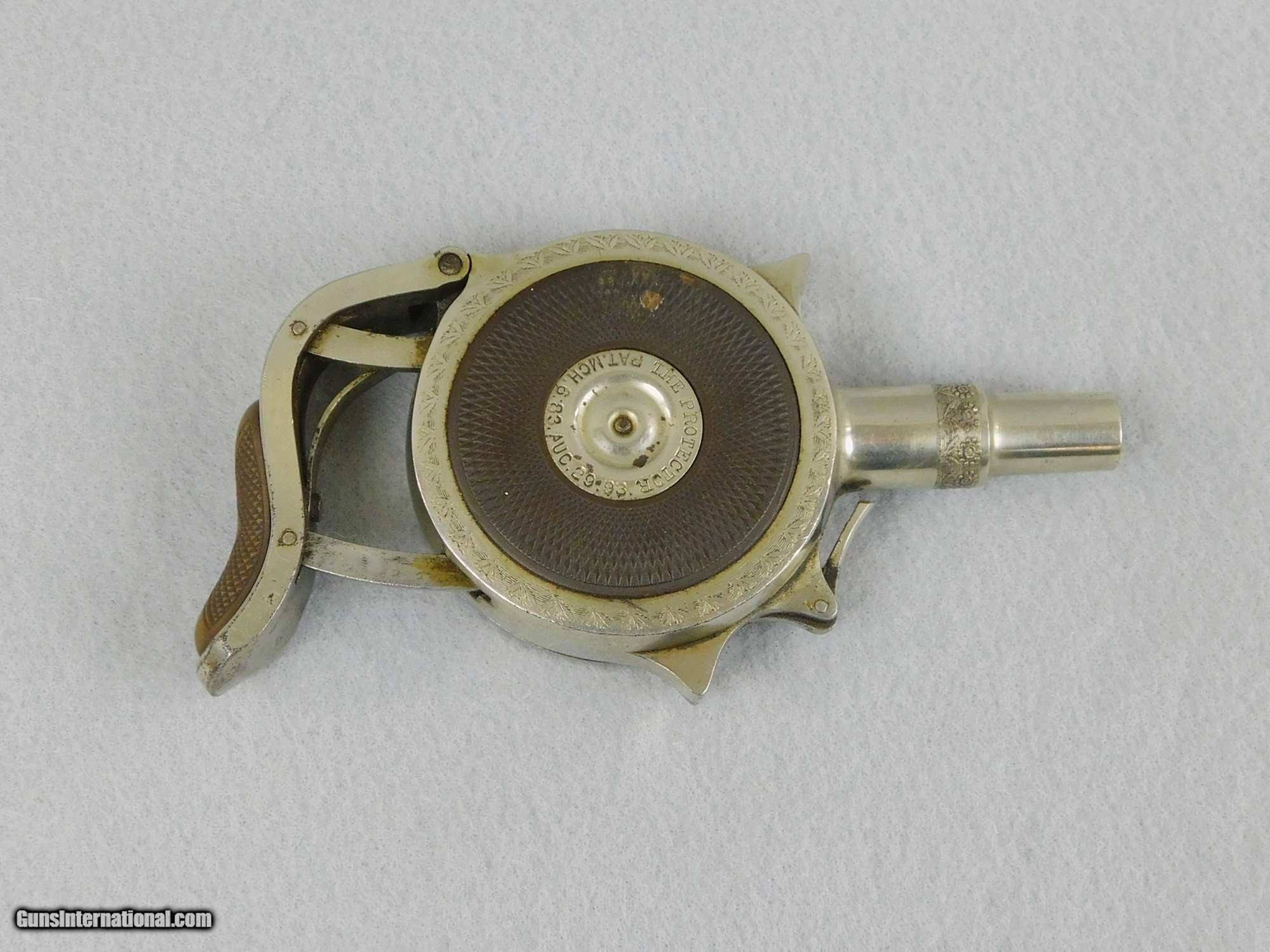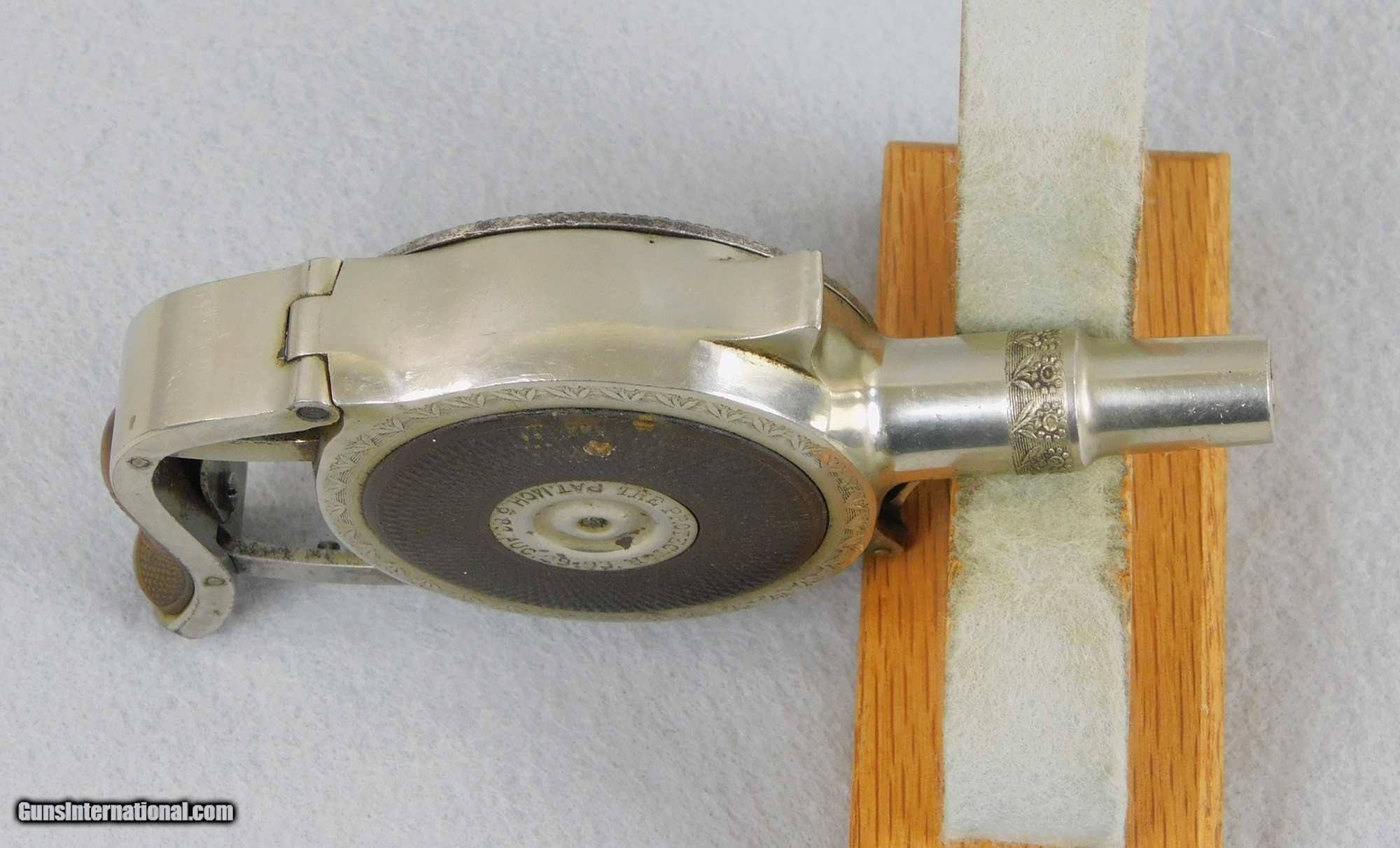 Description: This is a 32 extra short rimfire Chicago Palm Pistol. It retains over 75% original nickel finish. The serial number is 6915 and is matching numbers. The mechanical function is very good crisp and tight. They were made in the earl 1890s and only 12,800 were made. I would consider trades for pre 1899 ANTIQUE PISTOLS and rifles on any of my items.. WHAT DO YOU HAVE TO TRADE? Ask about our 30-90 day lay-away program. We accept Bank Check, Money order, Personal checks or wire transfer. SOLD Antique: Yes Manufacturer: Chicago Firearms Co Serial Number: 6915 |