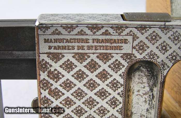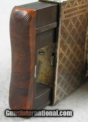 Description: This is a very unusual 8mm Gaulois caliber French Squeezer Palm Pistol. The barrel is engraved MITRAILLEUSE on the top. This is number 309 stamped on the bottom of the barrel. The right side is maker marked “MANUFACTURE FRANCAISE-D’ARMES DE ST. On the frame has a fine geometric pattern on all sides and finished in a silver and gold color finish. The grip is mottled orange black-checkered hard rubber material. The left side has a three-position switch for safe, fire and unload and disassembly. The finish is at between 85 and 90%. The bore and mechanical function is very good. The caliber is a strange 8mm centerfire that was long ago obsolete. This was made about 1891 or 1892 and is first year production. I would consider trades for pre 1899 ANTIQUE PISTOLS and rifles on any of my items.. WHAT DO YOU HAVE TO TRADE? Ask about our 30-90 day lay-away program. We accept Bank Check, Money order, Personal checks or wire transfer. SOLD Antique: Yes Manufacturer: Mitraillesue Model: French Palm Pistol Serial Number: 309 Caliber Info: 8mm Gaulois |