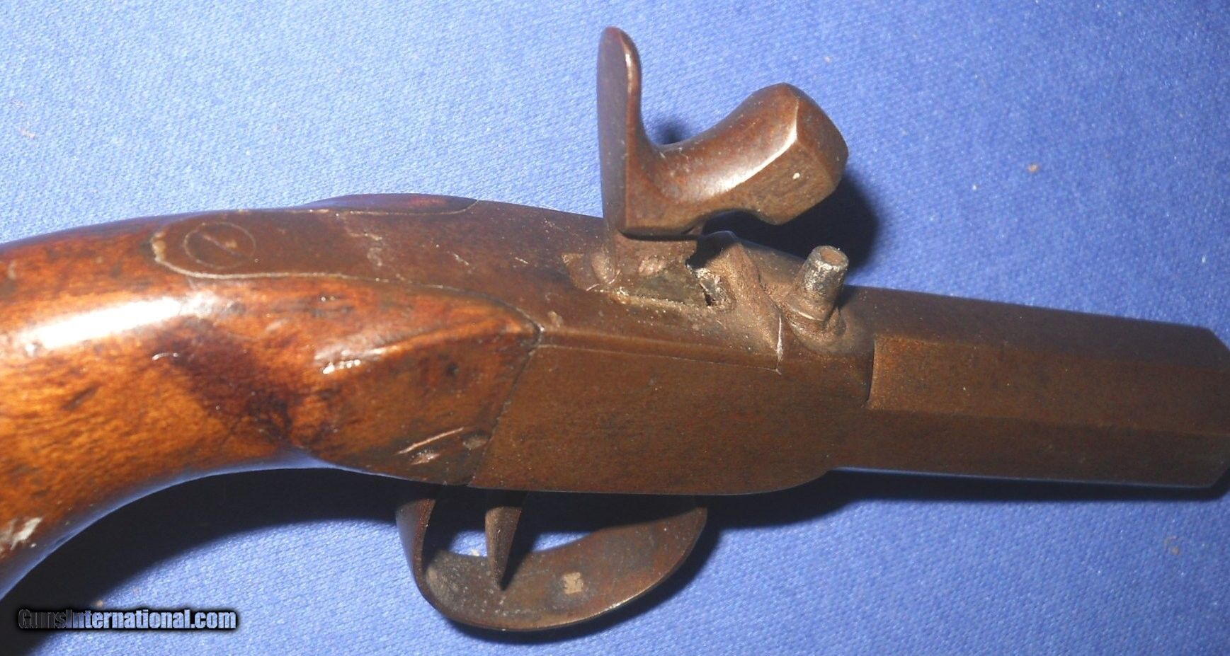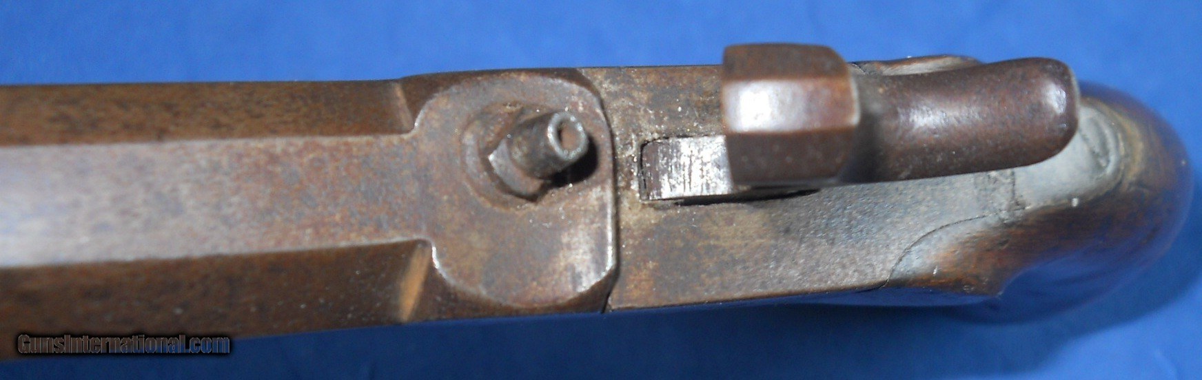 Description: UNUSUAL FORM COMPLETLY UNMARKED ANTIQUE 1840-1850 BIG BORE PERCUSSION .45 CALIBER POCKET PISTOL. ABOUT 6 5/8" OVERALL WITH 2 1/4" SMOOTHBORE OCTAGON BARREL, BORE & NIPPLE ARE CLEAR. METAL SURFACES A SMOOTH BROWN PATINA SHOWING NO PITTING, FEW LIGHT DINGS FROM THE AGES. WALNUT BAG SHAPE GRIP RATES VERY GOOD, NO CRACKS, OLD FINISH SHOWING NO EVIDENCE OF SANDING, FEW EXPECTED HANDLING MARKS. ACTION IS CRISP & ROBUST WITH 2 CLICK HAMMER. POSSIBLY A MEXICAN or CIVIL WAR HIDEOUT PISTOL. OVERALL A FINE EXAMPLE, AS PICTURED. M 27 $12.00 S&H DIRECT TO BUYER ANYWHERE THAT'S OK. NO LICENSE NEEDED. SEE ALL "ESTATE ANTIQUES" LISTINGS FOR MORE GOODIES AT REALISTIC PRICES. SOLD Antique: Yes Manufacturer: UNMARKED Model: CENTER HAMMER Bore: LIGHT OXIDATION Chambers: CLEAR Condition: VERY GOOD PLUS Metal Condition: ORIGINAL Wood Condition: VERY GOOD Barrel Type: OCTAGON Action: CRISP & TIGHT Triggers: SINGLE Stock: WALNUT Finish: ORIGINAL AGED Manufacture Date: 1840-1860s ERA |