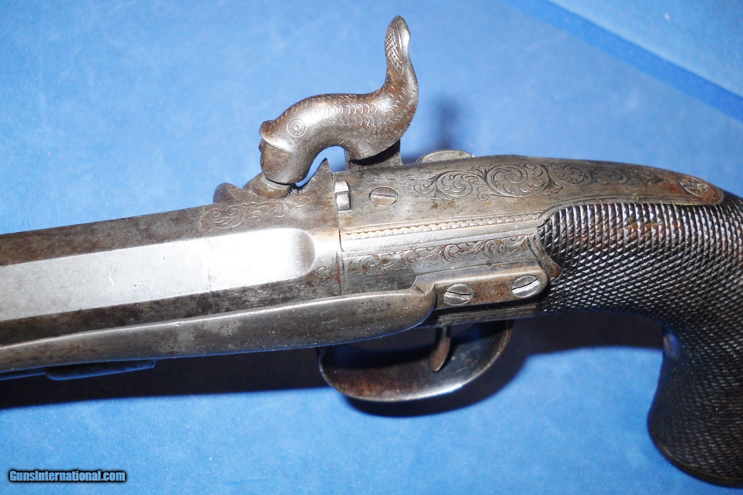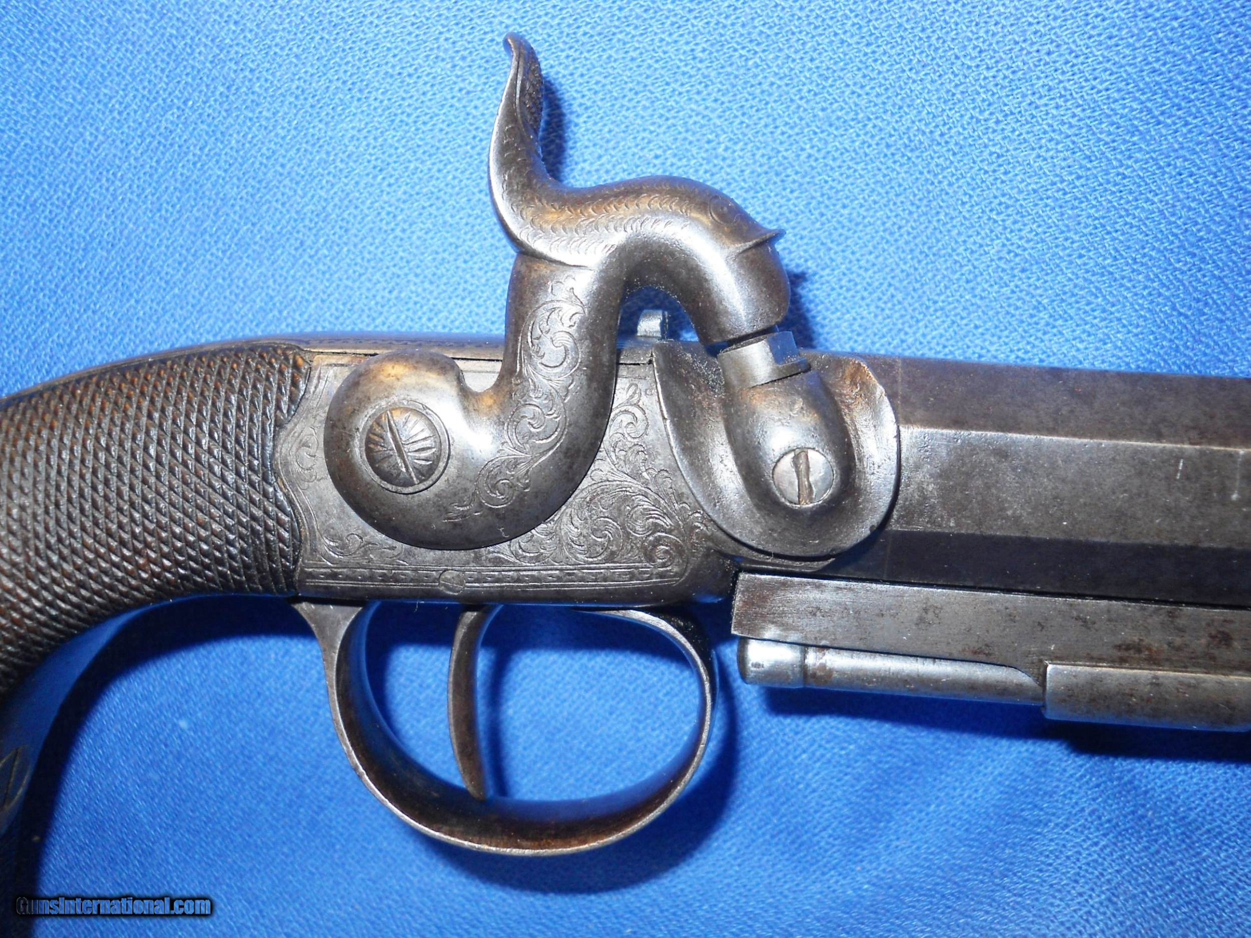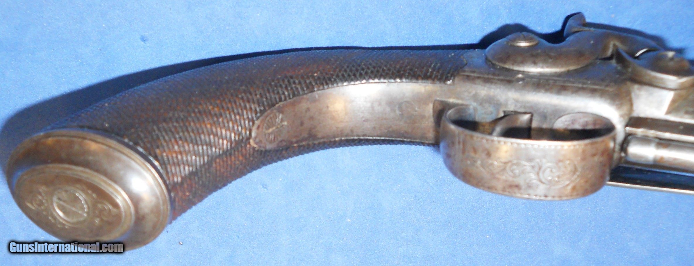 Description: ANTIQUE UNMARKED 1840s ERA BRITISH PROOFED PERCUSSION .54 CALIBER BIG BORE BELT PISTOL OF QUALITY. 5 1/2" OCTAGON BARREL, VERY GOOD SMOOTH BORE WITH SOME LIGHT OXIDATION THAT SHOULD CLEAN. METAL SURFACES HAVE MOSTLY TONED TO A MEDIUM PEWTER GRAY PATINA WITH SCATTERED FRECKLING. BEAUTIFULLY ENGRAVED TRIGGERGUARD, FRAME & FISH HEAD HAMMER SHOW FAINT AREAS OF ORIGINAL CASE COLORS ON PROTECTED AREAS. CHECKERED WALNUT GRIP IN FINE CONDITION, GERMAN SILVER MONOGRAM PLATE, LIGHT WEAR AND A FEW SMALL MINOR DINGS. LOCK IS CRISP AS NEW WITH 2 CLICK HAMMER. A VERY NICE USEABLE BRITISH BELT PISTOL OVERALL, AS PICTURED. SHIPS DIRECT TO BUYER ANYWHERE ALLOWED. S&H $20.00 PRIORITY INSURED. INTERNATIONAL $40.00. SOLD Antique: Yes Manufacturer: UNKNOWN BRITISH Caliber Info: .54 |