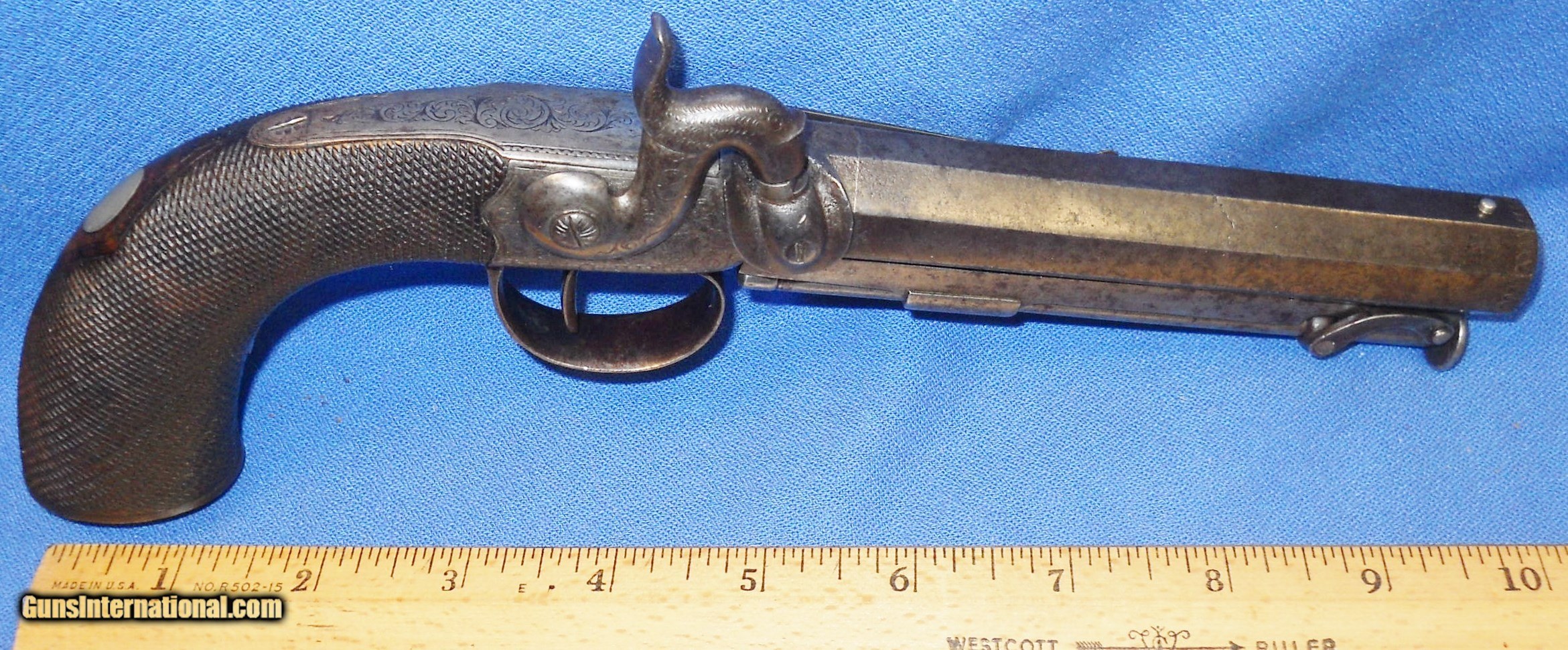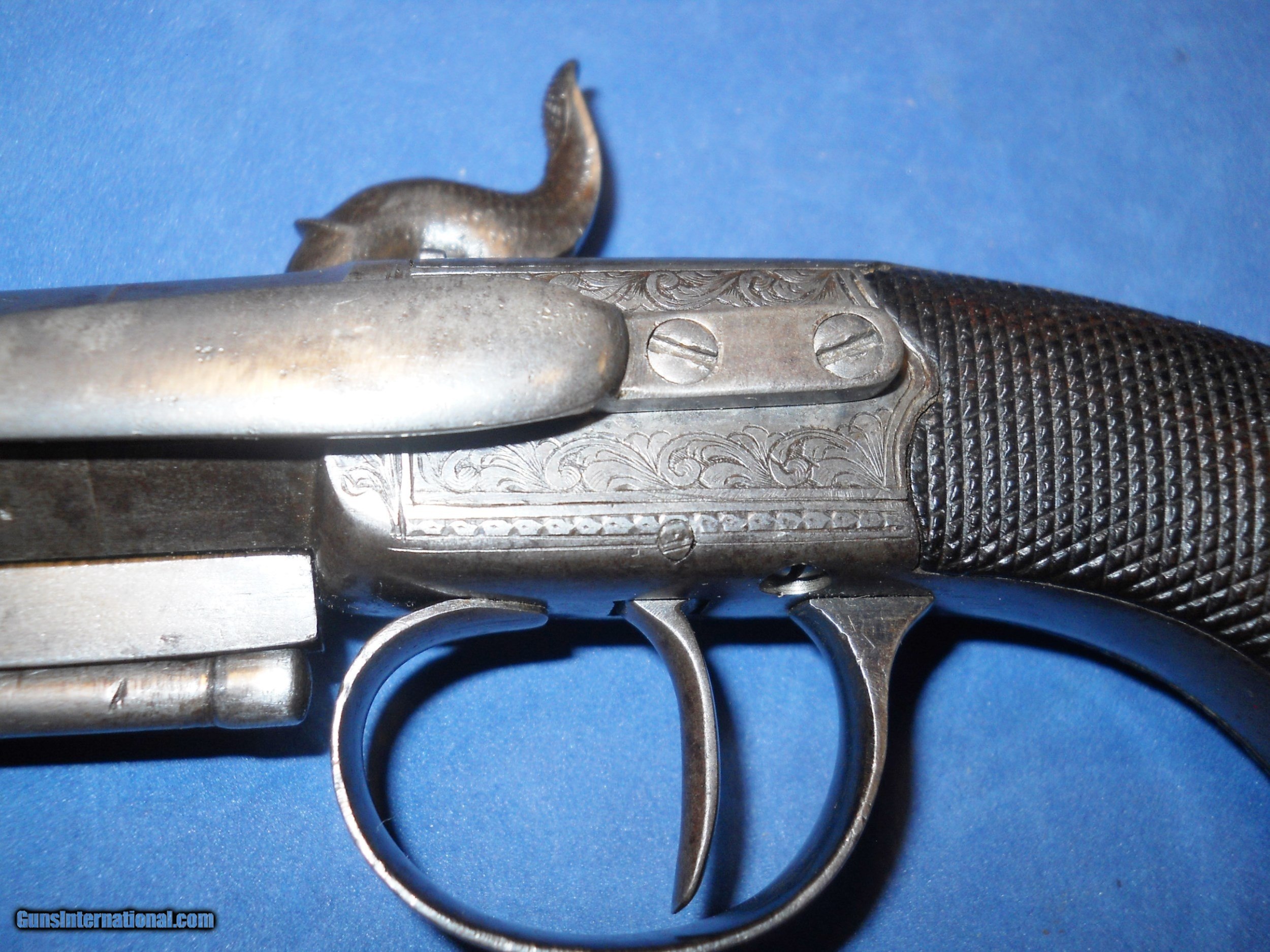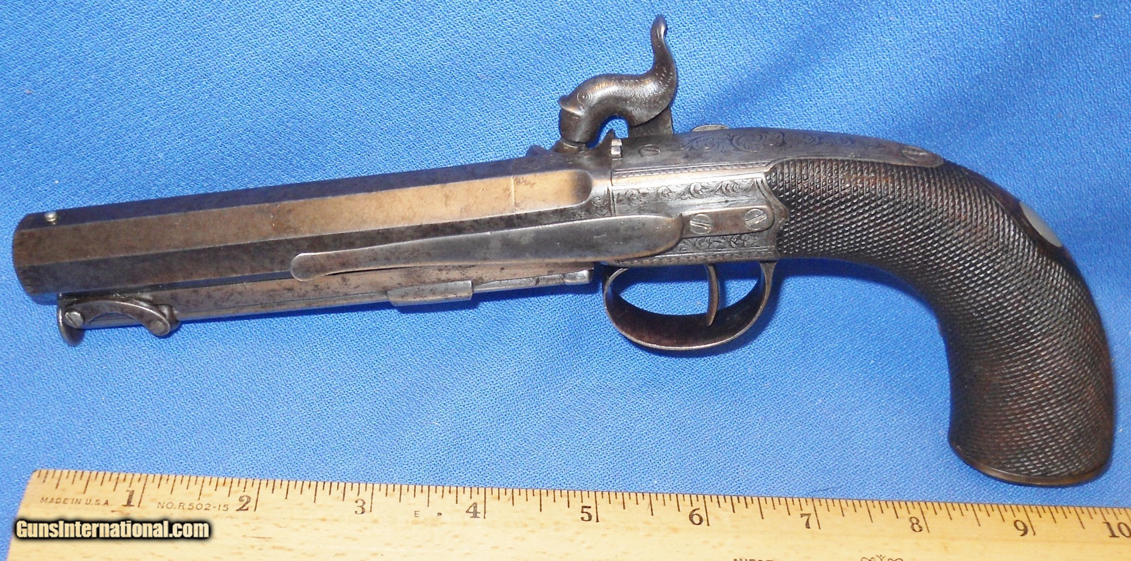 Description: ANTIQUE UNMARKED 1840s ERA BRITISH PROOFED PERCUSSION .54 CALIBER BIG BORE BELT PISTOL OF QUALITY. 5 1/2" OCTAGON BARREL, VERY GOOD SMOOTH BORE WITH SOME LIGHT OXIDATION THAT SHOULD CLEAN. METAL SURFACES HAVE MOSTLY TONED TO A MEDIUM PEWTER GRAY PATINA WITH SCATTERED FRECKLING. BEAUTIFULLY ENGRAVED TRIGGERGUARD, FRAME & FISH HEAD HAMMER SHOW FAINT AREAS OF ORIGINAL CASE COLORS ON PROTECTED AREAS. CHECKERED WALNUT GRIP IN FINE CONDITION, GERMAN SILVER MONOGRAM PLATE, LIGHT WEAR AND A FEW SMALL MINOR DINGS. LOCK IS CRISP AS NEW WITH 2 CLICK HAMMER. A VERY NICE USEABLE BRITISH BELT PISTOL OVERALL, AS PICTURED. SHIPS DIRECT TO BUYER ANYWHERE ALLOWED. S&H $20.00 PRIORITY INSURED. INTERNATIONAL $40.00. SOLD Antique: Yes Manufacturer: UNKNOWN BRITISH Caliber Info: .54 |