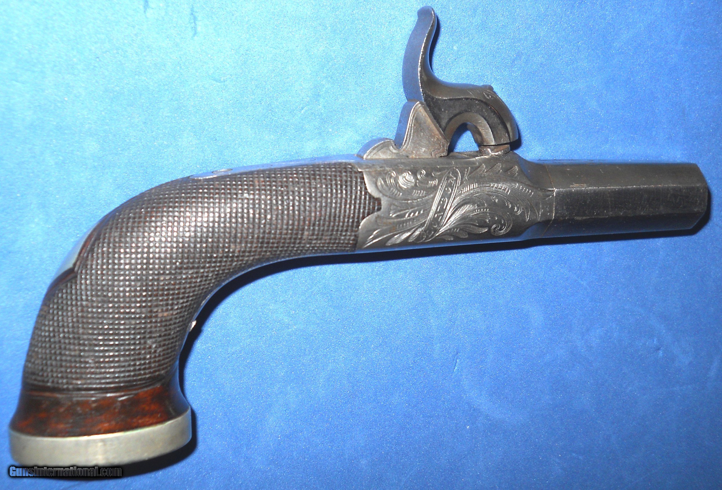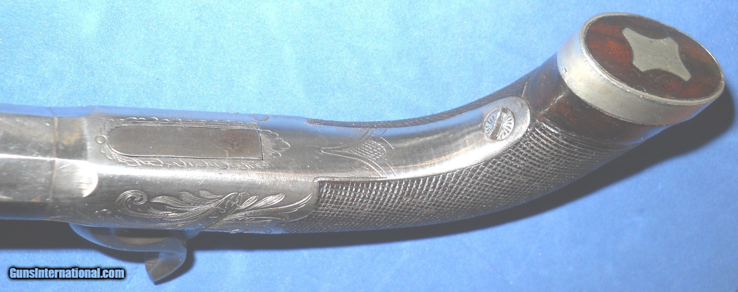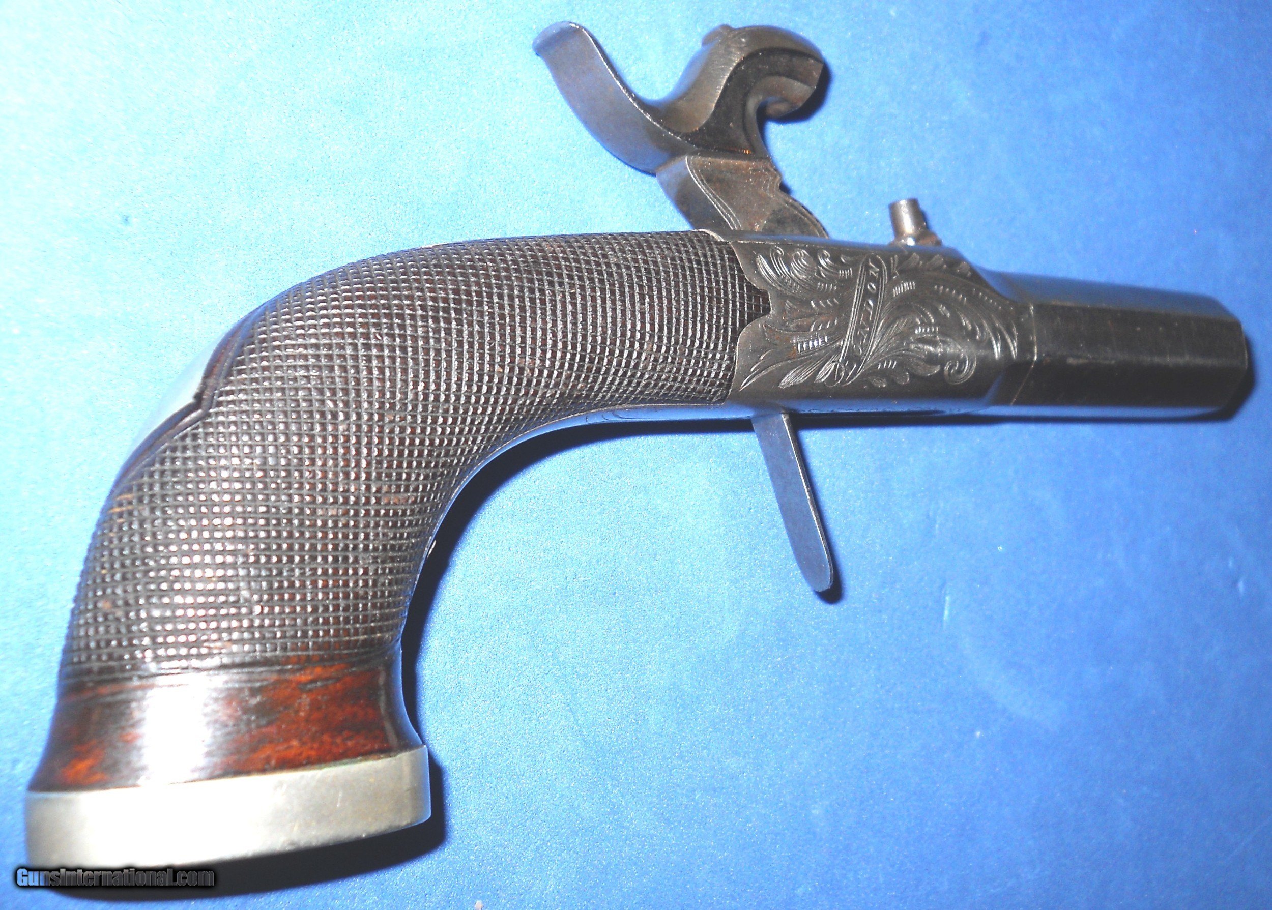 Description: MARKED "SHARPE" LONDON CIRCA 1840s BIG BORE PERCUSSION HIDDEN FOLDING TRIGGER POCKET DERRINGER or MUFF PISTOL 6 1/2" OVERALL. 2" .52 CALIBER OCTAGON BARREL WITH MICRO-GROOVE RIFLING IN SHOOTABLE CONDITION. GERMAN SILVER GRIP SURROUND & MONOGRAM PLATES. A HIGH QUALITY PISTOL IN FINE TO EXCELLENT CONDITION OVERALL, AS PICTURED & FOUND. M33 $ 11.00 S&H DIRECT TO BUYER ANYWHERE THAT'S OK. NO LICENSE NEEDED. BRINGING YOU THE BEST FOR LESS FROM OLD TIME COLLECTIONS & ESTATES. SOLD Antique: Yes Manufacturer: SHARPE - LONDON Model: POCKET-MUFF Barrel Length: 1 3/4 Bore: MICRO GROVE RIFLING Chambers: CLEAR Condition: EXCELLENT Metal Condition: BRIGHT Wood Condition: EXCELLENT Bore Condition: VERY GOOD Barrel Type: OCTAGON Action: CRISP & TIGHT Triggers: FOLDING Stock: WALNUT CHECKERED Finish: ORIGINAL AGED Weight: 8 oz Manufacture Date: 1840s ERA Engraving: HAND ENGRAVED |