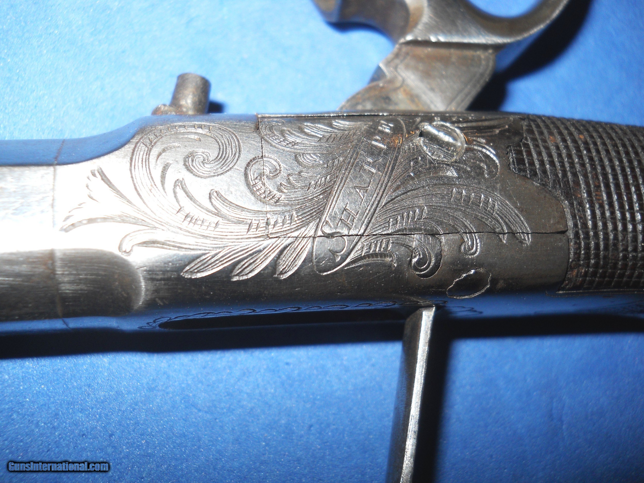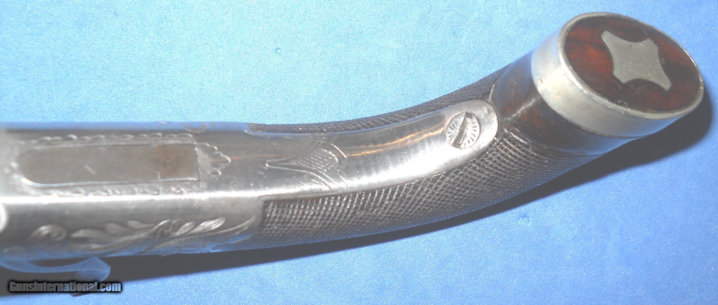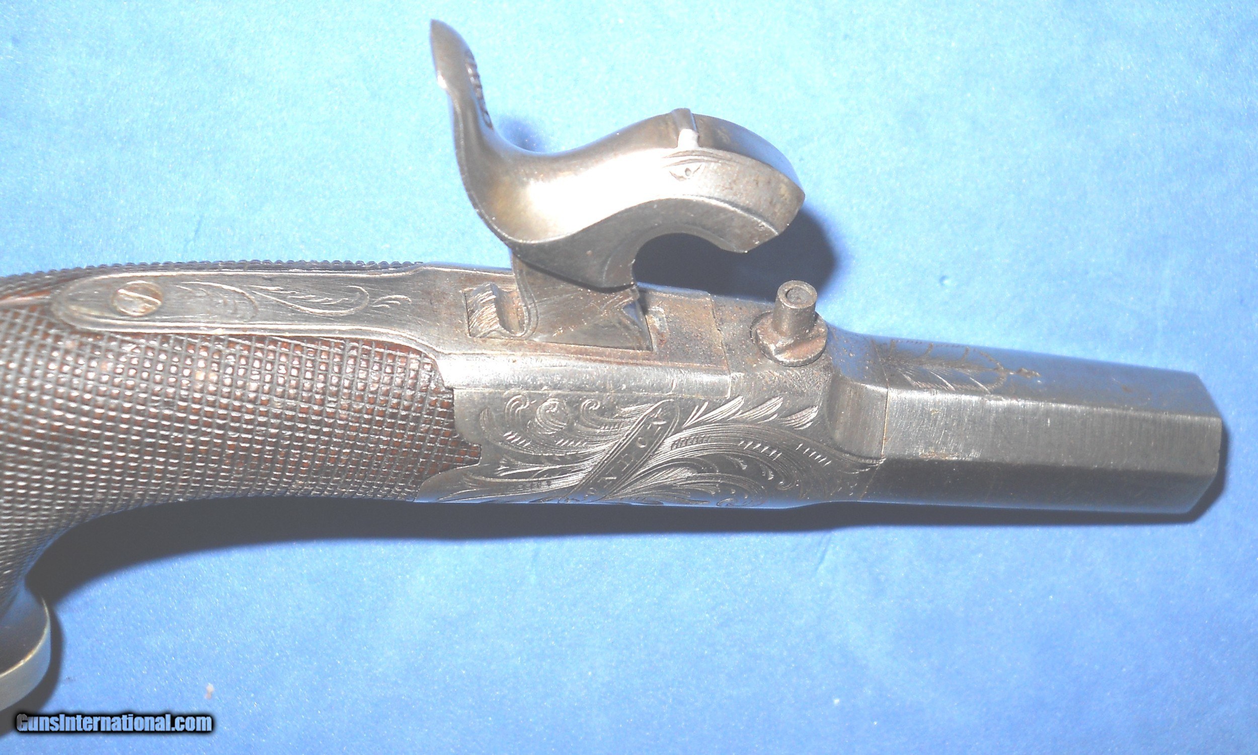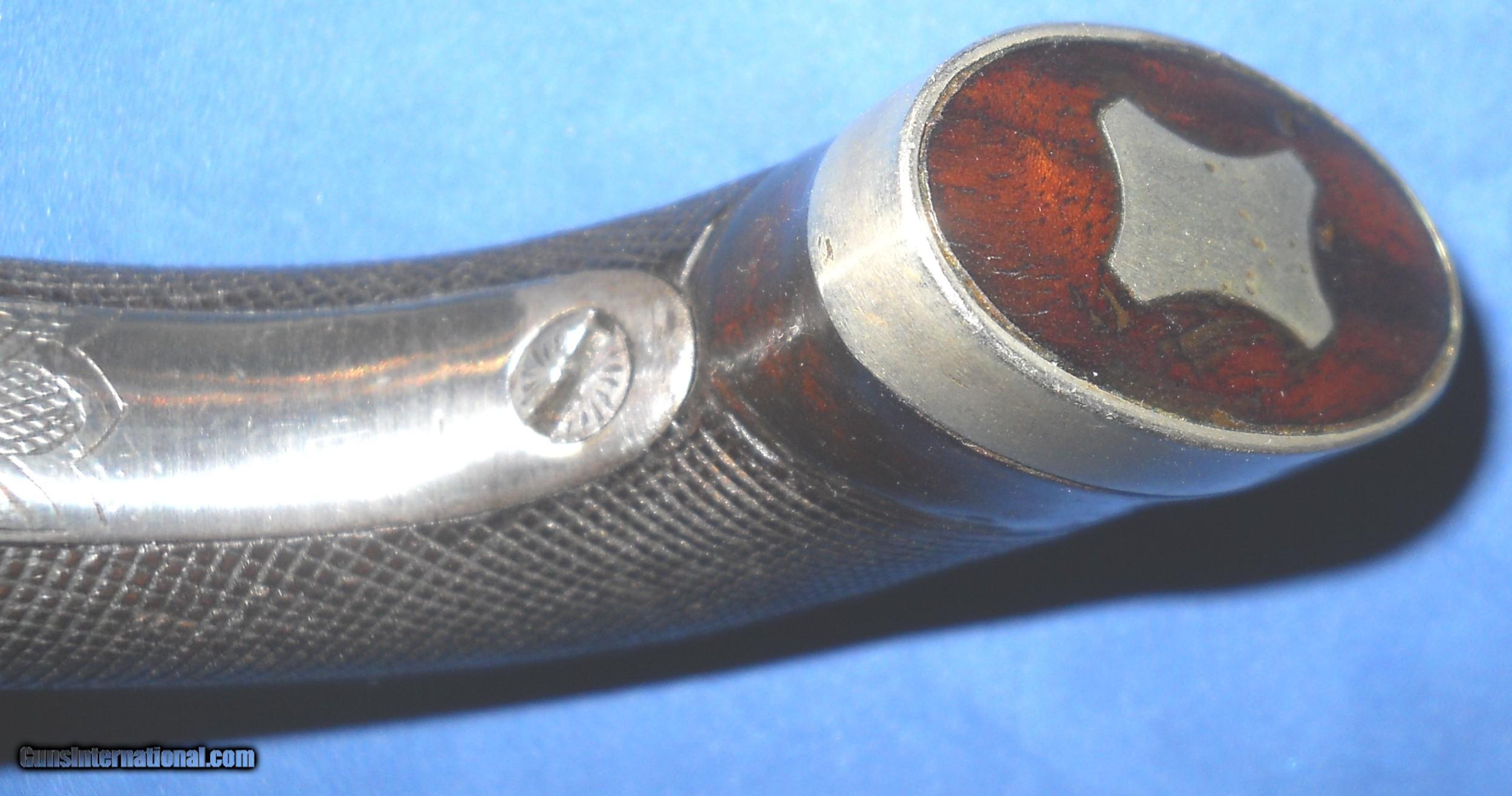 Description: MARKED "SHARPE" LONDON CIRCA 1840s BIG BORE PERCUSSION HIDDEN FOLDING TRIGGER POCKET DERRINGER or MUFF PISTOL 6 1/2" OVERALL. 2" .52 CALIBER OCTAGON BARREL WITH MICRO-GROOVE RIFLING IN SHOOTABLE CONDITION. GERMAN SILVER GRIP SURROUND & MONOGRAM PLATES. A HIGH QUALITY PISTOL IN FINE TO EXCELLENT CONDITION OVERALL, AS PICTURED & FOUND. M33 $ 11.00 S&H DIRECT TO BUYER ANYWHERE THAT'S OK. NO LICENSE NEEDED. BRINGING YOU THE BEST FOR LESS FROM OLD TIME COLLECTIONS & ESTATES. SOLD Antique: Yes Manufacturer: SHARPE - LONDON Model: POCKET-MUFF Barrel Length: 1 3/4 Bore: MICRO GROVE RIFLING Chambers: CLEAR Condition: EXCELLENT Metal Condition: BRIGHT Wood Condition: EXCELLENT Bore Condition: VERY GOOD Barrel Type: OCTAGON Action: CRISP & TIGHT Triggers: FOLDING Stock: WALNUT CHECKERED Finish: ORIGINAL AGED Weight: 8 oz Manufacture Date: 1840s ERA Engraving: HAND ENGRAVED |