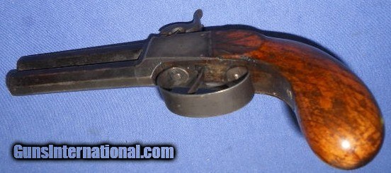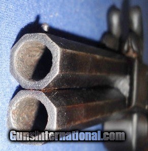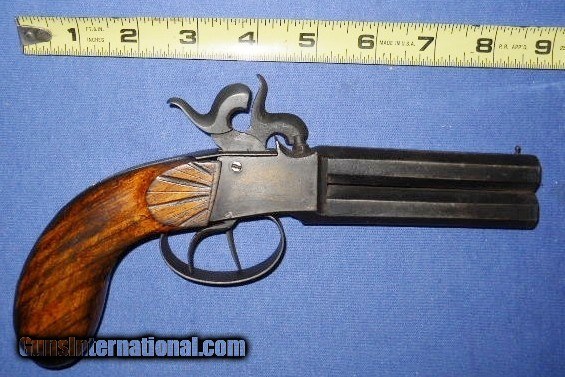 Description: UNMARKED UNUSUAL STYLE BELGIUM ? PERCUSSION DOUBLE BARREL OVER-UNDER PISTOL. ABOUT .41 CALIBER. 8 3/4" OVERALL, 3 1/2" OCTAGON BARRELS, LIGHT OXIDATION, PITTING or ERROSION ABOUT 1/2" IN AT MUZZLES. BORES ARE RELATIVELY SMOOTH, NIPPLES & CHAMBERS ARE CLEAR. WALNUT STOCK IN VERY GOOD CONDITION, MINIMAL HANDLING MARKS or WEAR. 2 CLICK HAMMERS ARE CRISP AND IN TIME. GREAT CONVERSATION PIECE, AS PICTURED. $22.00 S&H INSURED FOR $200.00 DIRECT TO U.S. BUYER ANYWHERE THAT'S OK. SEE ALL "ESTATE ANTIQUES" LISTINGS FOR MORE FROM OLD COLLECTIONS & ESTATES. SOLD Antique: Yes Manufacturer: UNMARKED Model: OVER-UNDER Serial Number: NONE Barrel Length: 3 1/2 Chambers: CLEAR Condition: VERY GOOD AS PICTURED Metal Condition: AGED Wood Condition: VERY GOOD Bore Condition: GOOD to FAIR Barrel Type: OCTAGON Action: CRISP Triggers: DOUBLE Finish: SMOOTH AGED Weight: 1 lb Sights: ORIGINAL Manufacture Date: 1840s - 1850s |