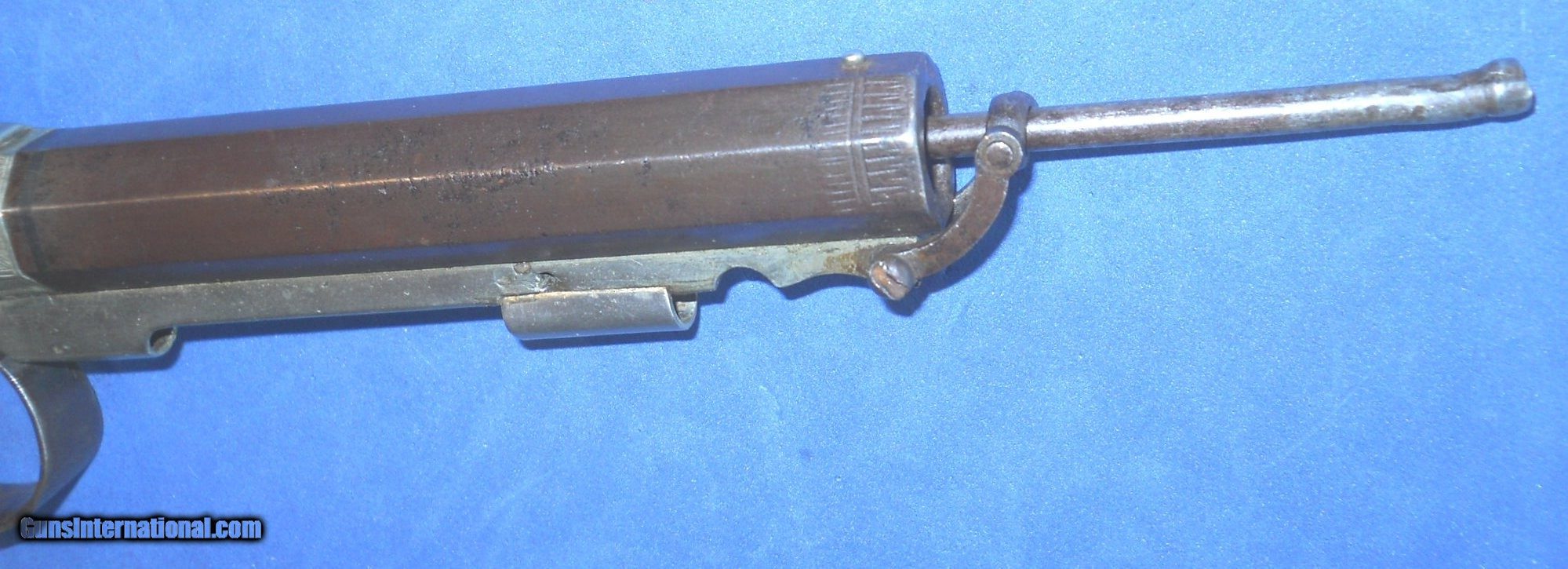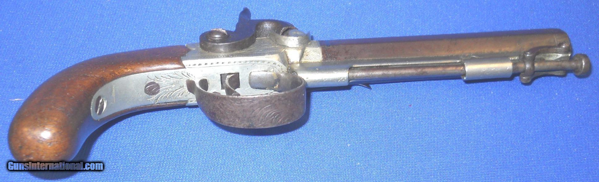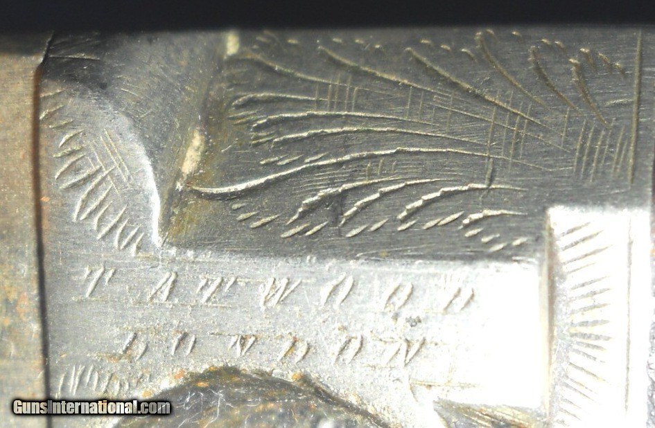 Description: HIGH QUALITY .41 CALIBER PERCUSSION BELT PISTOL BY "T. ATWOOD" LONDON. ABOUT 8 1/4" OVERALL WITH 4" BARREL WITH ORIGINAL BROWN FINISH & TARNISHED SILVER BAND FORWARD OF BREECH. FRAME & RAMROD SLIDE OF GERMAN SILVER, ACTION IN EXCELLENT WORKING ORDER, CRISP & ROBUST WITH 2 CLICK HAMMER. UNUSUAL STYLE WALNUT GRIP OF SMALL SIZE, NO CRACKS, MINIMAL HANDLING MARKS. BIRMINGHAM PROOF MARKS ON LEFT SIDE UNDER THE BELT HOOK. SWIVEL RAMROD FULLY FUNCTIONAL. VERY NICE PISTOL, AS PICTURED & FOUND. M17 $16.00 S&H DIRECT TO BUYER ANYWHERE THAT'S OK. SEE ALL "ESTATE ANTIQUES" LISTINGS FOR MORE GREAT ITEMS AT SENSIBLE PRICES. SOLD Antique: Yes Manufacturer: T. ATWOOD Model: BELT Barrel Length: 4 Chambers: CLEAR Condition: NRA FINE Metal Condition: ORIGINAL Wood Condition: FINE Barrel Type: OCTAGON Action: CRISP & TIGHT Triggers: FOLDING Stock: WALNUT Finish: ORIGINAL AGED Sights: ORIGINAL Manufacture Date: 1840s 1850s ERA Engraving: HAND ENGRAVED |
