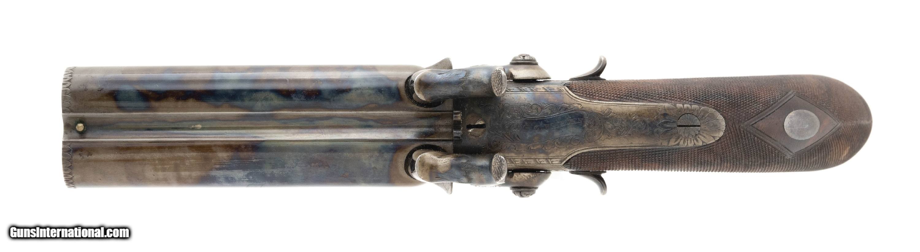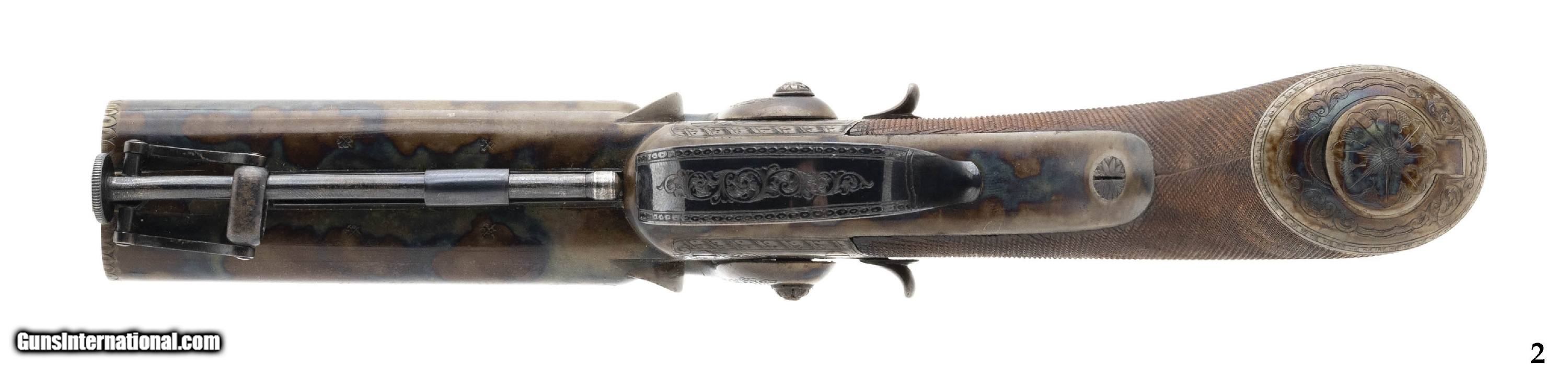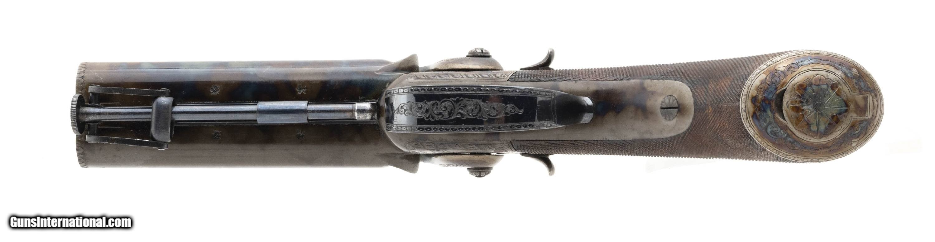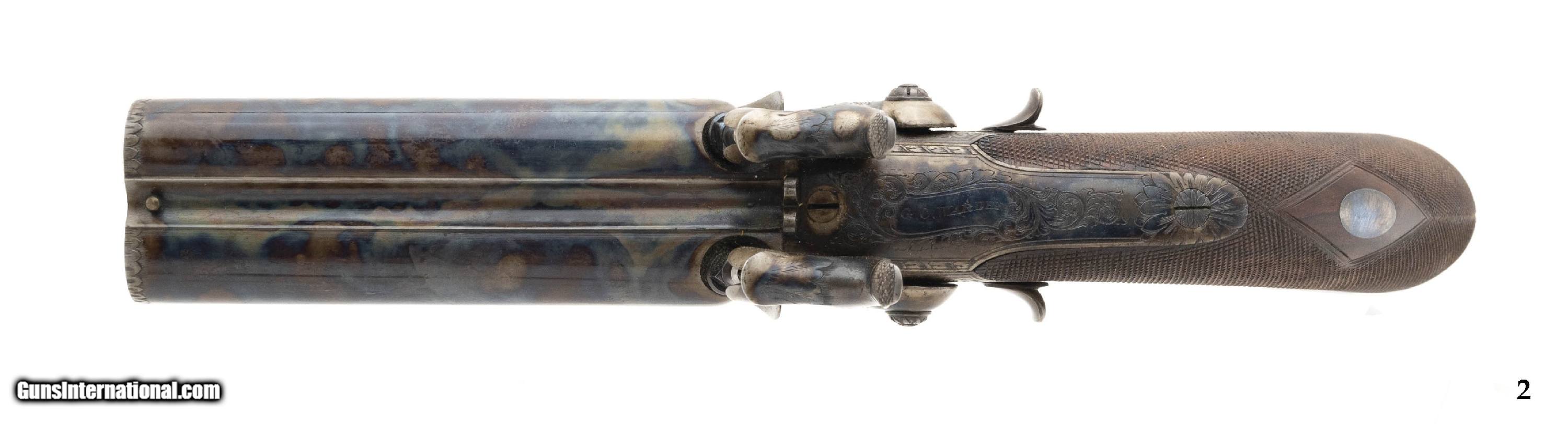 Description: "Made 1840s -1850s. Both guns are 50 caliber with 3 ¾" barrels. Both of these guns are in like new condition with 99%+ of the original case hardened and blue finish. Both of the frame’s, trigger guard’s and butt cap’s are beautifully engraved. The butt caps both have cap traps in the butts. The finish on these guns is beautiful with bright case colors on the barrel and high polish blue on the trigger guard and triggers. Grips are finely checkered. Both guns are in a beautiful case with excellent accoutrements. Case and accoutrements are excellent. The top of each frame is marked “G.C. Warden". This is the presumed maker, but we cannot locate a G. C. Warden in any resources, so G.C. Warden maybe a former owner for who the guns were made for. In any case, this is a fantastic set of beautiful guns in excellent condition! Antique: Yes Price: $12,500.00 Contact Seller |