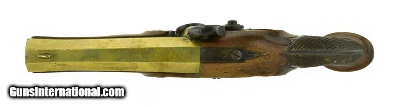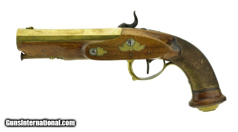 Description: "Belgian Large Frame Brass Barrel Percussion Pistol. 70 Caliber with a 5 ½" octagonal brass barrel. Barrel has a Liege proof on the left hand side of the barrel. Nice sharp gun. Wood has a super sharp checkering and gun is in original condition. Action works perfectly. SOLD Antique: Yes |