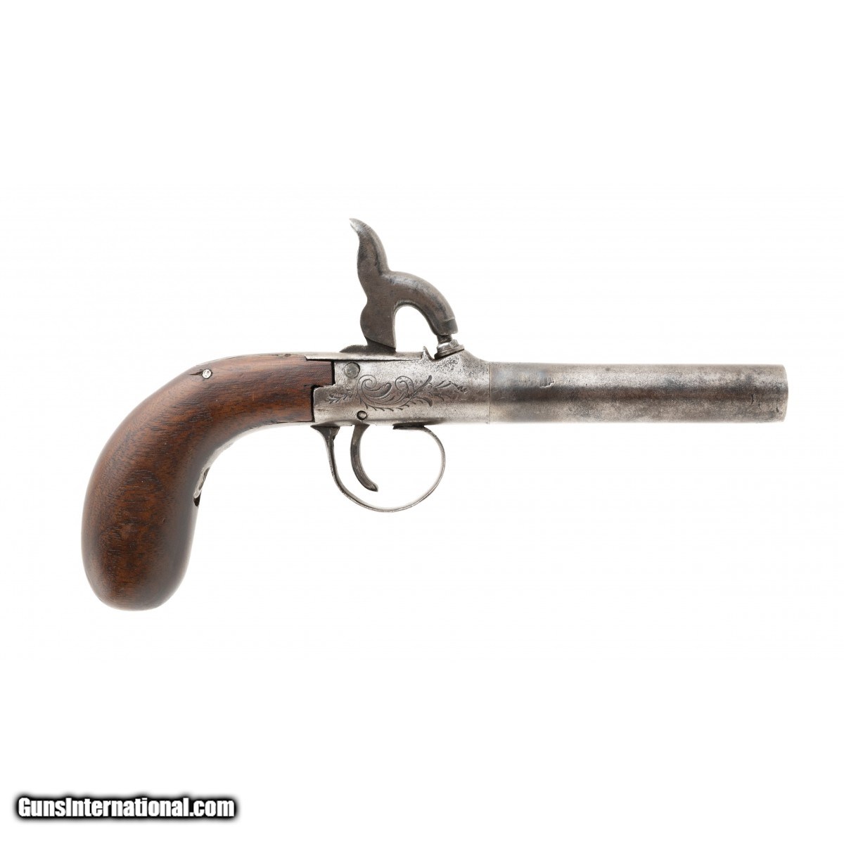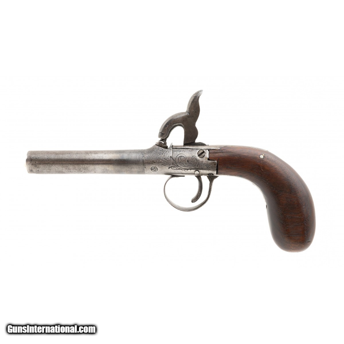 Description: "Made in 1850s. 42 caliber with a 3" turn off barrel. The frame has the Belgian Liege proof. Action works well. The grip appears to be a replacement. SOLD |