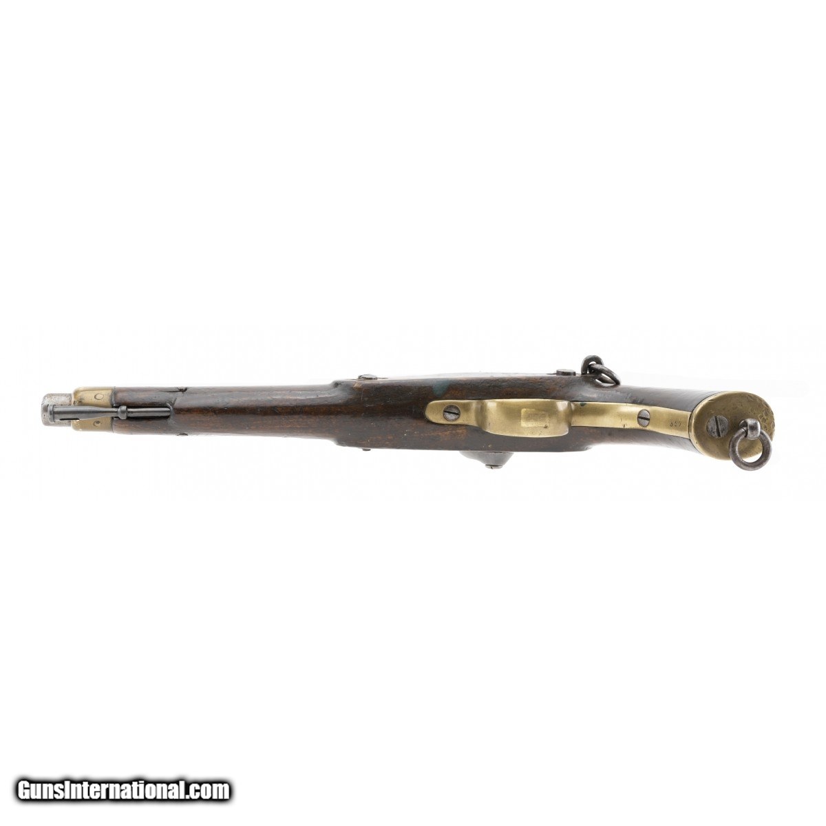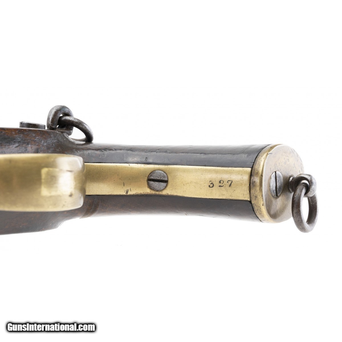 Description: " This very interesting and rarely seen 451 caliber percussion breech-loading Westley Richards Patent ""monkey tail"" pistol with a ramrod is a great example of the transition from percussion to cartridge ignition. The overall length is approx. 15"". The approx. 8.75"" square breech to round barrel has a fine bore with bright, strong rifling with light erosion in the grooves. The barrel has a large blade front sight. There is a rear sighting notch on the rear of the breech. The barrel is marked WHITWORTH PATENT on the top, .451 on the left forward of the breech, and what appears to be .175 on the right. The barrel is smooth and bright with light to medium staining. The breech block has the serial number, 327, two Birmingham proofs, and the bore size (52) marked on the left side. The top left is marked 25 GRAINS. The spring loaded breech lever (""monkey tail"") is marked WESTLEY RICHARDS over PATENT. The lock, which is bright with light staining, is marked WESTLEY RICHARDS & Co in the center and 1867 within a triangle at the tail. The brass nose cap, trigger guard, and butt cap have an even patina. The rear trigger guard strap has the serial number. The trigger face is checkered. The stock is very good with light use dents and dings and no chips or cracks. The butt swivel and ring and side swivel and ring are present. The action functions correctly. This is a very nice example of this interesting action type that is usually seen on rifles. It is rarely seen on pistols such as this one. SOLD Antique: Yes |