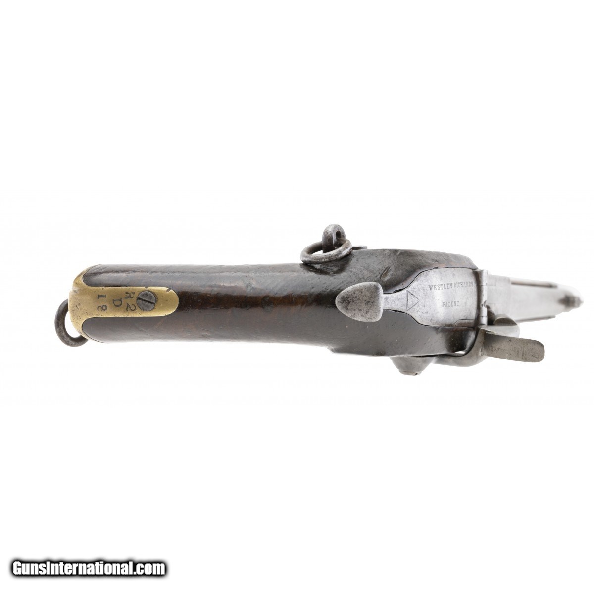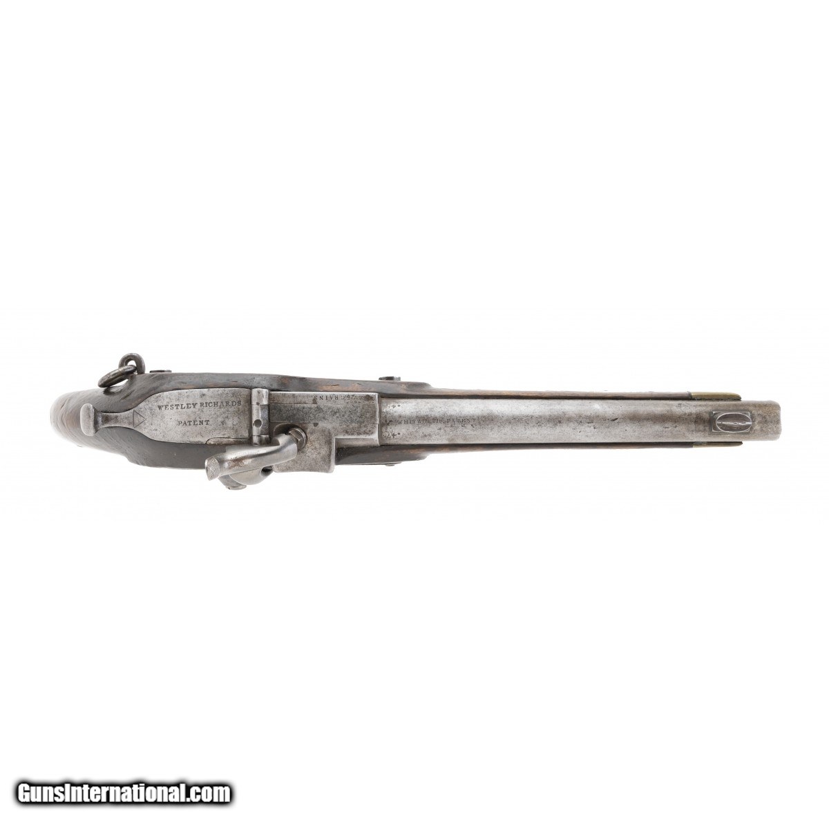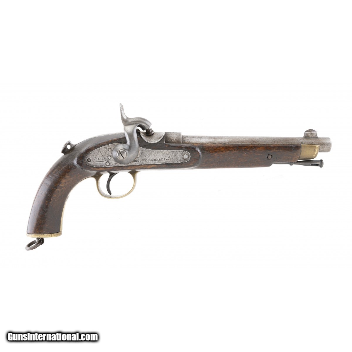 This very interesting and rarely seen 451 caliber percussion breech-loading Westley Richards Patent ""monkey tail"" pistol with a ramrod is a great example of the transition from percussion to cartridge ignition. The overall length is approx. 15"". The approx. 8.75"" square breech to round barrel has a fine bore with bright, strong rifling with light erosion in the grooves. The barrel has a large blade front sight. There is a rear sighting notch on the rear of the breech. The barrel is marked WHITWORTH PATENT on the top, .451 on the left forward of the breech, and what appears to be .175 on the right. The barrel is smooth and bright with light to medium staining. The breech block has the serial number, 327, two Birmingham proofs, and the bore size (52) marked on the left side. The top left is marked 25 GRAINS. The spring loaded breech lever (""monkey tail"") is marked WESTLEY RICHARDS over PATENT. The lock, which is bright with light staining, is marked WESTLEY RICHARDS & Co in the center and 1867 within a triangle at the tail. The brass nose cap, trigger guard, and butt cap have an even patina. The rear trigger guard strap has the serial number. The trigger face is checkered. The stock is very good with light use dents and dings and no chips or cracks. The butt swivel and ring and side swivel and ring are present. The action functions correctly. This is a very nice example of this interesting action type that is usually seen on rifles. It is rarely seen on pistols such as this one.