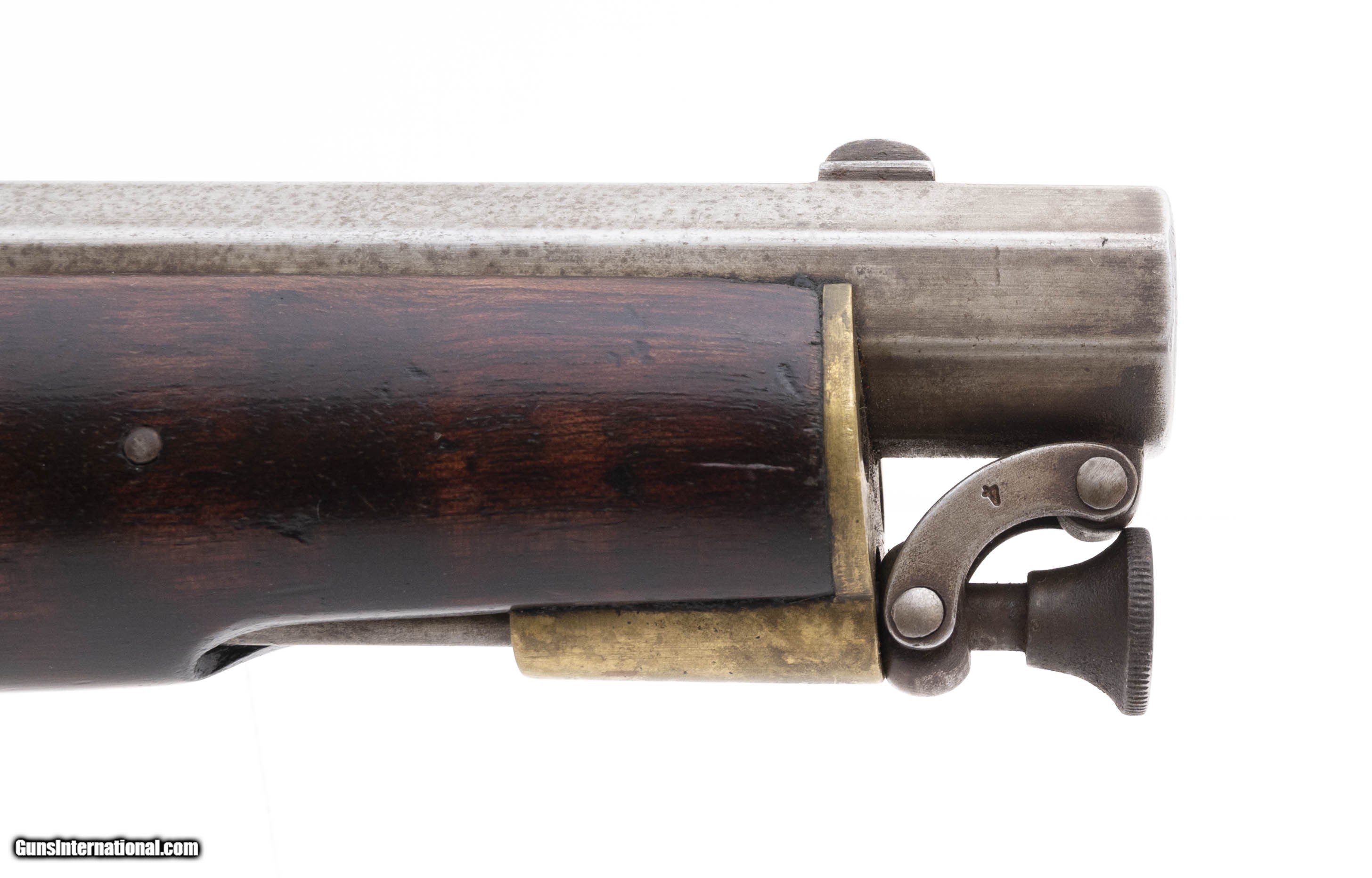 Description: "This 1861 dated British Enfield percussion pistol has an unusual octagon barrel. The overall length is approx. 14.25"". The 8"" octagon 65 caliber smooth bore barrel has a very good bore. The barrel has an iron blade front sight and notched block rear sight. The barrel is marked, reading from the muzzle, with a broad arrow followed by an E over a crown over 18 followed by a crown with an arrow through it followed by a 4 followed by a broad arrow over WD. The barrel is bright with light even spotting. The lock is marked 1861 over ENFIELD with a crown over VR at the tail and crown with an arrow just below the bolster. The lock and hammer are mostly gray. The brass nose cap, ramrod pipe, trigger guard, and butt cap have an even aged patina. This pistol has a sling bar on the left side and a swivel ring on the butt. The captured ramrod is present. The stock is fine with good edges, no cracks no chips, and a crown with arrow on the left flat. The action functions correctly. We are unable to exactly identify this model which generally fits the scarce Pattern 1861 8"" barrel percussion pistol style but which also has similarities to Lancer pistols. The crown with arrow inspection mark ties the lock, stock, and barrel together. This interesting pistol merits further research. (DALLAS LOCATION) Antique: Yes Price: $2,450.00 Contact Seller |