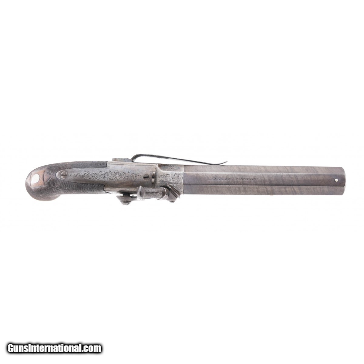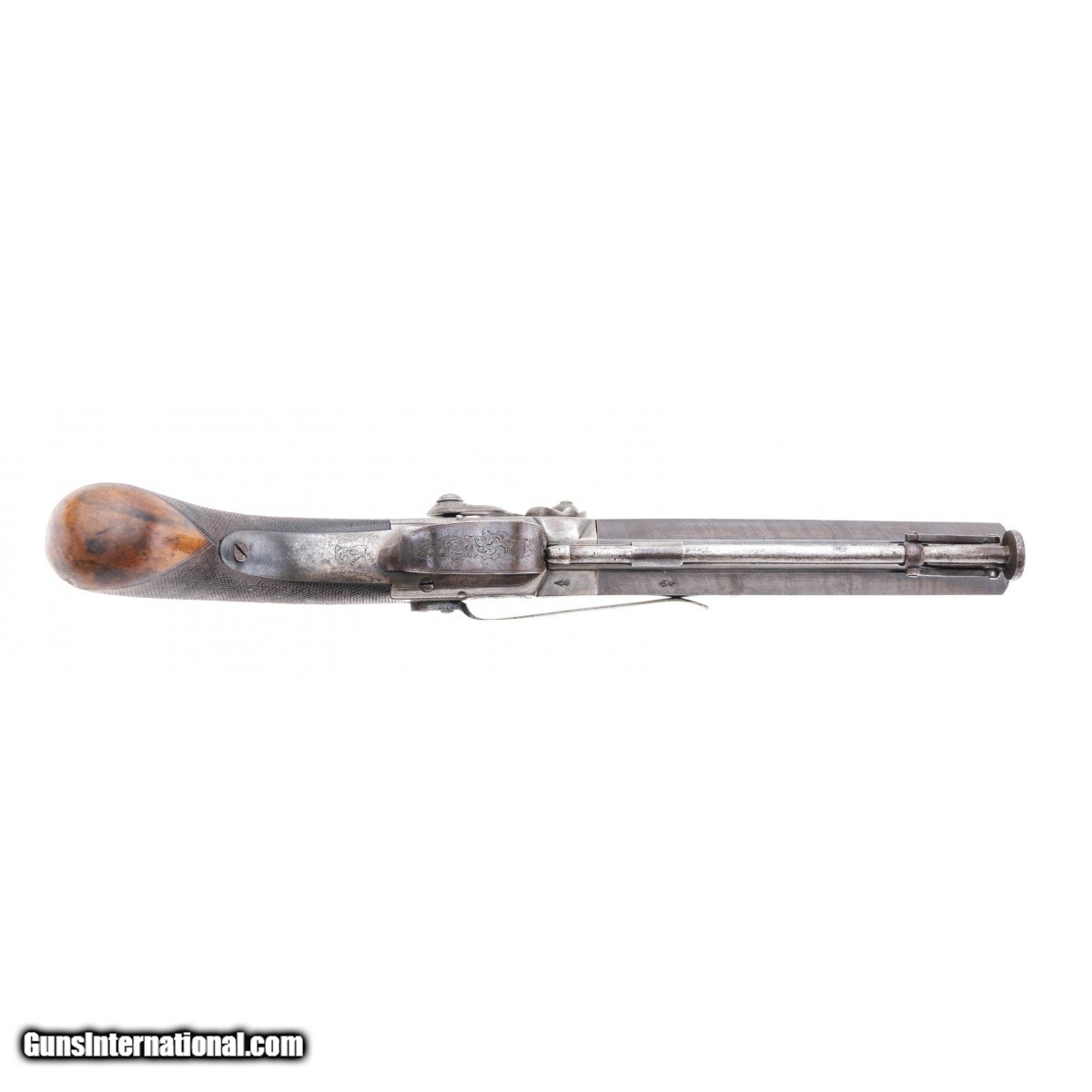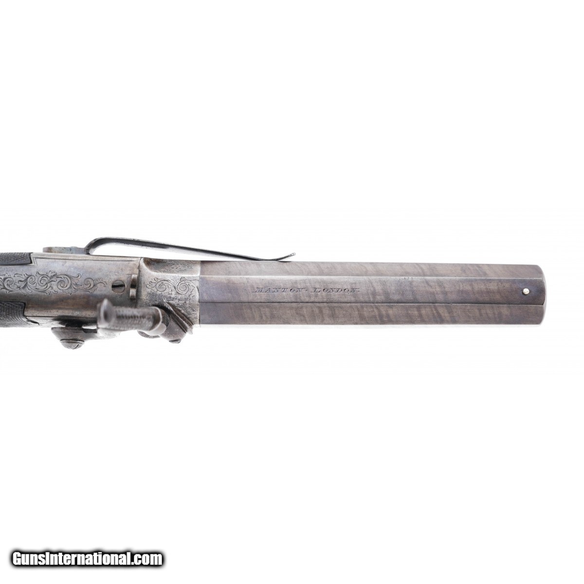 Top of barre flat is marked ""Manton London"". Barrel is octagonal and has a fine Damascus pattern. The bore is .65 caliber. Overall length is 11"". Pistol has a captive ramrod and a belt hook. The frame is engraved in a floral scroll motif as is the trigger guard bow. Stock is finely checkered. Action works properly. Manufactured approximately in the 1820's-1830's. Very fine craftmanship that any collector would be proud to own!