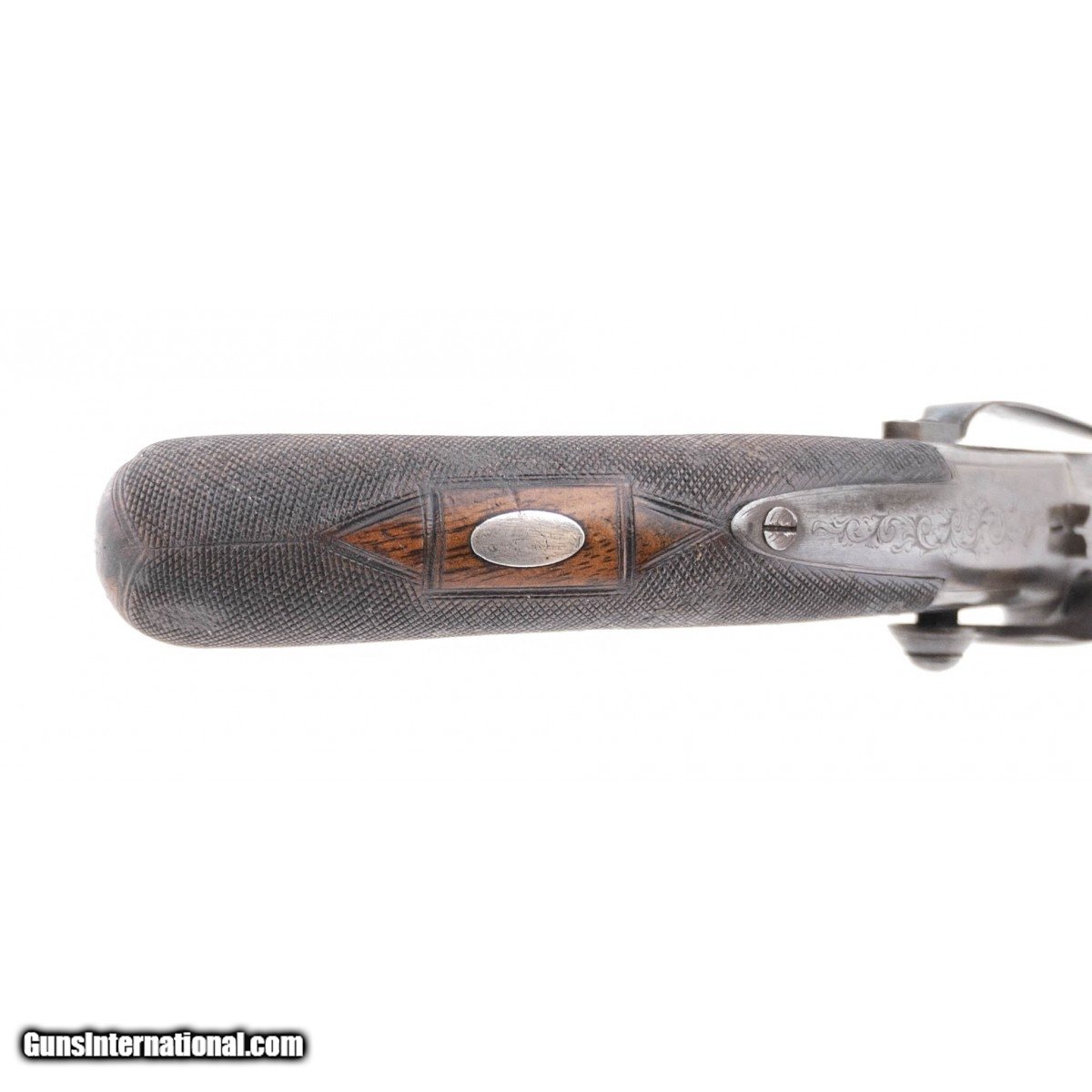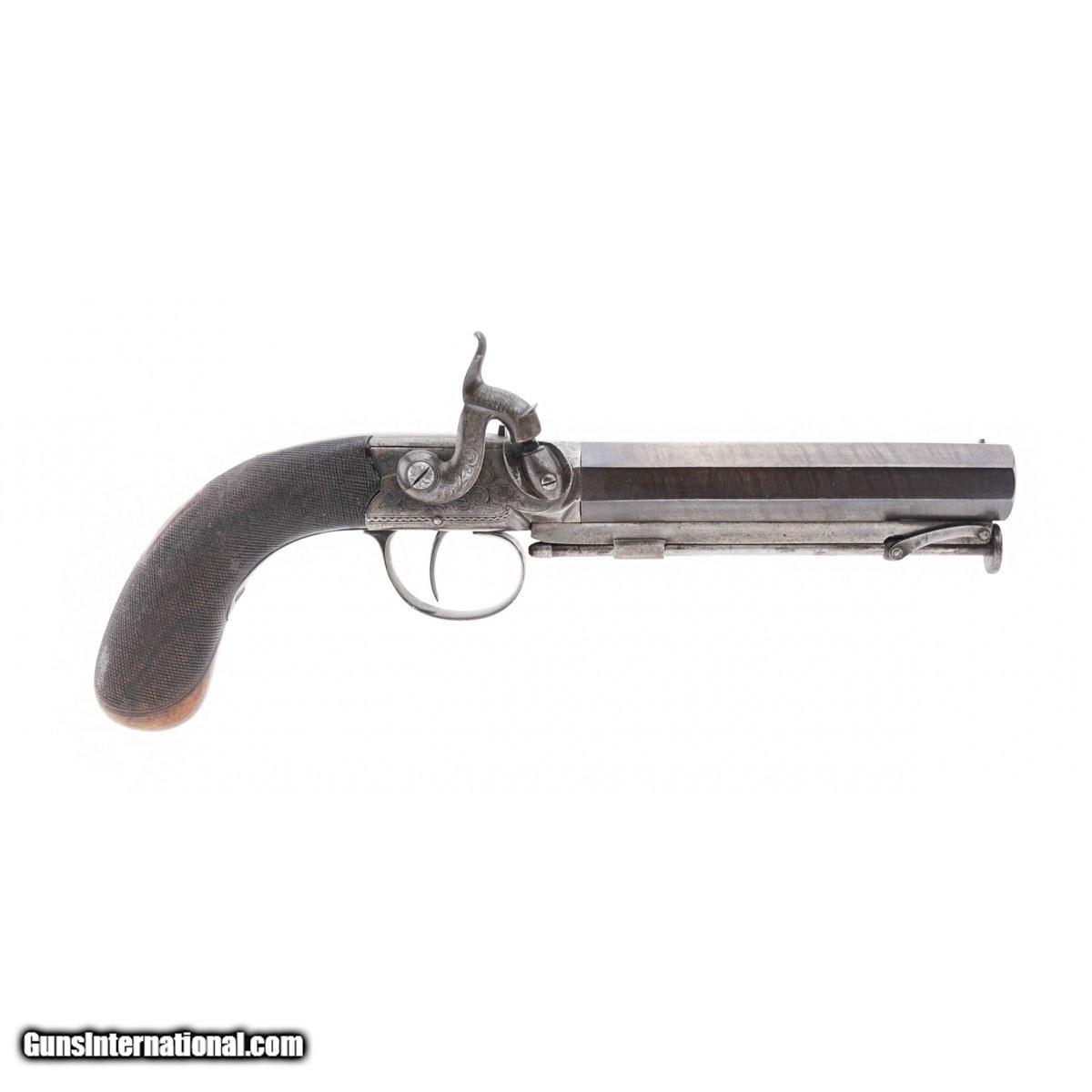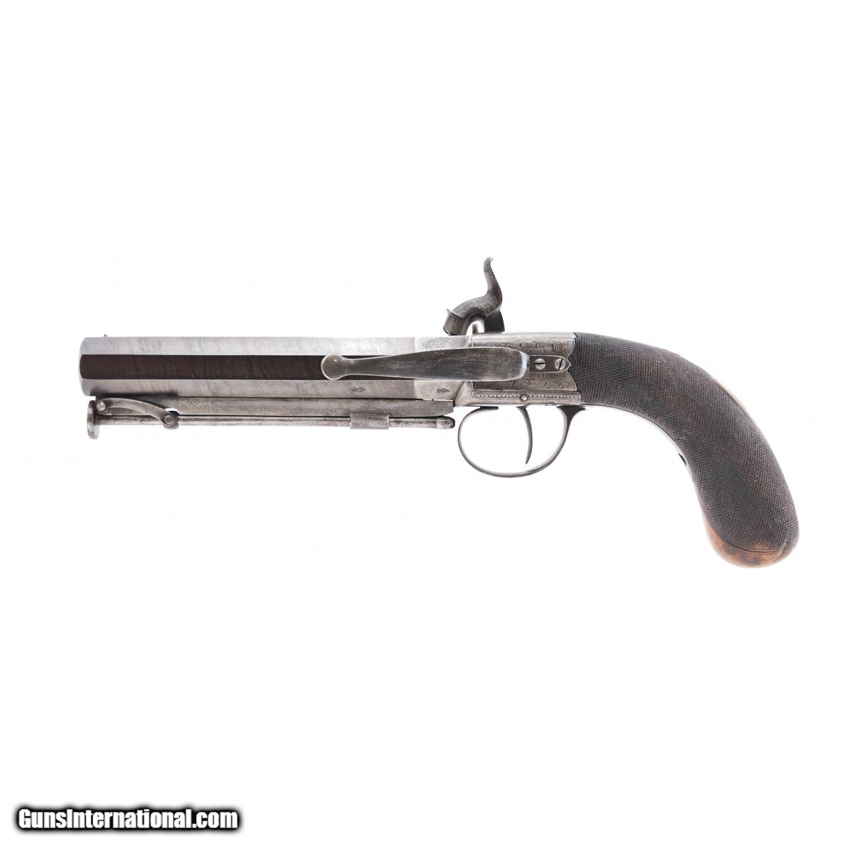 Top of barre flat is marked ""Manton London"". Barrel is octagonal and has a fine Damascus pattern. The bore is .65 caliber. Overall length is 11"". Pistol has a captive ramrod and a belt hook. The frame is engraved in a floral scroll motif as is the trigger guard bow. Stock is finely checkered. Action works properly. Manufactured approximately in the 1820's-1830's. Very fine craftmanship that any collector would be proud to own!