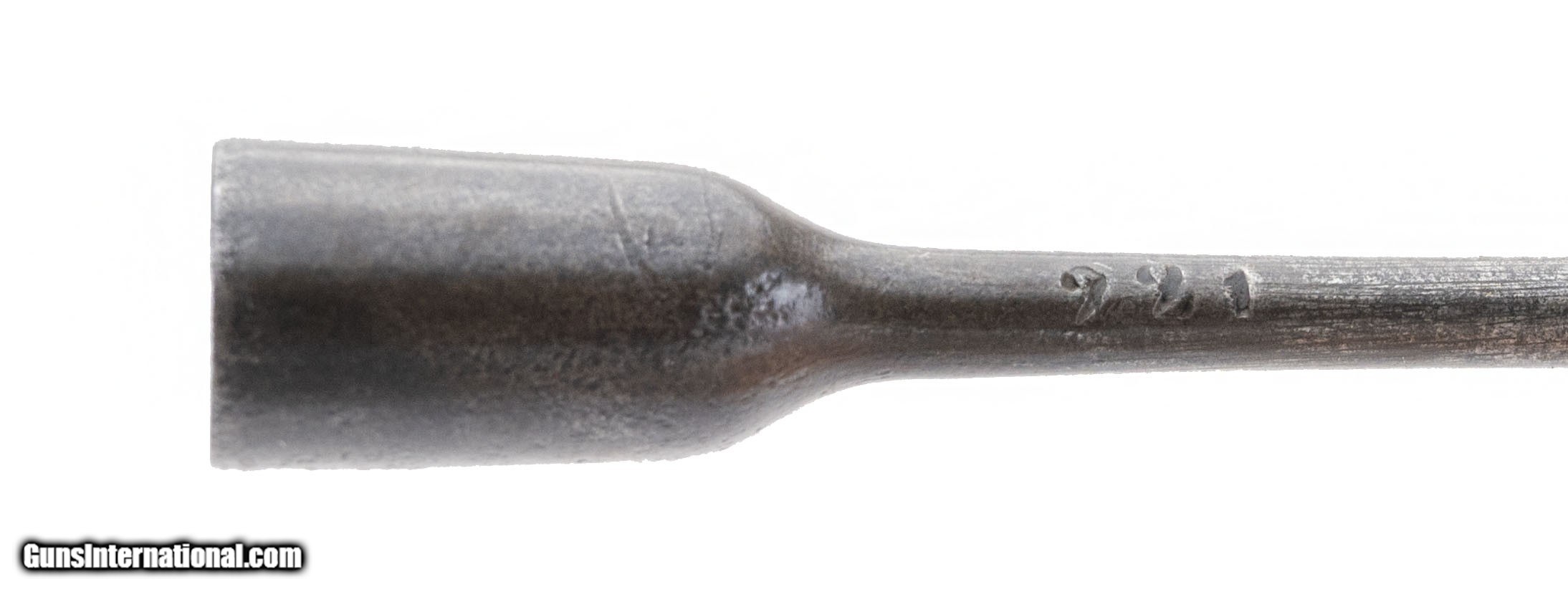Description: "This French Model 1822 pistol was originally a flintlock. It was later altered to percussion and rifled. The overall length is approx. 14"". The 7.75"" round 69 caliber barrel has a fair bore with moderate pitting and barely visible rifling. The barrel is numbered 4821 forward of the bolster. It features a round post front sight and notched block rear sight. The all metal has a brown patina with the barrel having light pitting from the bolster to the band. The St. Etienne lock markings are barely visible. The barrel tang marking of Mle 182 is readable with the remainder visible but not readable. The brass band, side plate, trigger guard, and butt cap have an even aged patina. The stock is good with a small chip at the front of the lock, age cracks in the grip and to the rear of the lock, vertical stamping of ST ETIENNE followed by TULLE (most likely where it was altered to percussion) followed by 221 followed by a D on the left flat The ramrod is also stamped 221. The swivel ring is present. With the exception that the hammer can be released by a trigger pull at half cock, the action functions correctly. This is a basic French martial pistol. Antique: Yes Price: $750.00 Contact Seller |