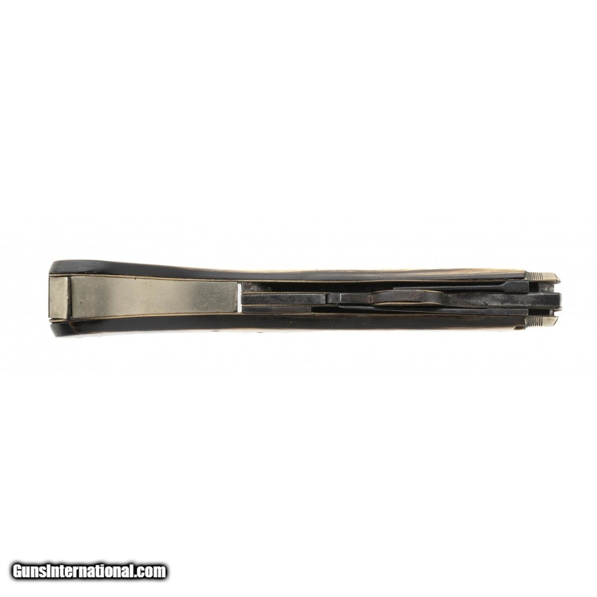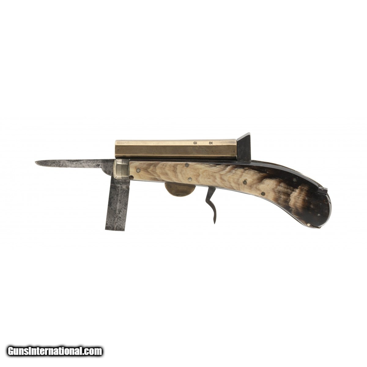 Description: "Made circa 1860s. Very fine example with very fine grips and an very good barrel. This is a knife pistol with two blades. One of the blade has been shortened. Action works well. The tweezers are still present. Very fine example! SOLD Antique: Yes |