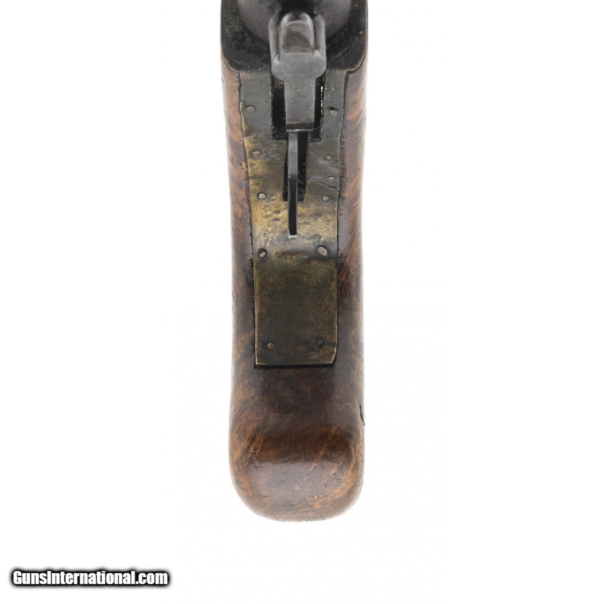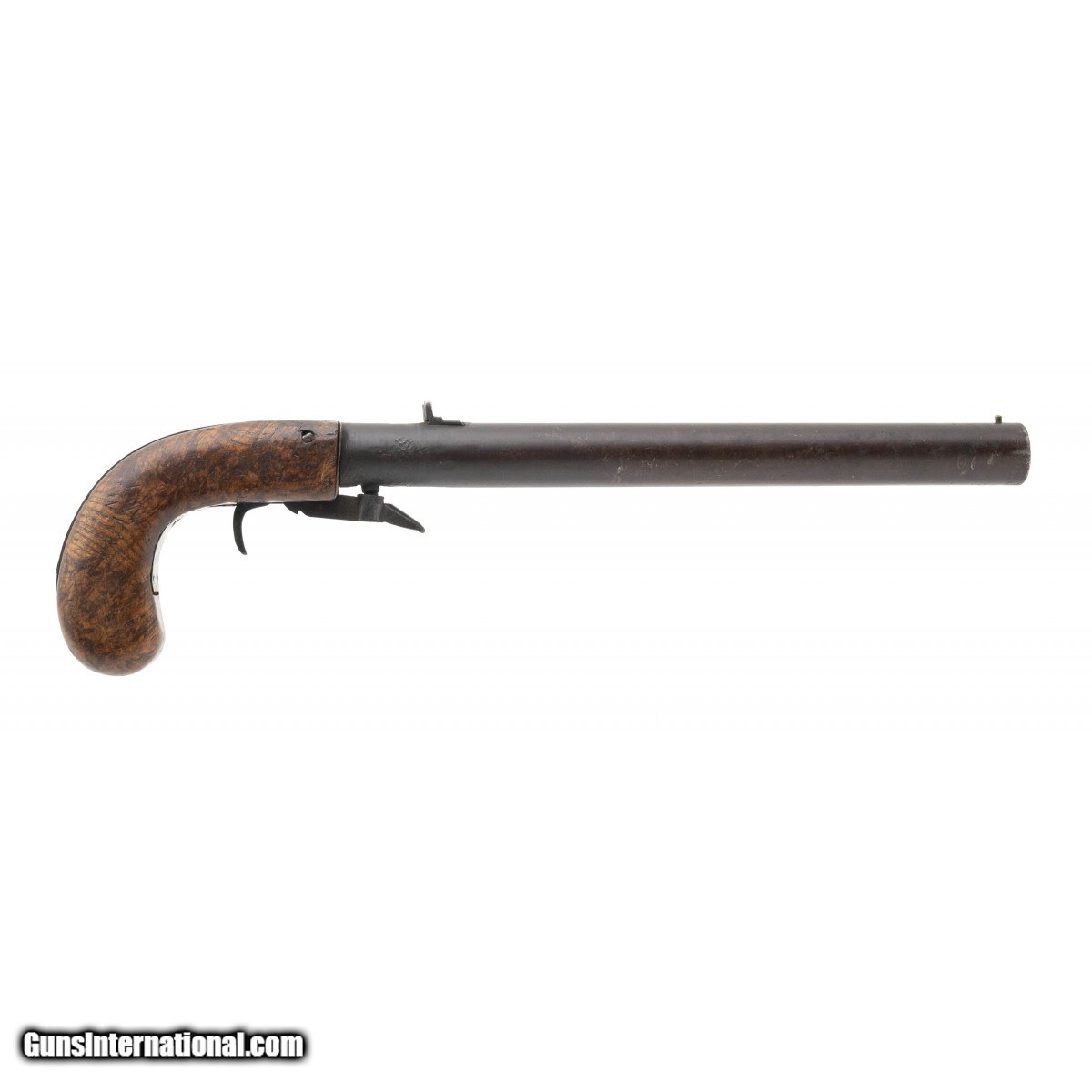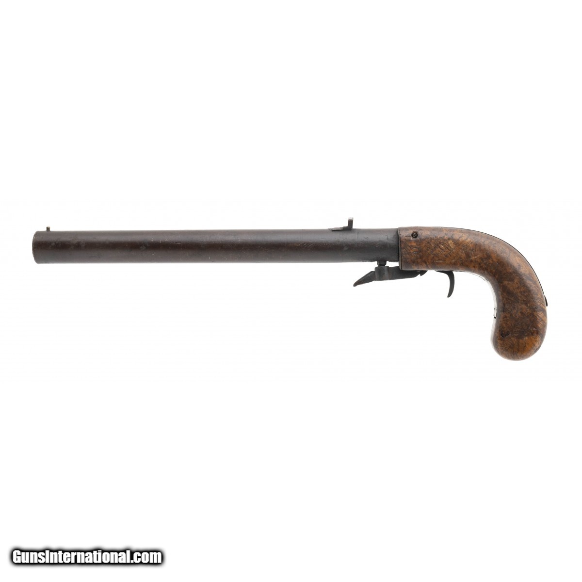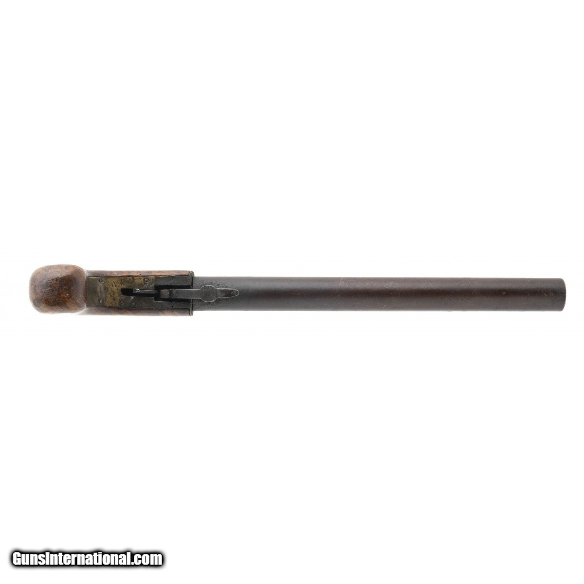 Description: " SN: None. Single shot underhammer pistol with 9.25"" barrel. The rifling is is good, the stock is very good. The hammer holds full cock. The pistol has no visible markings. The metal is an even brown patina. SOLD Antique: Yes |