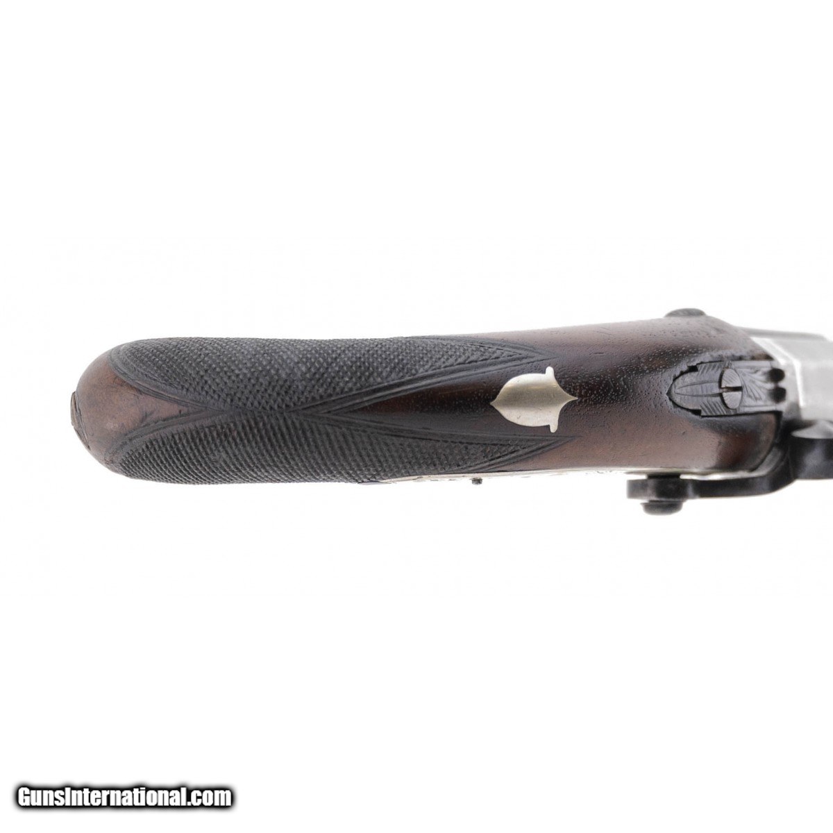 Description: " English percussion pistol by Richardson of London. Barrel is 5.5"" and is marked ""London"" on flat. Bore is approximately .45 caliber. Pistol is very attractive with German silver mounts. The lock plate and trigger guard bow are engraved in a flowing fronds. The stock is very good with no cracks or chips. The bottom of the stock at the butt has a small trap for percussion caps. A fine example of a coat pistol for self defense. AUSTIN LOCATION. SOLD |
