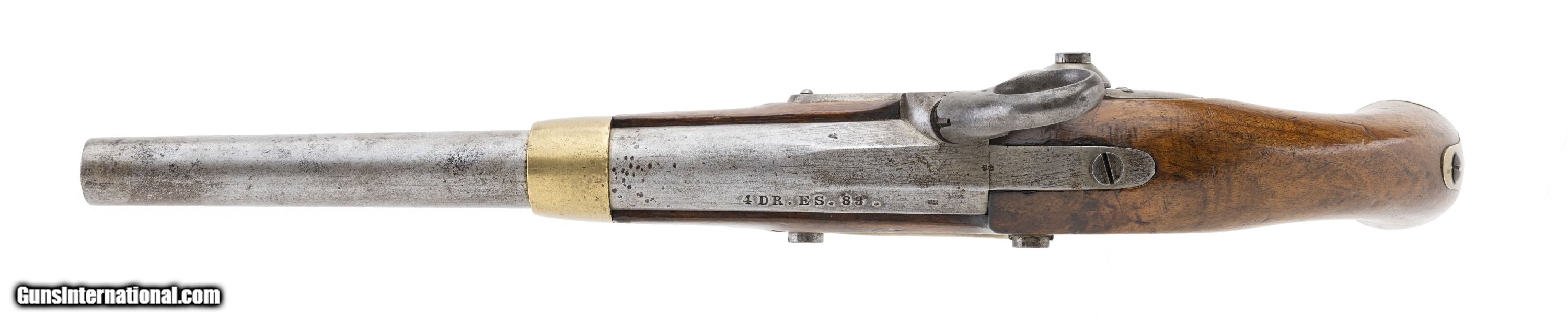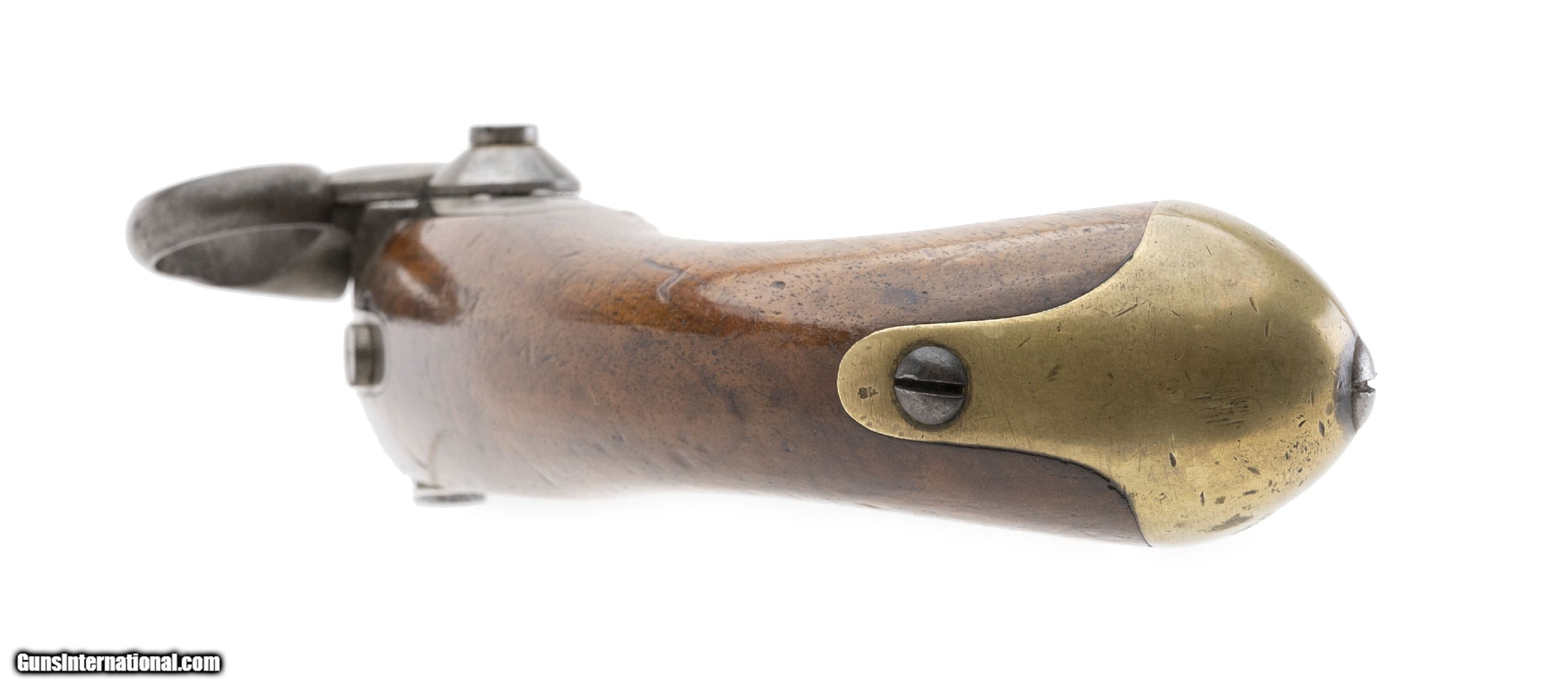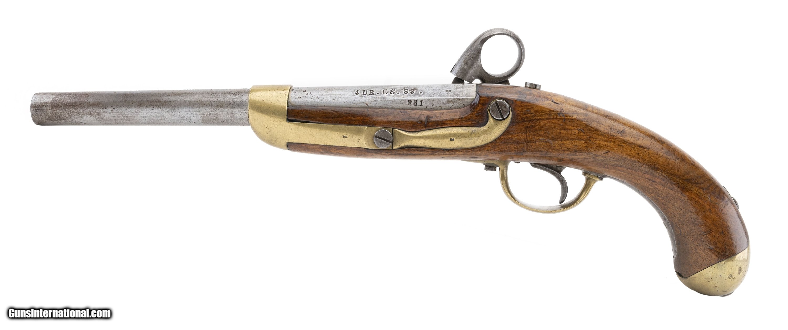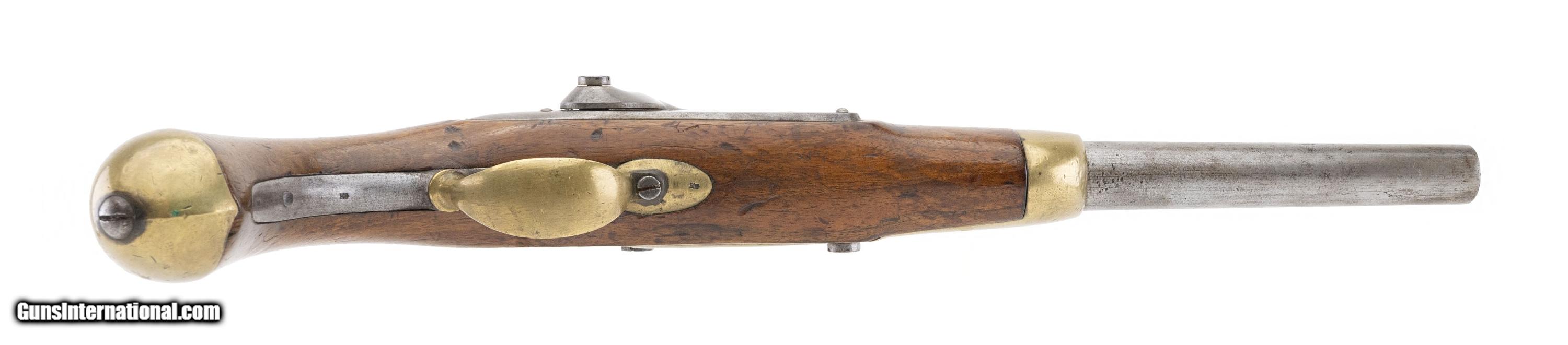 Description: "This is a nicely unit-marked Danish 14 bore (69 caliber) Model 1849 ring hammer percussion service pistol. The overall length is approx. 17.25"". The approx. 10.75"" round smooth bore barrel has a fine mostly bright bore with no roughness. It is marked on the left toward the breech 4 DR. (4th Dragoons?) ES.83. with 881 (most likely the serial number) below. The right side has two small proof marks, a crown over GM and a crown over M. All the metal is bright with areas of light staining. The lock has a crown over M over 49 and the bolster and ring hammer each have what appears to be crown over M inspection stamps. The brass nose cap trigger guard, butt cap, and side plate have a smooth even patina. Each has a small inspection mark. The stock is good with an added coat of finish, light issue dents and dings, a small chip along the nose cap tang toward the side plate, and the barely visible traces of a rondel stamp on the left flat. The action functions correctly. This is a very nice looking Danish Model 1849 ring hammer service pistol. The unit markings make it even more interesting. If you collect ring hammer pistols, Danish pistols, or European percussion military pistols, this pistol is a must for your collection. Antique: Yes Price: $1,995.00 Contact Seller |