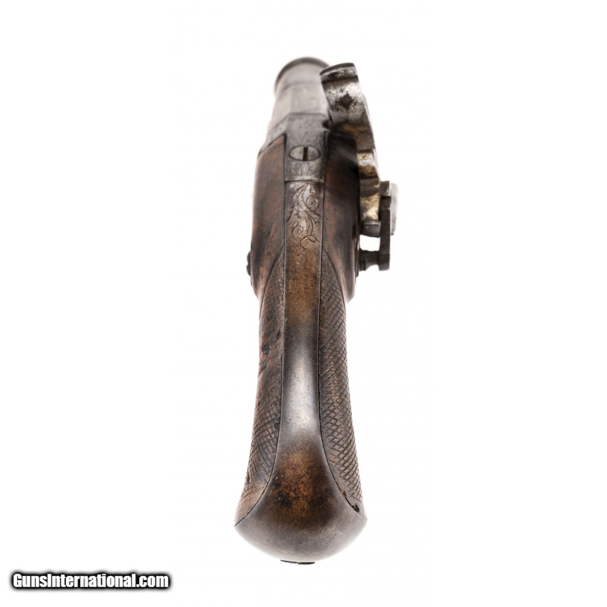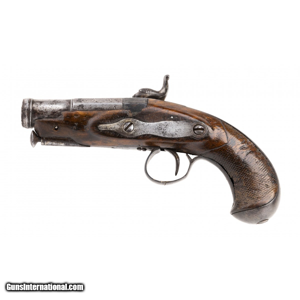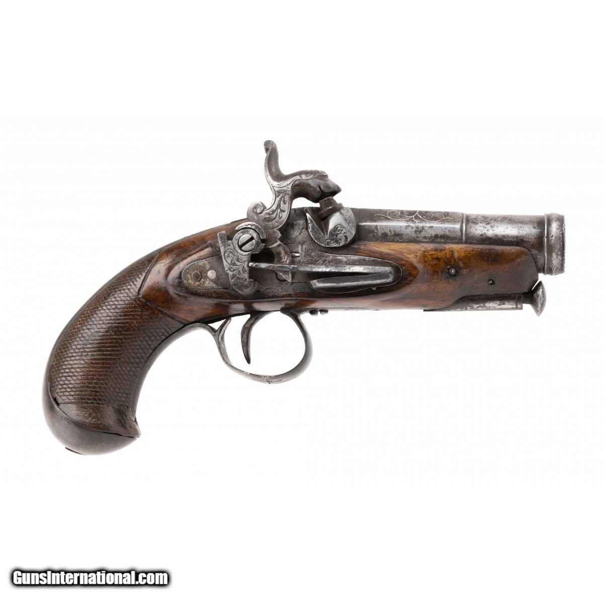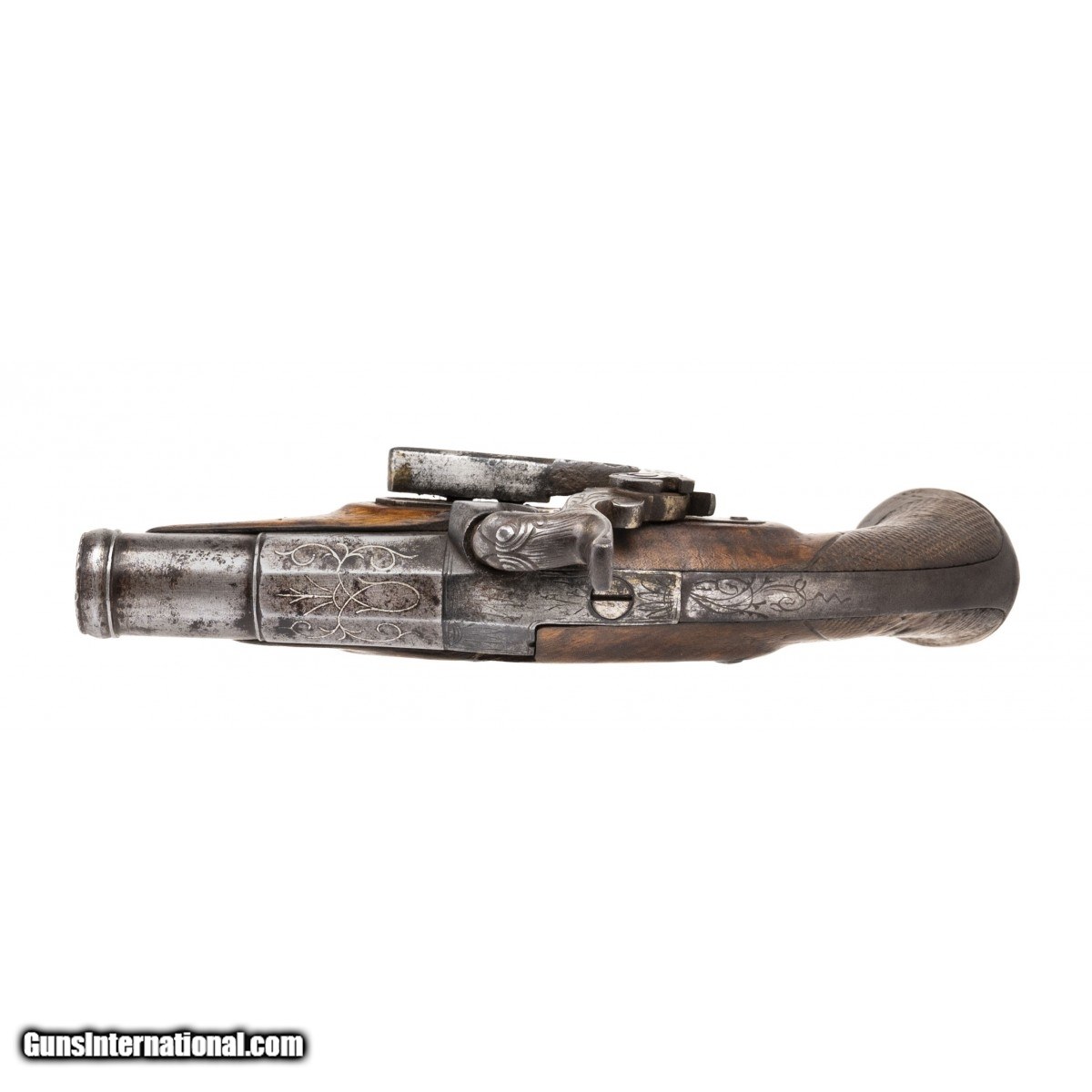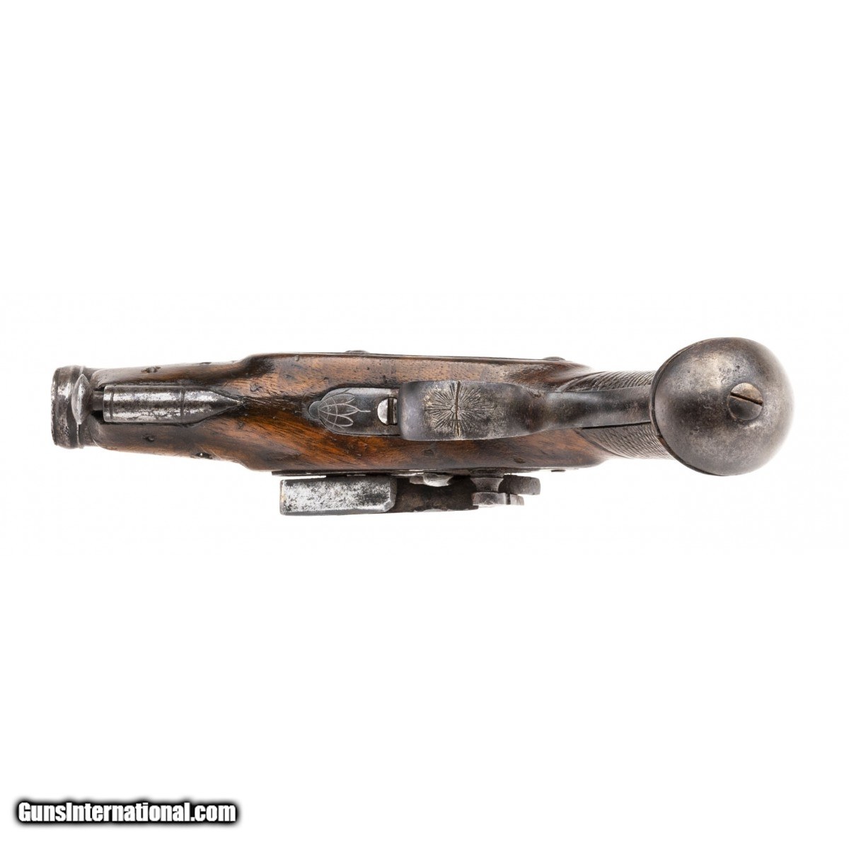 Spanish Flintlock pistol with a 2.5"" two stage barrel. There are silver inlays on octagonal portion of the barrel. The front stage of the barrel has a cannon muzzle. The Cock is in the form of a dogs head with floral engraving on the neck. The trigger guard bow has an engraved sunburst. The stock retains 90% of old varnish and the grip checkering is very good on the right side with some dents on the left side. Has original steel ramrod. The backstrap has has floral engraving en suite with the barrel. Very well made miguelet in very good condition. Circa 1725-1750.