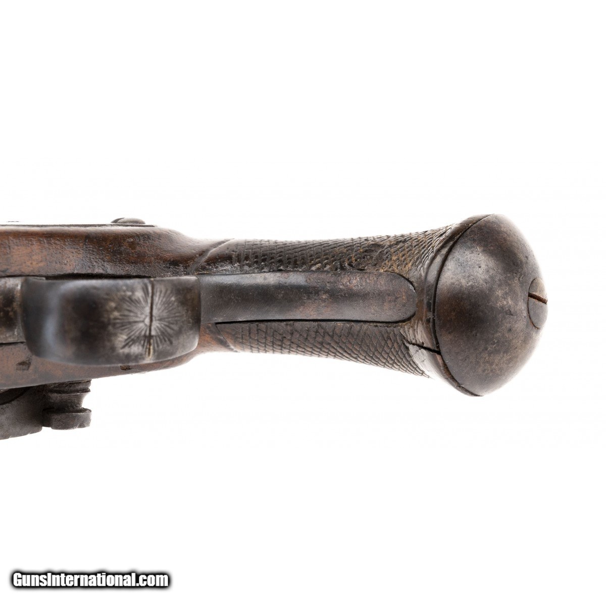 Description: " Spanish Flintlock pistol with a 2.5"" two stage barrel. There are silver inlays on octagonal portion of the barrel. The front stage of the barrel has a cannon muzzle. The Cock is in the form of a dogs head with floral engraving on the neck. The trigger guard bow has an engraved sunburst. The stock retains 90% of old varnish and the grip checkering is very good on the right side with some dents on the left side. Has original steel ramrod. The backstrap has has floral engraving en suite with the barrel. Very well made miguelet in very good condition. Circa 1725-1750. SOLD Antique: Yes |