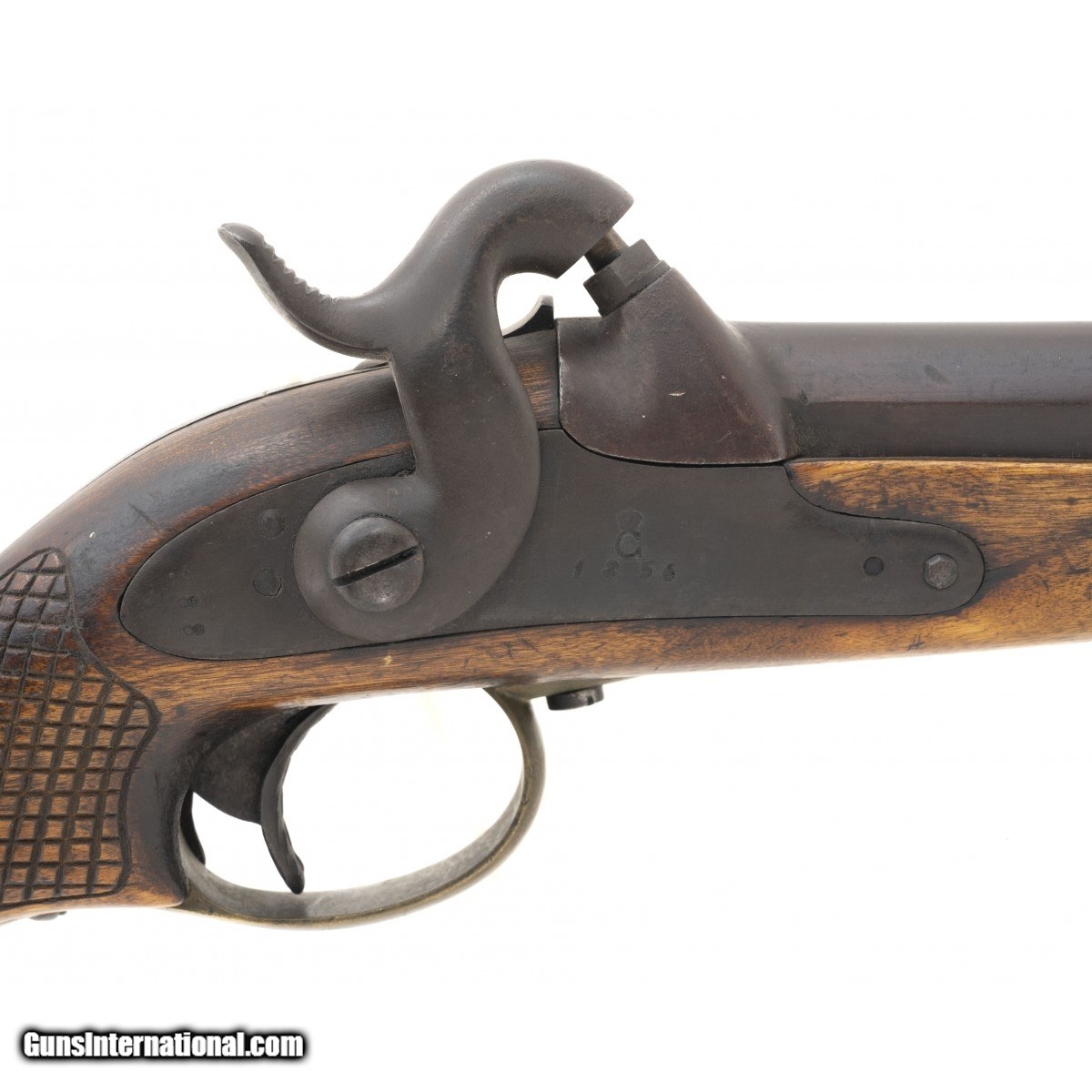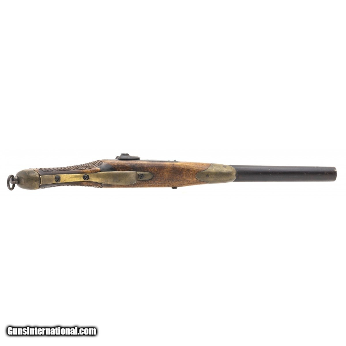 Description: " The Swedish Model 1850 smooth bore percussion ""flankor-psitol"" has an overall length of approx. 18"". It has provisions for a shoulder stock. The approx. 11.5"" round 77 caliber barrel has a good bore with darkness and very light roughness. All the metal has a smooth brown patina. The barrel is serial numbered, 788, on the left, is stamped WF WN to the left of the bolster, and has a crown over C inspection stamp at the top rear. The serial number is repeated on the barrel tang, stock, lock, and butt cap. The lock has a crown over C over 1856 in the center and the serial number at the tail. The brass butt cap, nose cap, and trigger guard have an even aged patina. The stock is very good with a nicely checkered grip, the serial number over small WF WN over 1856 on the left flat, and no chips or cracks. The butt swivel and ring are present. The action functions correctly. This is a very nice example of a scarce Swedish Model 1850 pistol. SOLD Antique: Yes |