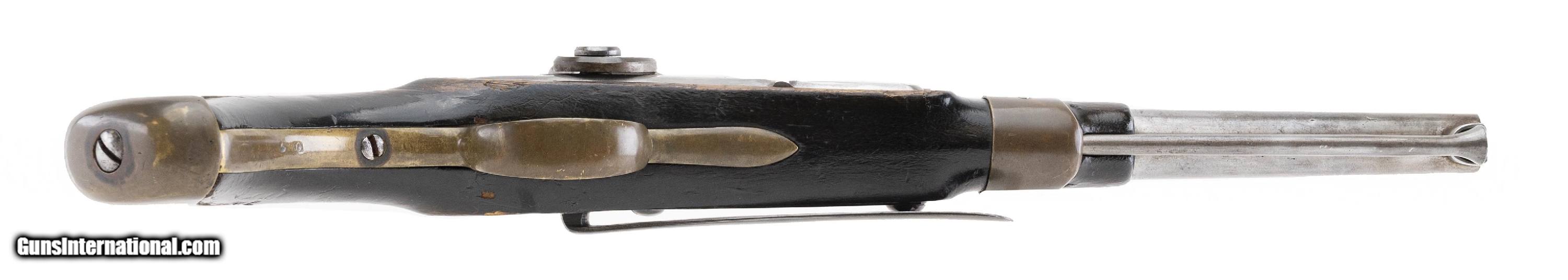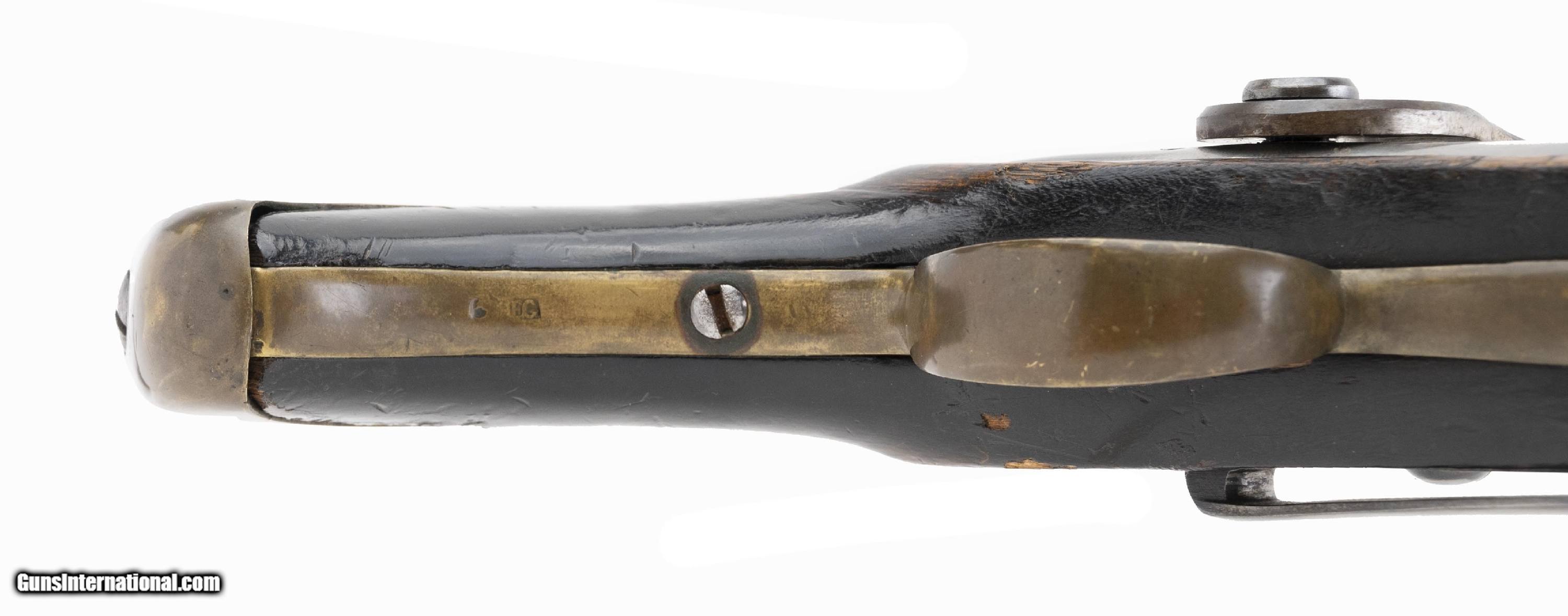 Description: "This Swedish Navy belt hook percussion pistol is an alteration of an earlier Swedish flintlock Naval pistol to percussion. It is similar to the Swedish Model 1845 Navy pistol. The overall length is approx. 16.75"". The approx. 9.5"" octagon to round 63 caliber smooth bore barrel has a fine bore with some roughness toward the chamber. There is a wedding band approx. 4.25"" from the muzzle. The barrel has a brass blade front sight. The notched block rear sight is part of the barrel tang. With the exception of a barely discernable inspection sink mark on the lock the barrel and lock are unmarked. It is probable that any other marks were removed by polishing during the alteration to percussion. The metal is bright with very light staining. The brass band, trigger guard, and butt cap have an even aged patina. The iron belt hook is 5.25"" long. The stock, which appears to be dark-stained birch, is very good with the dents and dings expected of an issue naval weapon but with no cracks or chips. The stock backstrap has provisions for the attachment of a shoulder stock. The action functions properly. Don't miss this one. We have never had another one. Antique: Yes Price: $2,550.00 Contact Seller |