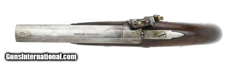 Description: "Tryon .44 Caliber Belt Pistol. Approximately 5 ¾" octagon smooth bore barrel with good bore. Bright metal with light staining. Oval German silver on left with No 21 engraved on it. The stock is fine with no cracks or chips. The barrel is marked “Tryon-Philada". The lock is marked Tryon. The barrel is wedge-fastened. The iron ramrod is held by swivels under the barrel. The action functions correctly. This is a classic example of a well-made and popular belt pistol by Tryon who was a noted Philadelphia maker. Tryon made everything from belt pistols to muskets and rifles. This is a very nice Belt Pistol in excellent condition! SOLD Antique: Yes |