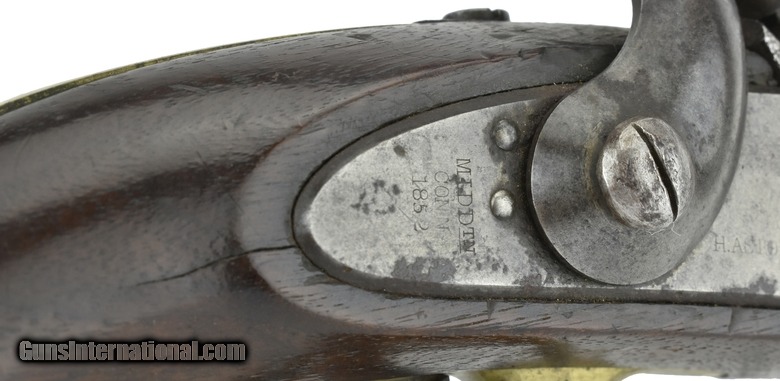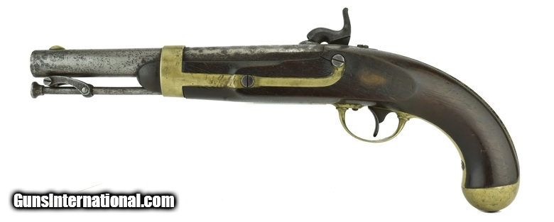 Description: "U.S. Model 1842 Percussion Pistol. U.S. Model 1842 percussion pistol .54 caliber with an 8 ½" barrel. Metal has a grey patina with areas of surface pin prick pitting. Lock plate is dated 1852. Stock is good, crack is noted at the rear of the lock plate and side plate screw. Cartouches are present. Good looking 1842 Percussion pistol. SOLD Antique: Yes |