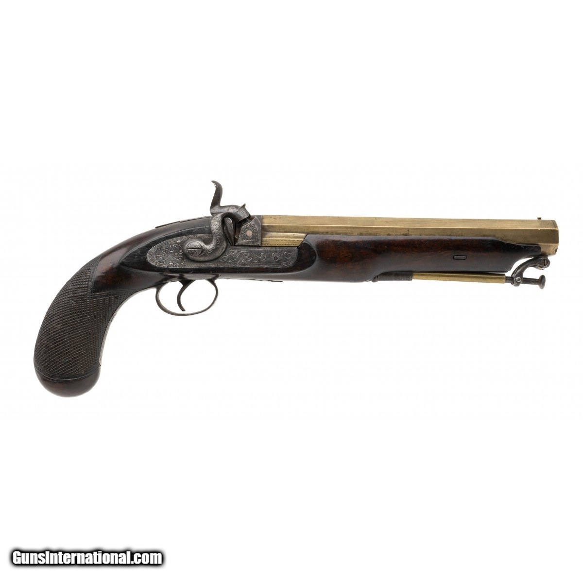 NSN, circa 1840-1860's, .56 caliber, 8"" octagonal brass barrel. Overall very good condition with floral visible on the breech, lock plate, hammer, trigger guard and barrel tang. Wood has light nicks dings and scratches noted, checkering remains sharp and crisp. Action functions correctly. Gorgeous percussion pistol. Consignment.