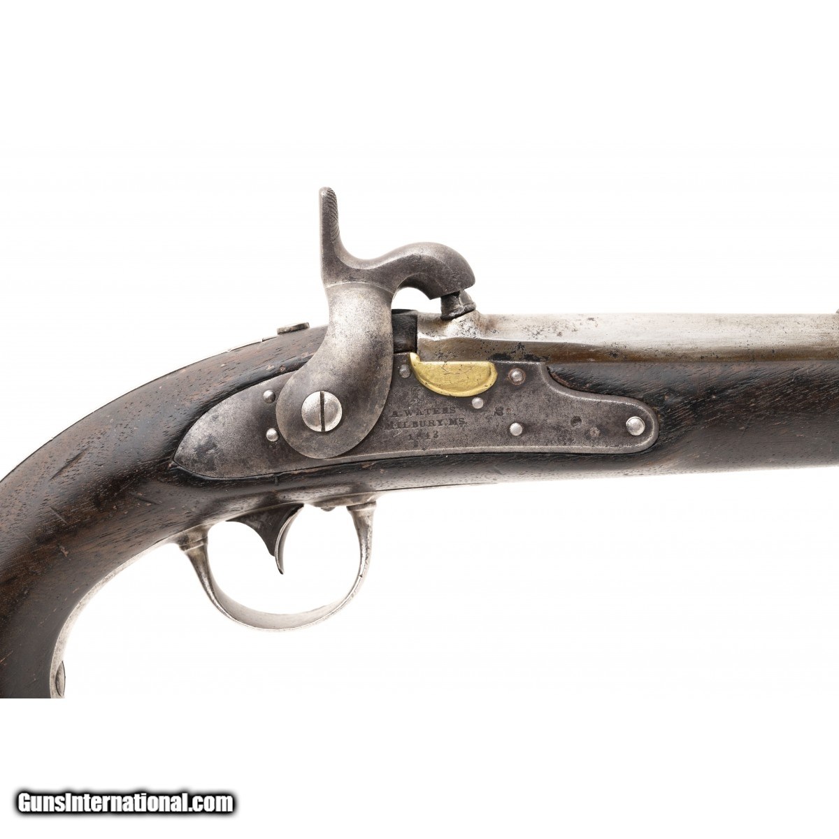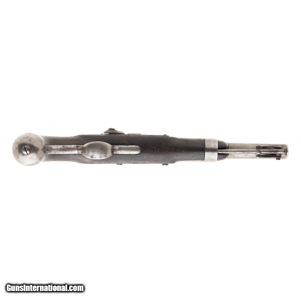 Description: "Dated 1842. 54 caliber with a 8 ½" barrel Metal has been cleaned and has scattered light pitting. Wood shows hard use, but no cracks or chips. This gun has been converted to percussion in a Belgian style. Action works perfect.$995 SOLD Antique: Yes |