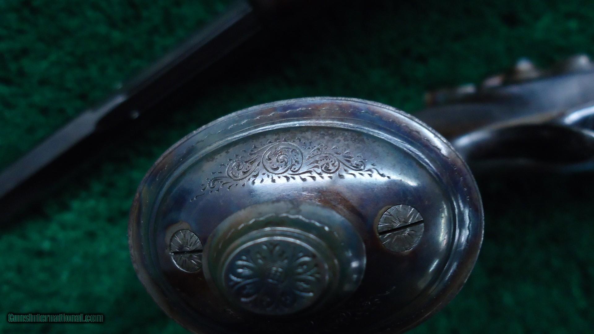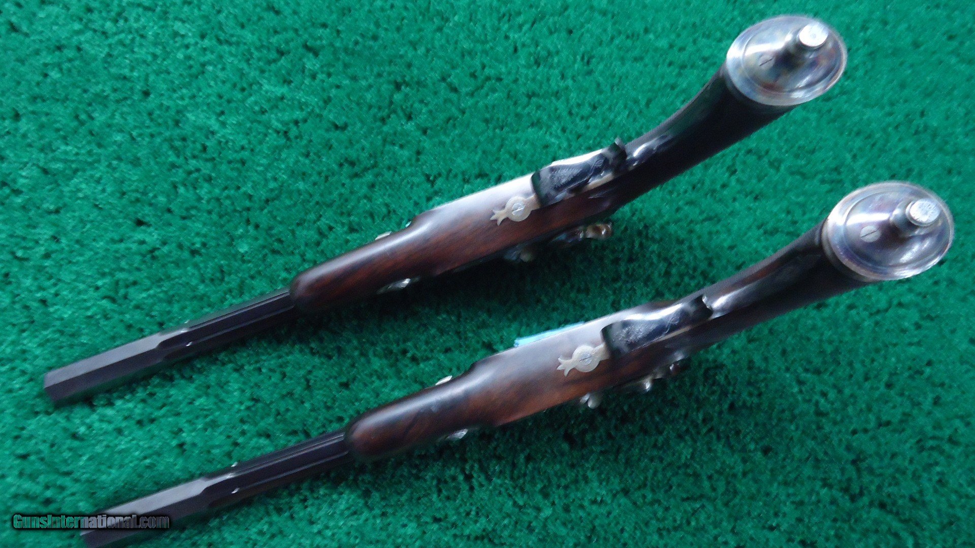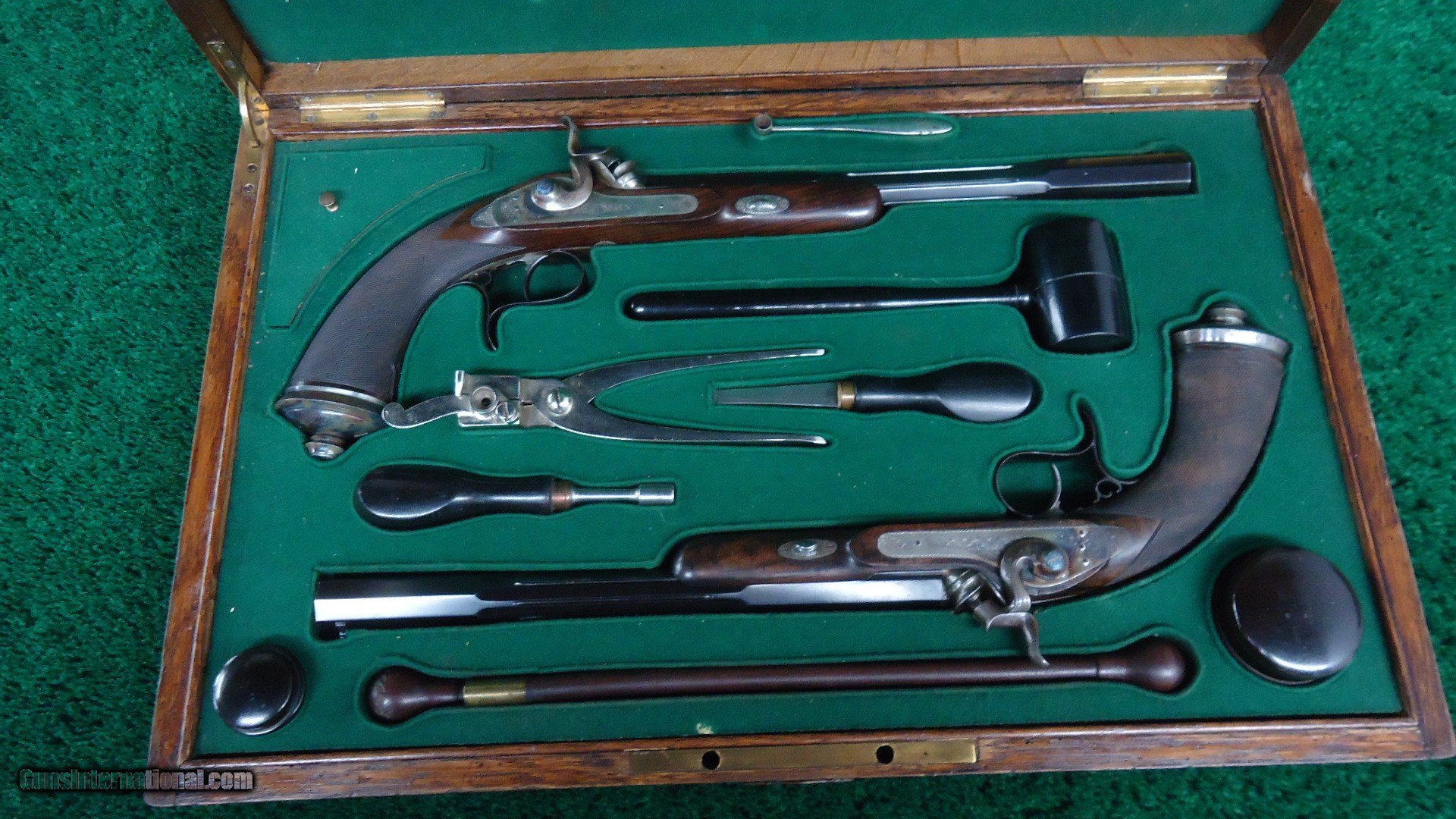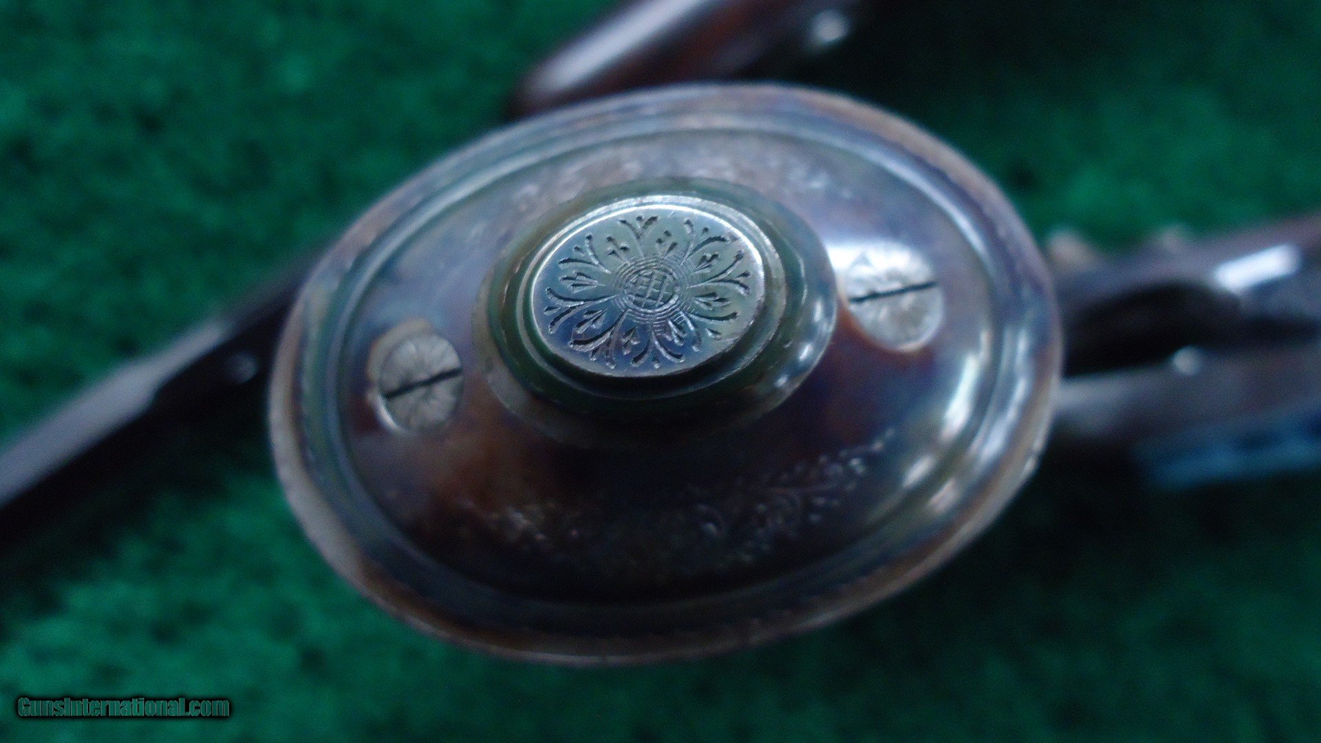 Description: Just an incredible pair of pistols that are as new in condition. Retains all the vivid case color on the lock, hammer and buttplate. Barrel retains all the blue as well. Trigger guards are well sculptured and delicately done. Guns match perfectly. Walnut grips are finely checkered and are in excellent condition with just a few slight handling mars. Mechanics are also excellent on both. These are fitted in a French style case that show only minimal wear. Come with miscellaneous accoutrements. The bullet mold appears to have been refinished. Lining shows only minor wear. There are a few small cracks in the exterior of the case. Leroy Merz Antique Firearms specializes in antique and vintage Winchesters and other fine American firearms. Since 1965 Mr. Merz has taken part in the world of firearms and has been a contributor to many well known reference books. We have hundreds of additional guns in every price range at our home online. Search for Merz Antiques in google. SOLD Curio/Relic: Yes Antique: Yes |